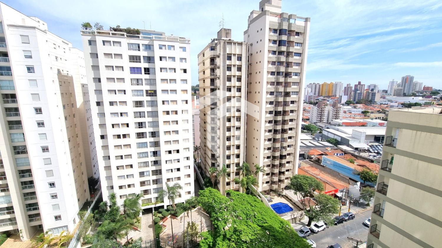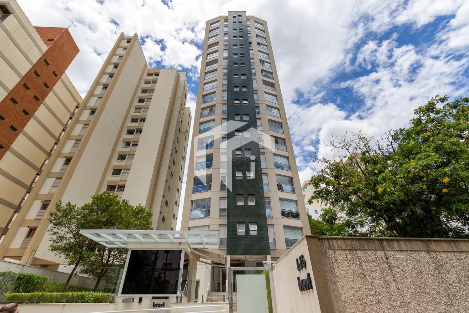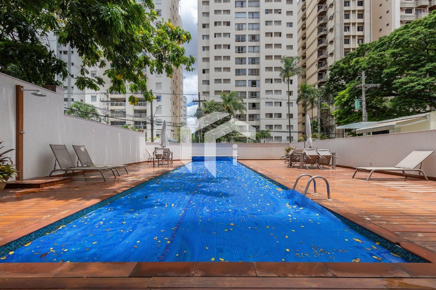 Prédio com piscina, academia e salão de festas.