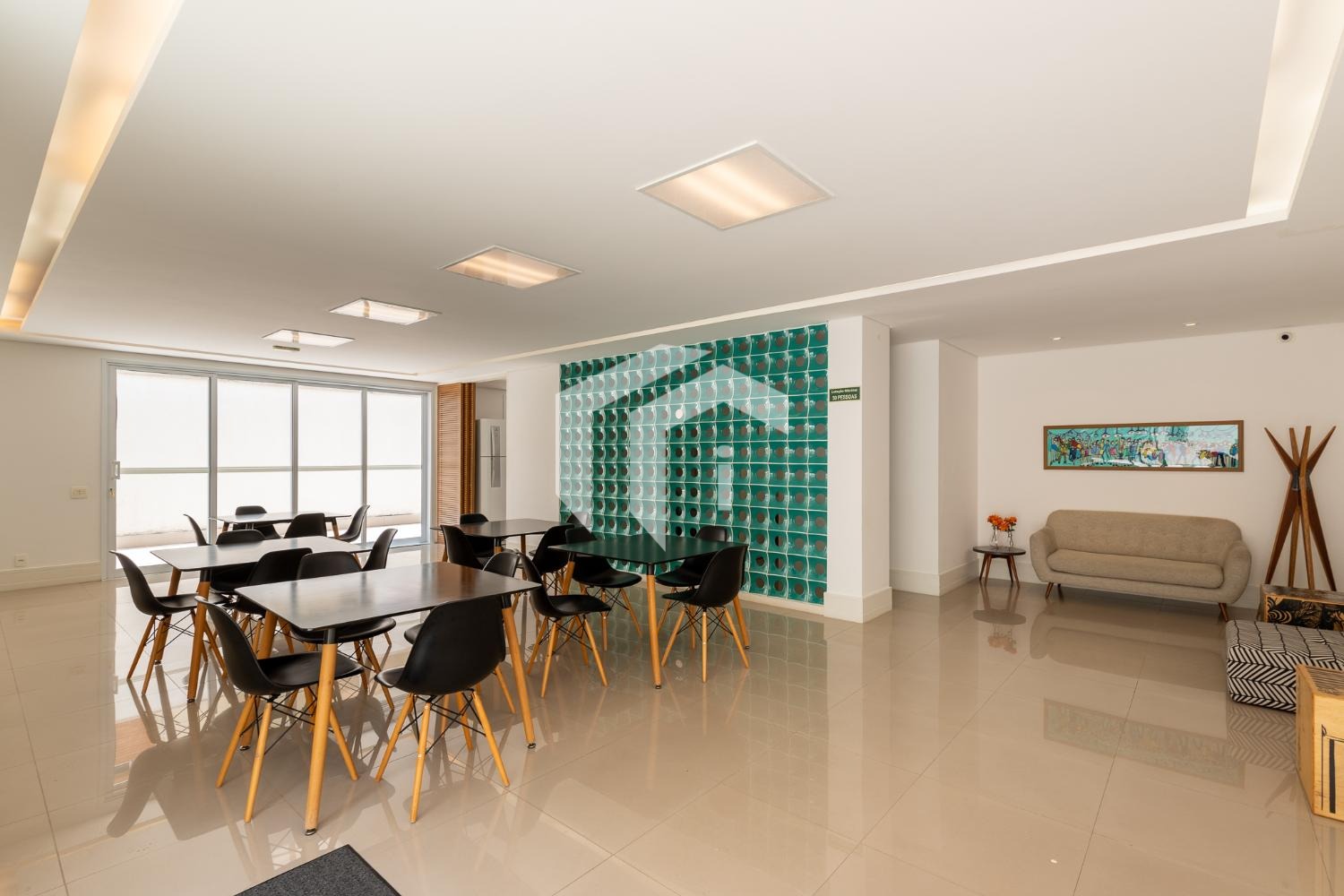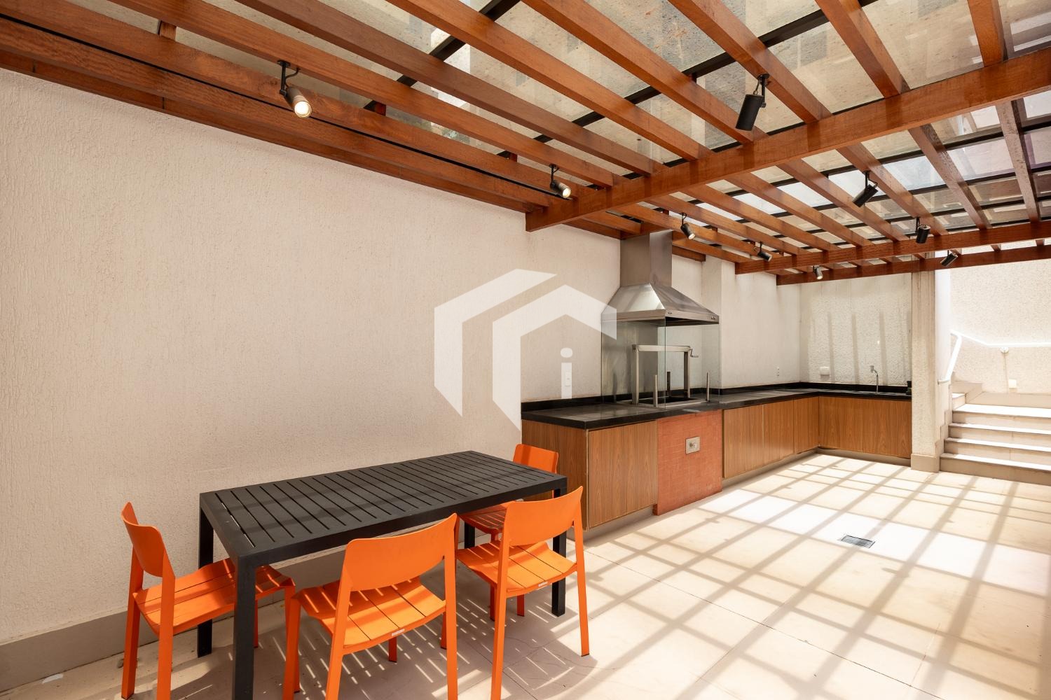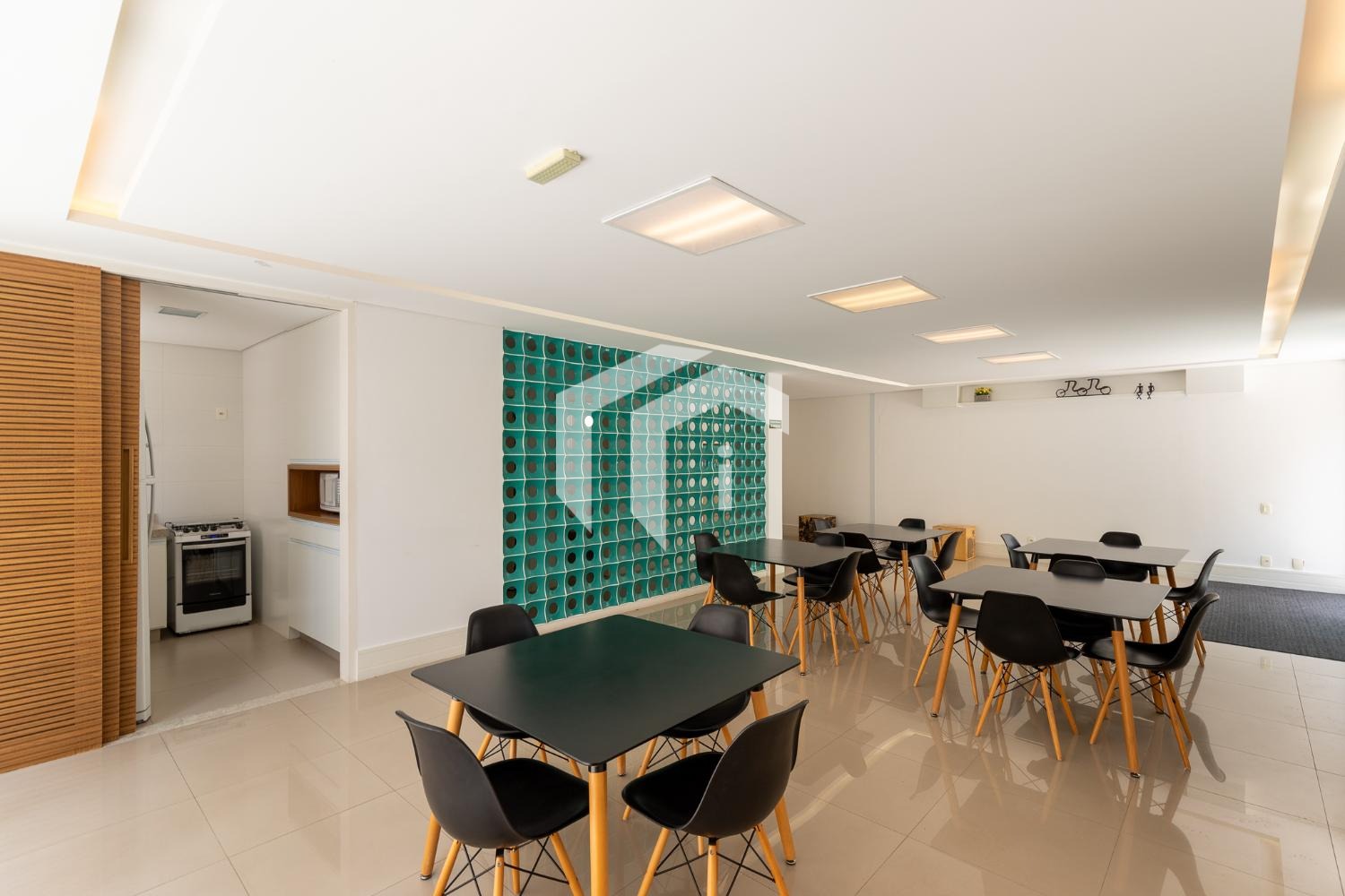 Prédio com piscina, academia e salão de festas.