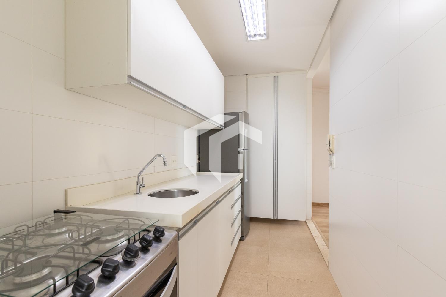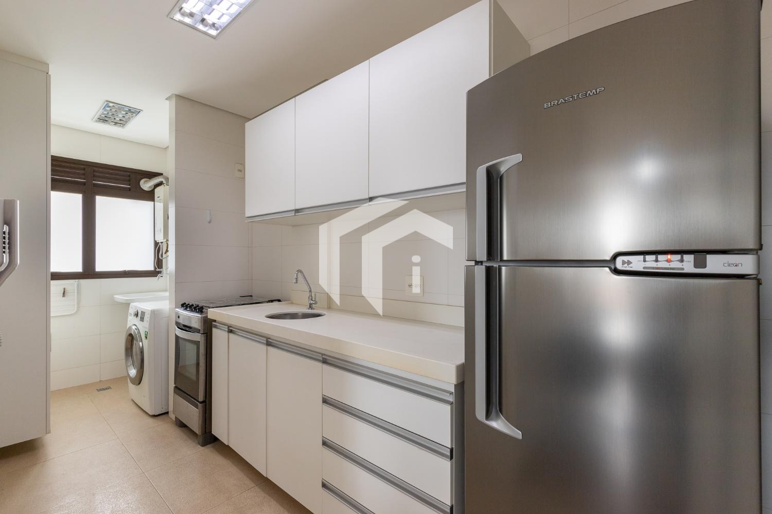 Sua cozinha totalmente planejada e uma área de serviço complementam a praticidade e o conforto deste lar.