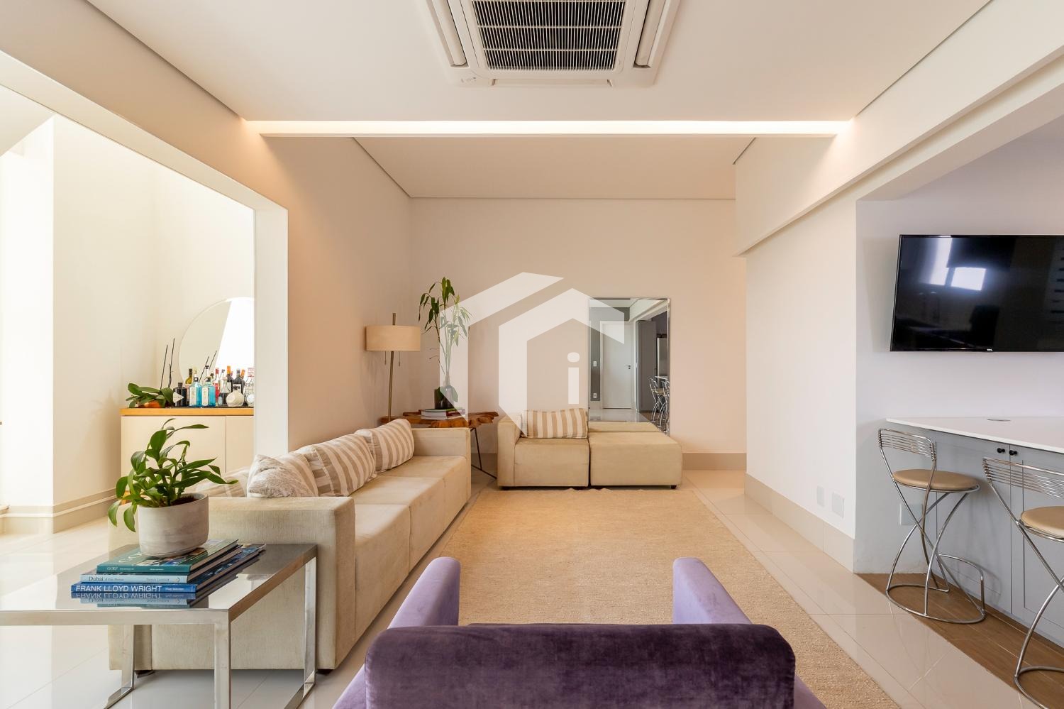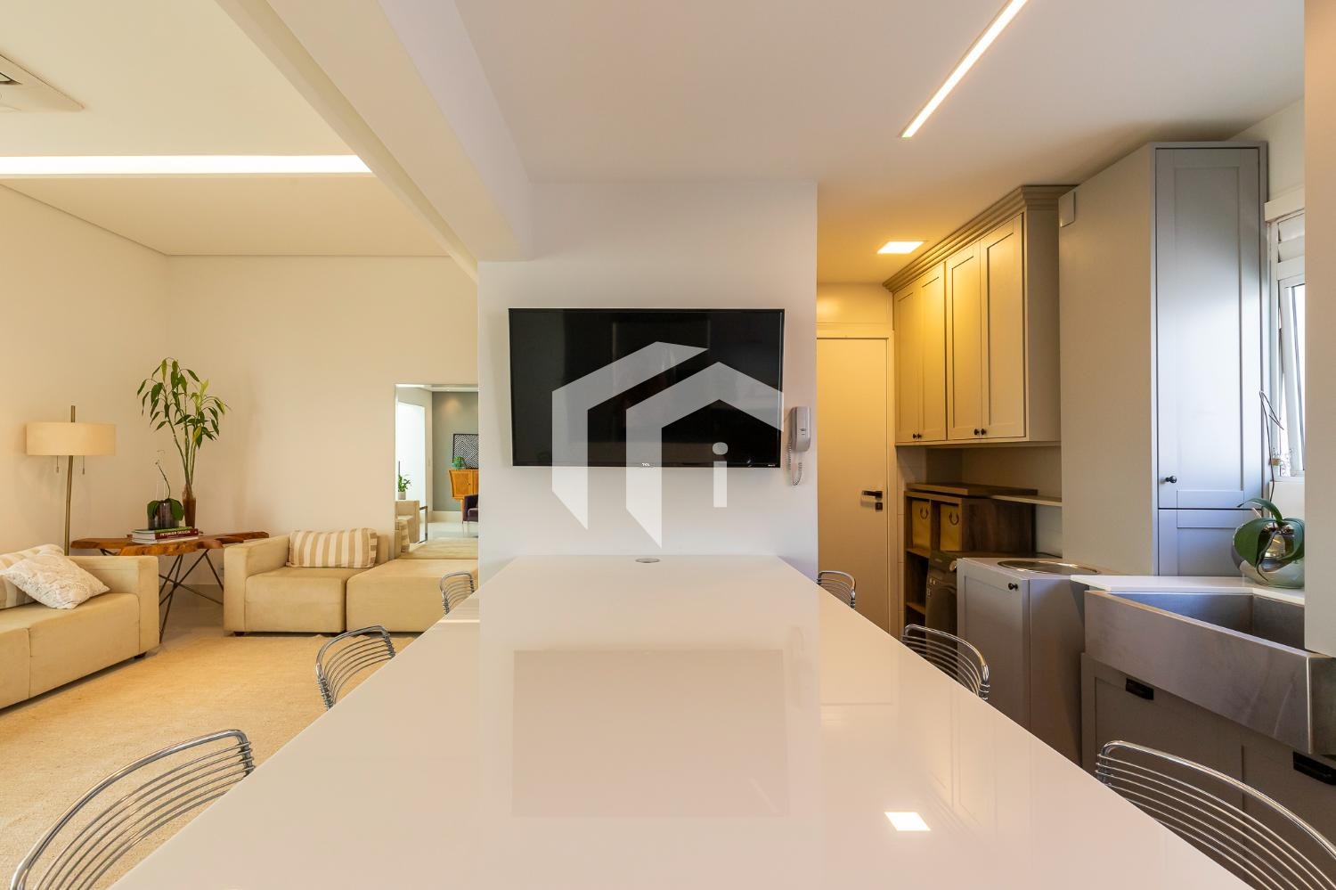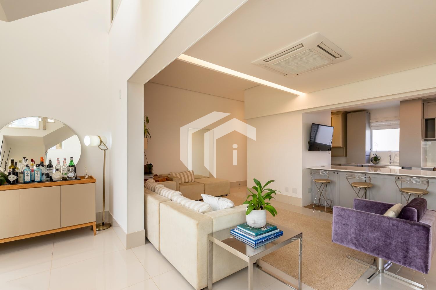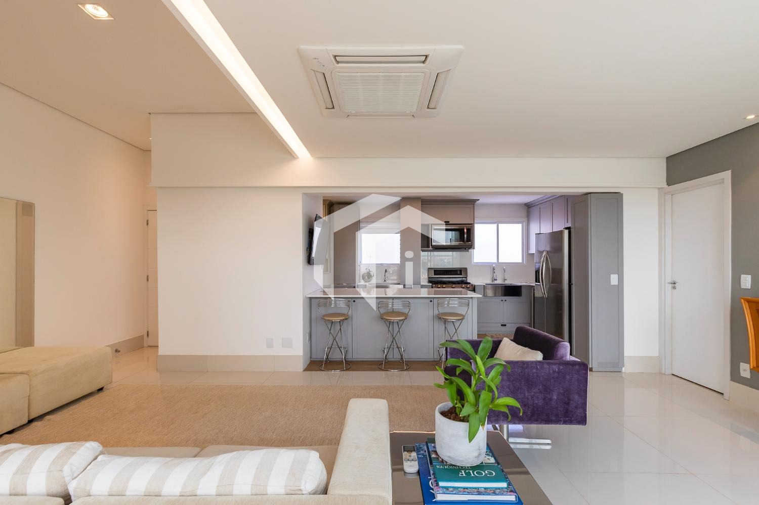 Living climatizado para 3 ambientes com lavabo e totalmente integrado à sofisticada cozinha americana.