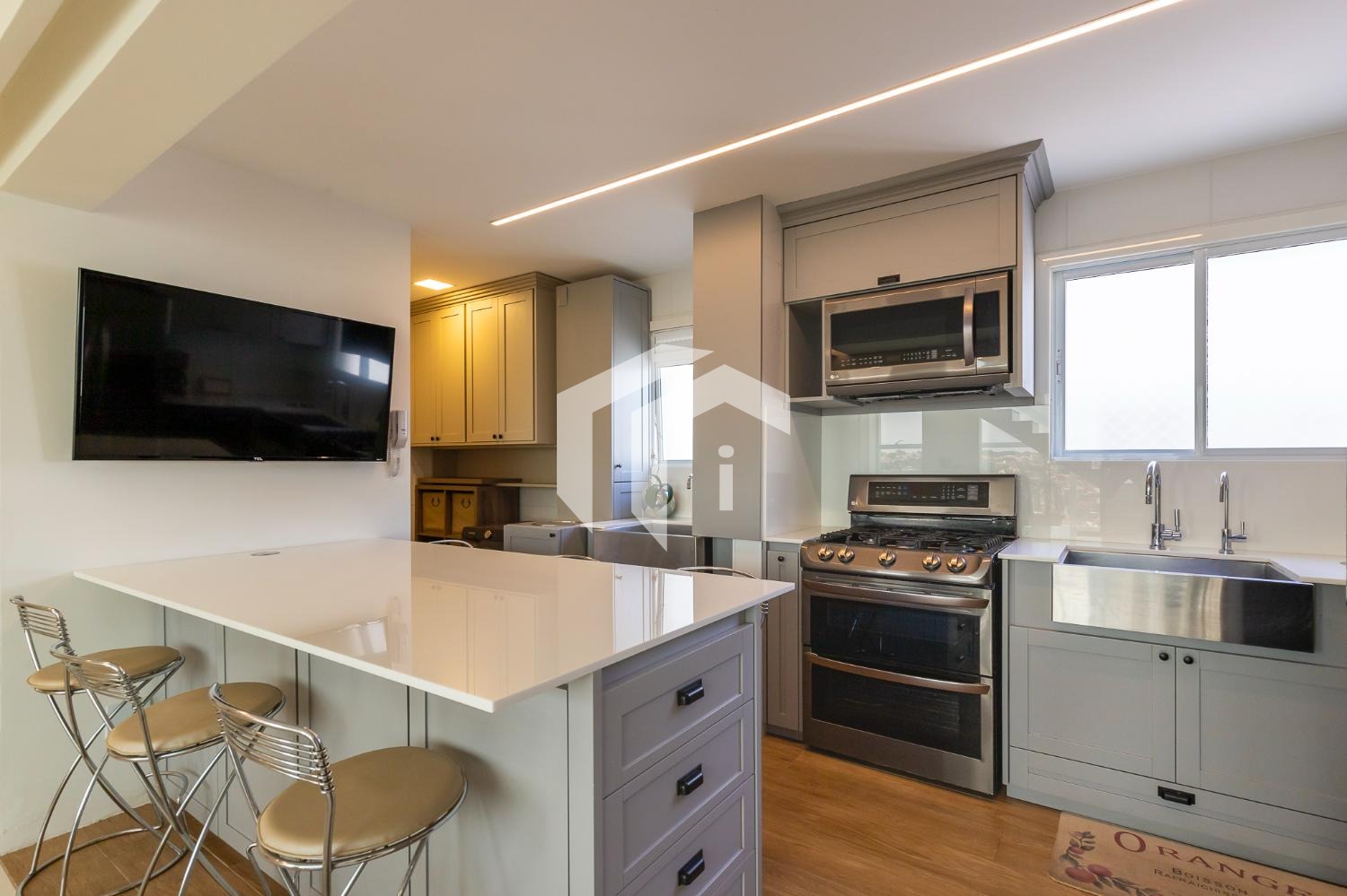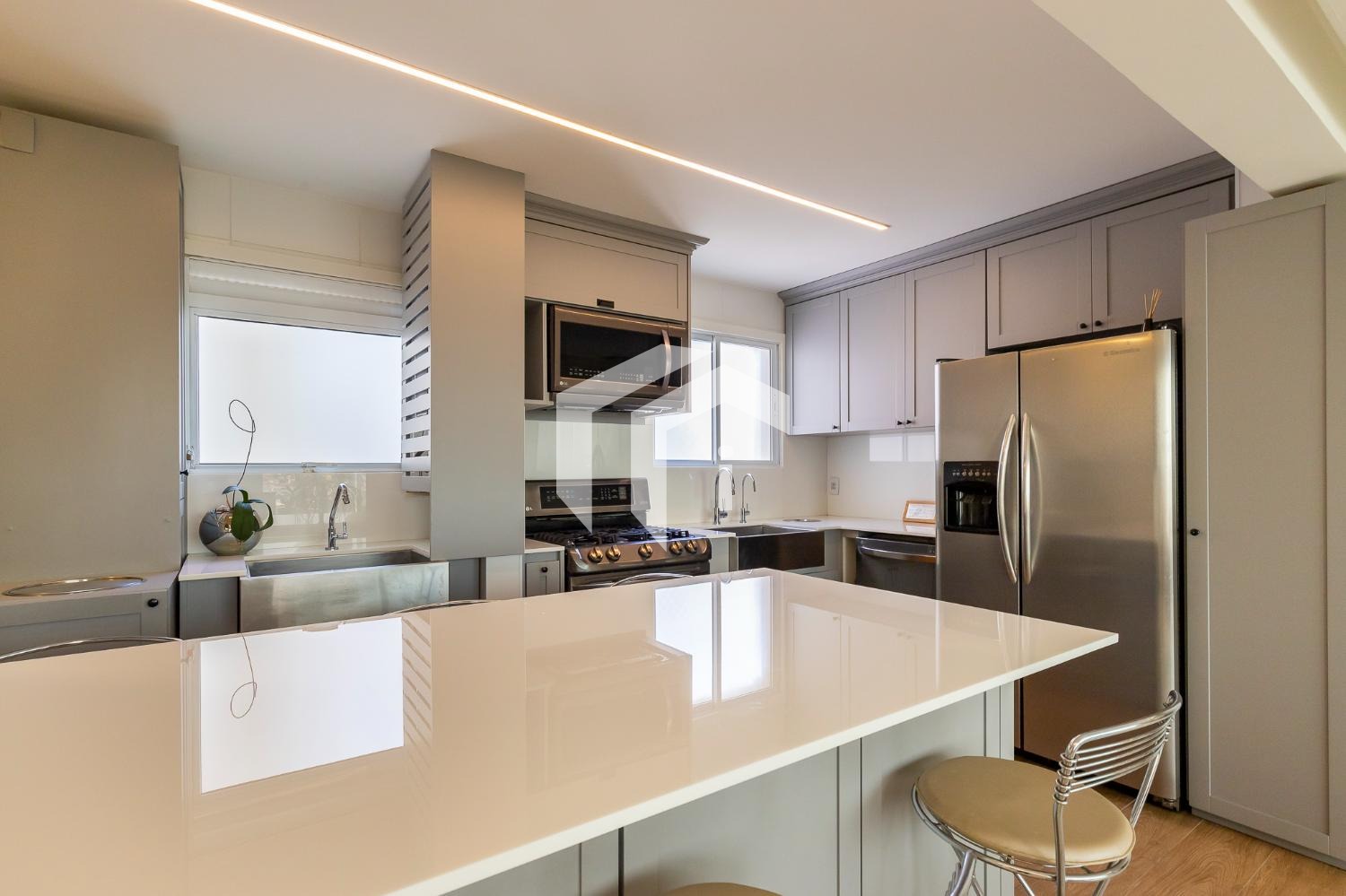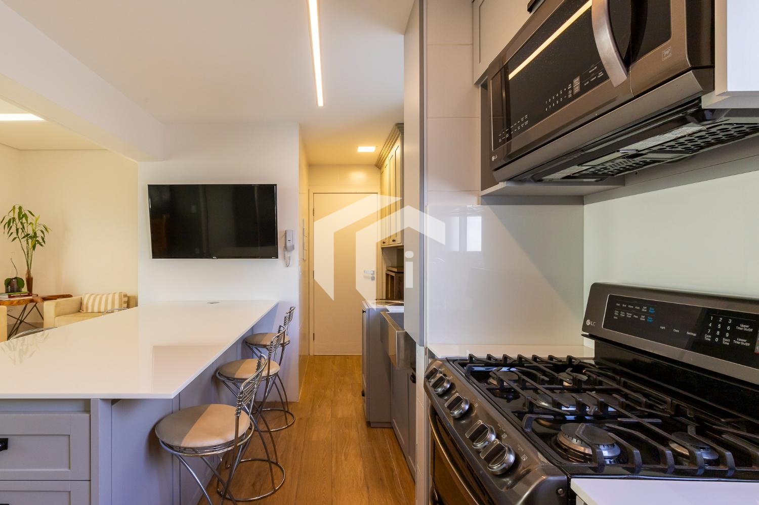 Living climatizado para 3 ambientes com lavabo e totalmente integrado à sofisticada cozinha americana.