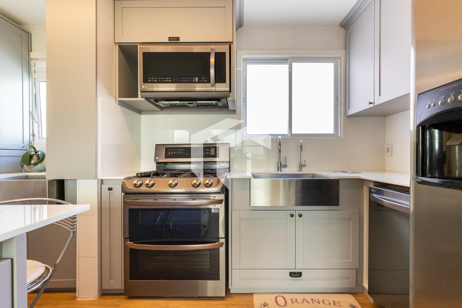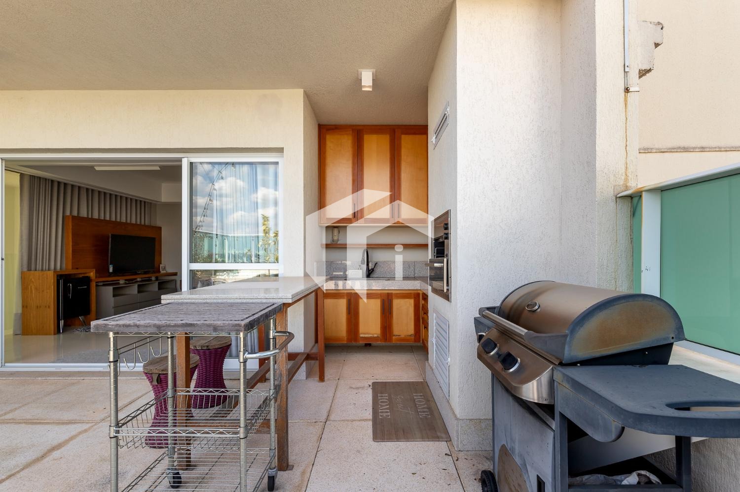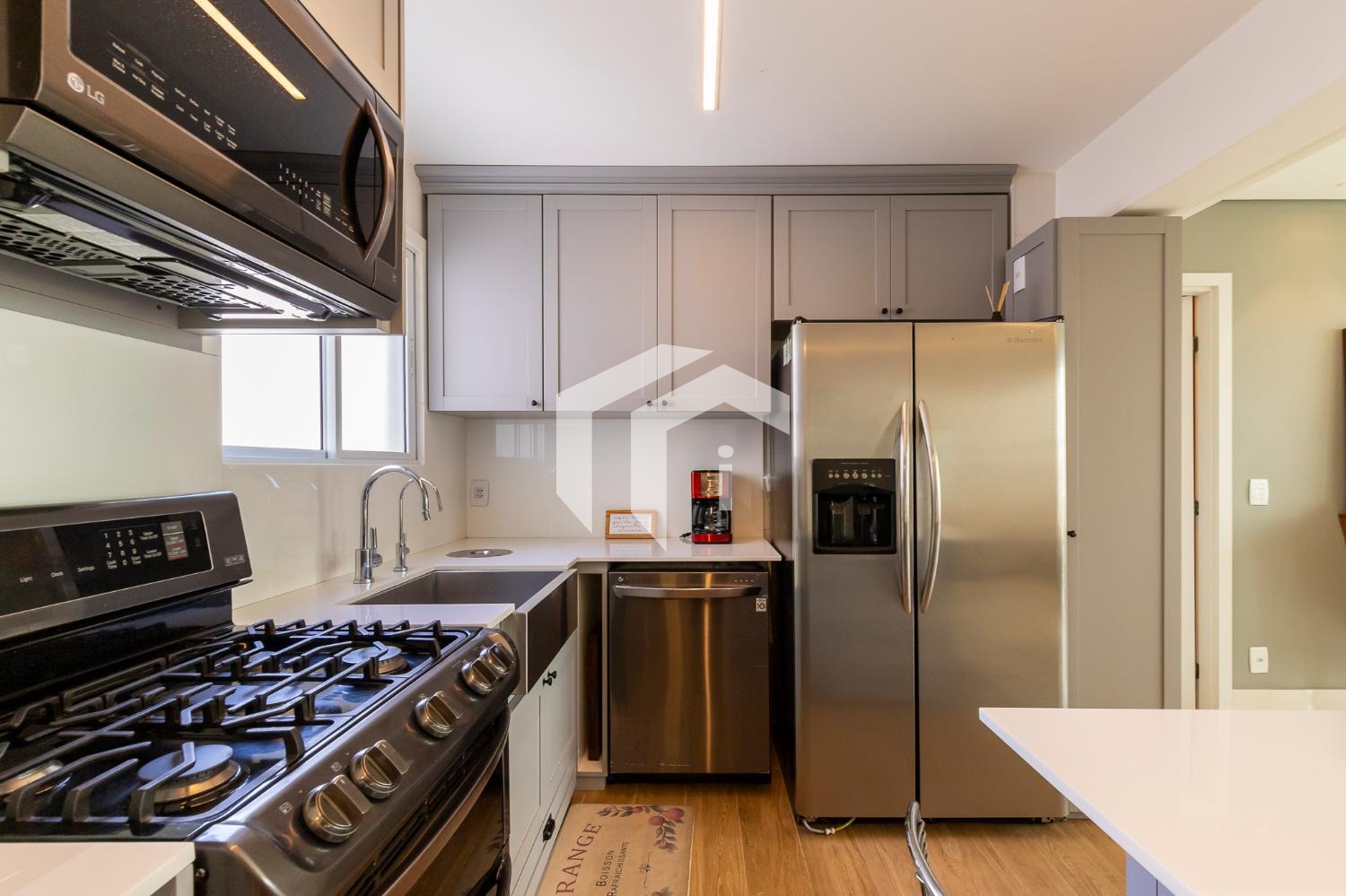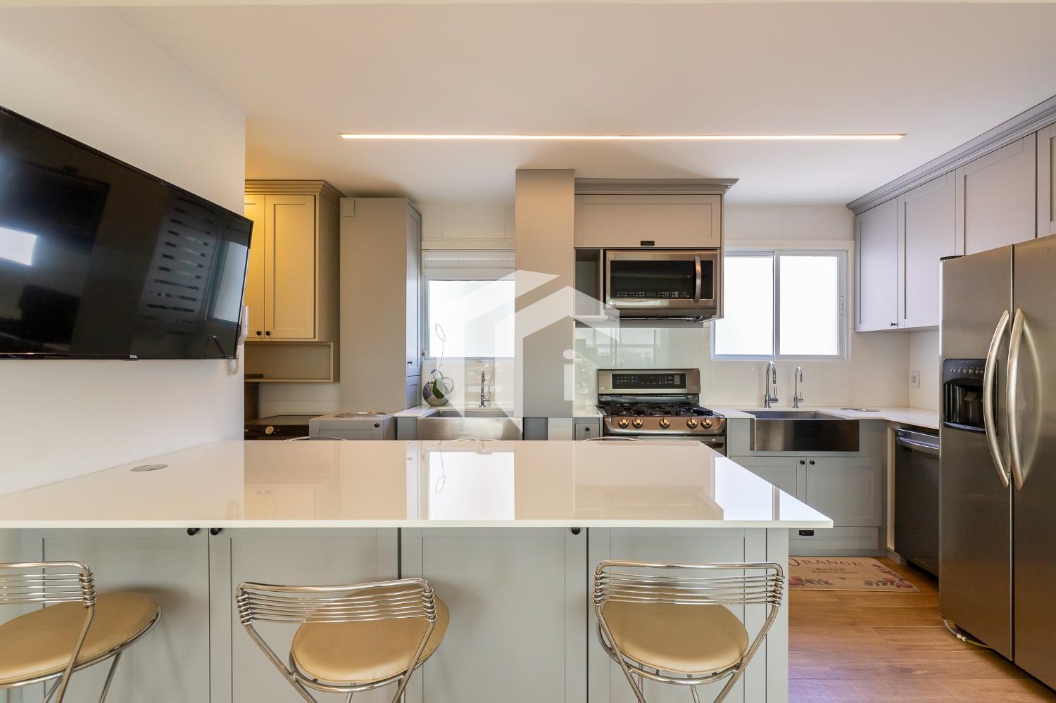 Living climatizado para 3 ambientes com lavabo e totalmente integrado à sofisticada cozinha americana.