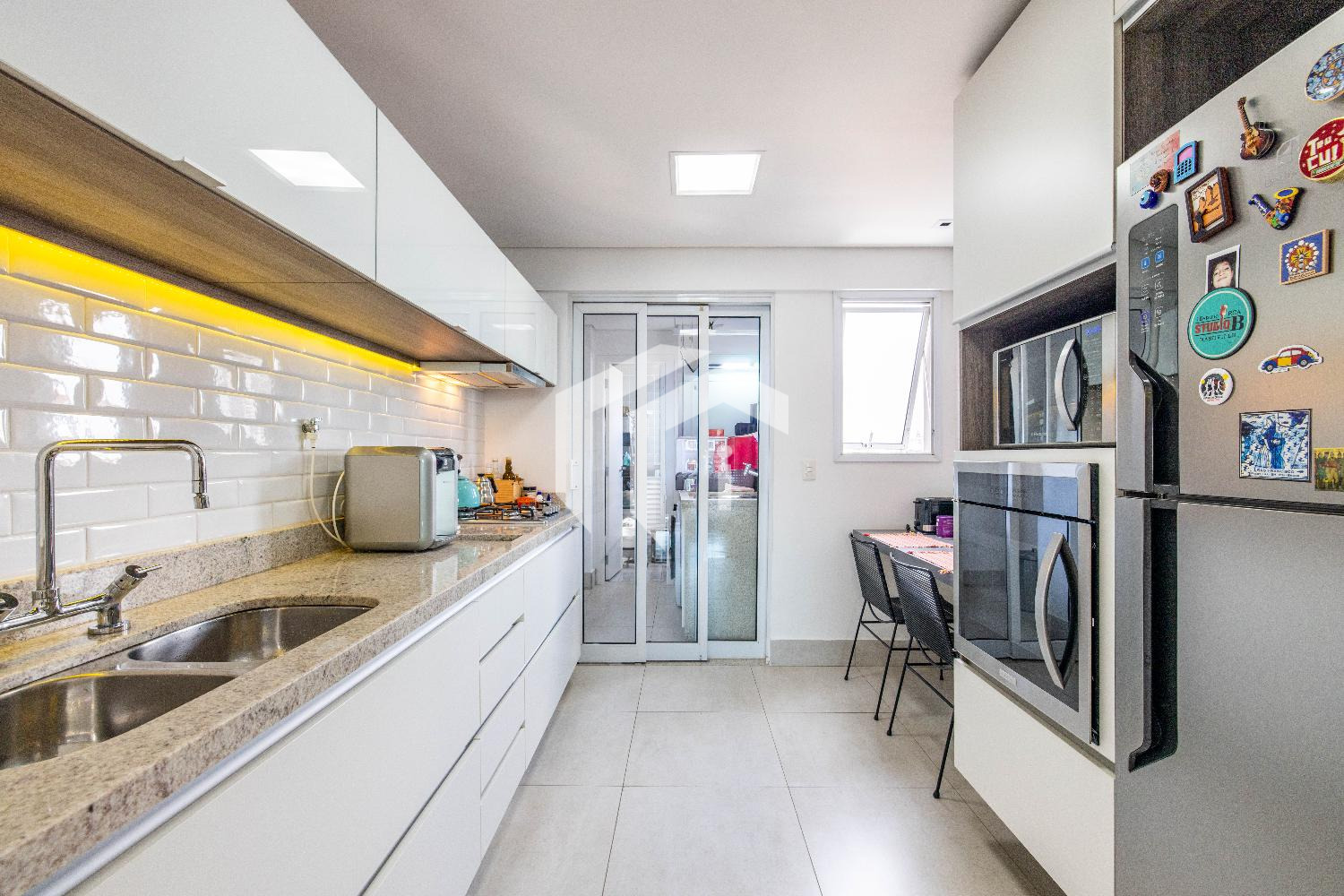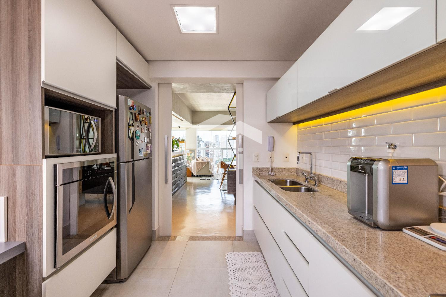 A cozinha totalmente planejada, equipada com torre quente e bancada de apoio, e a área de serviço dispõe de banheiro.