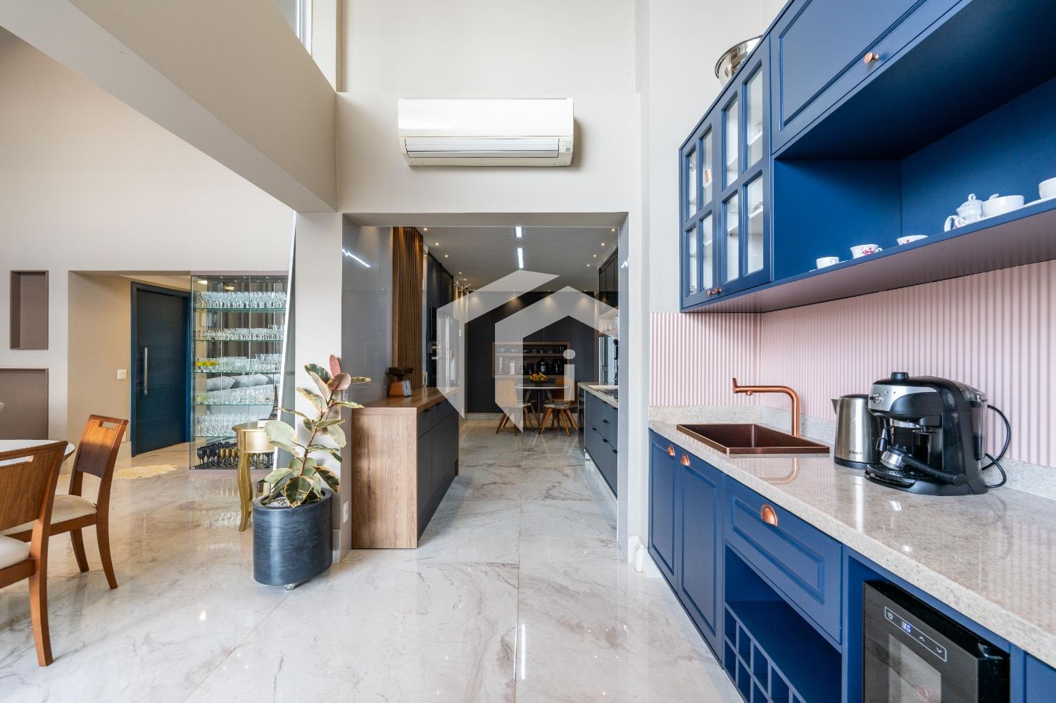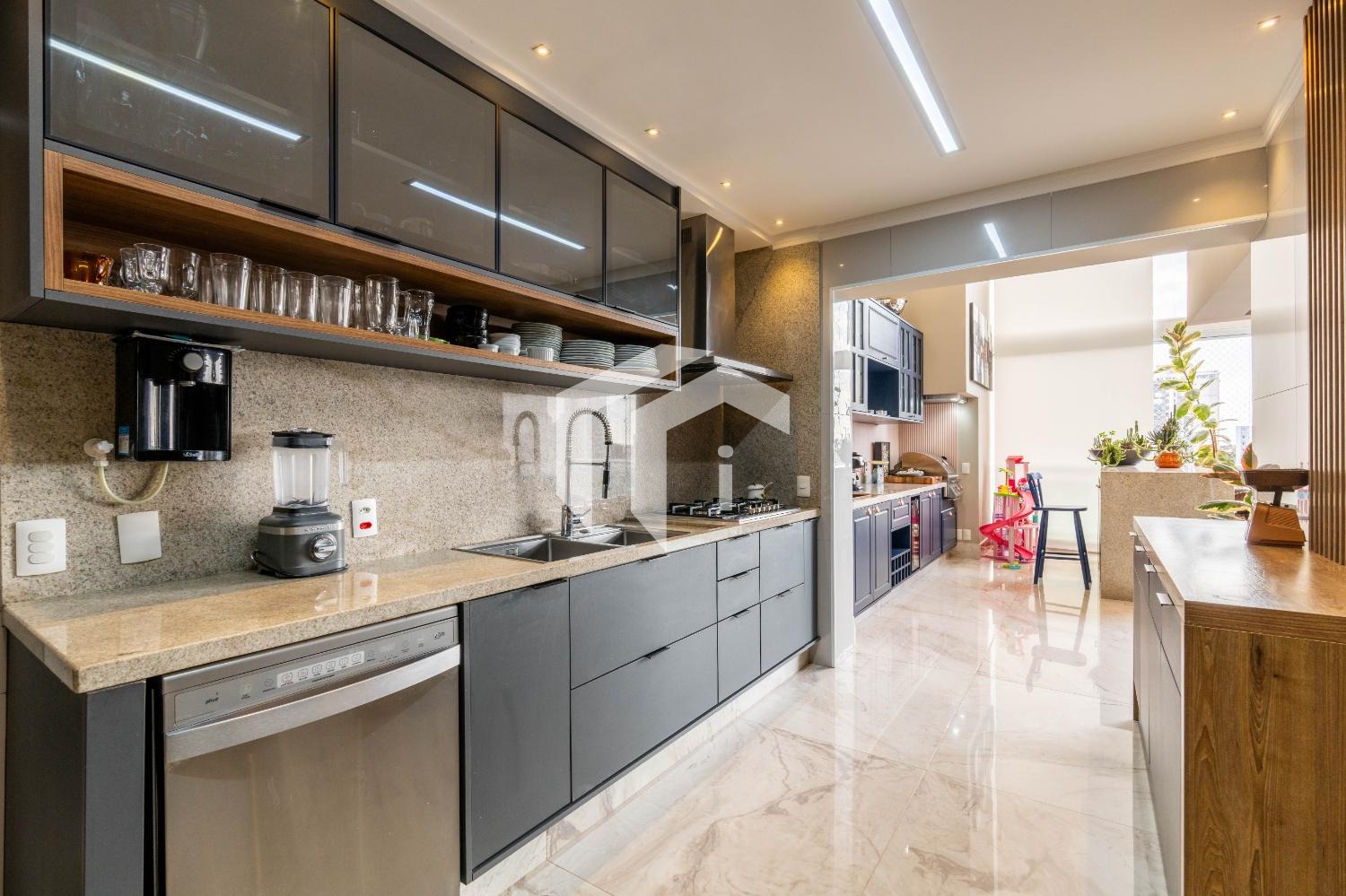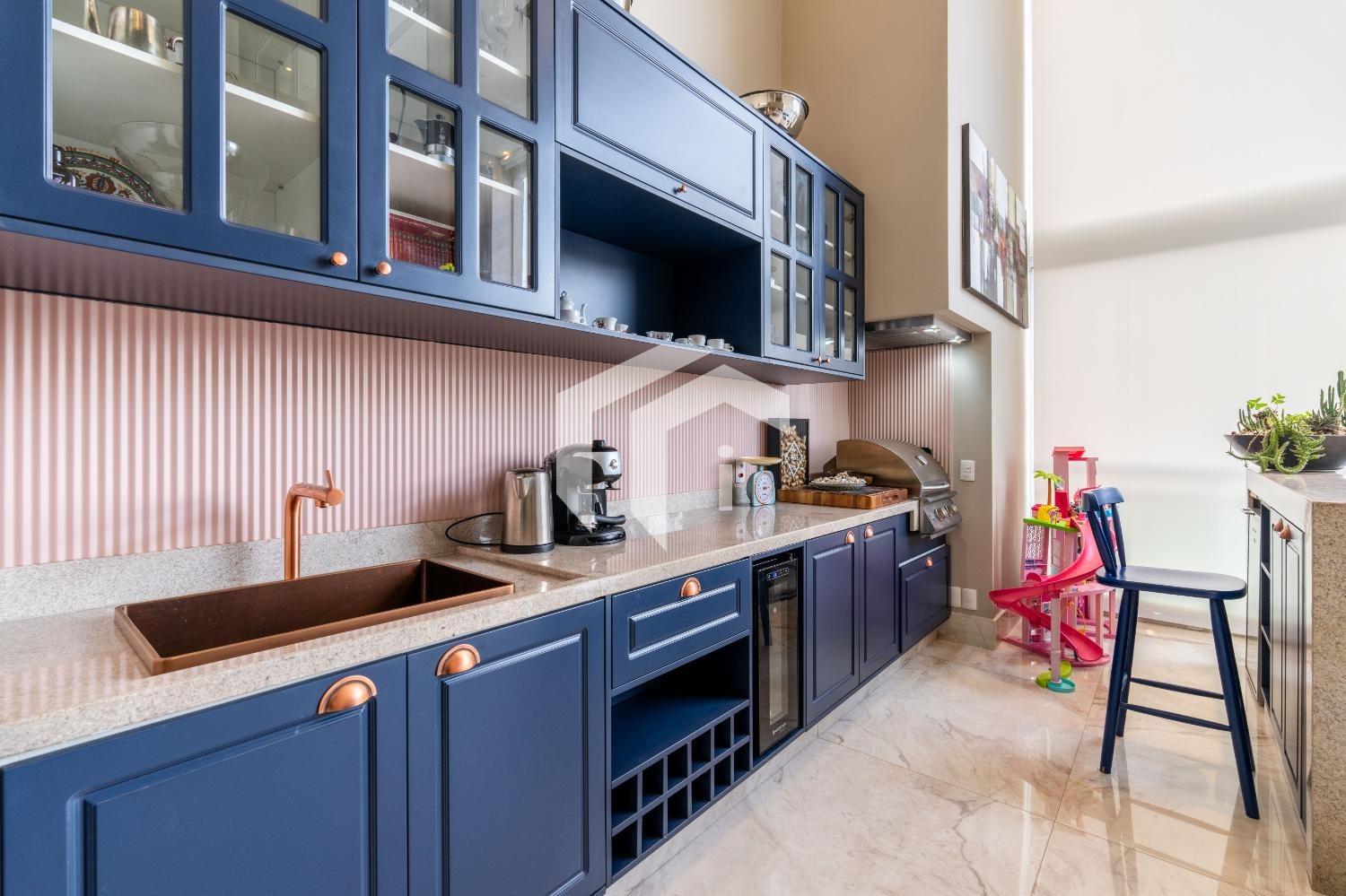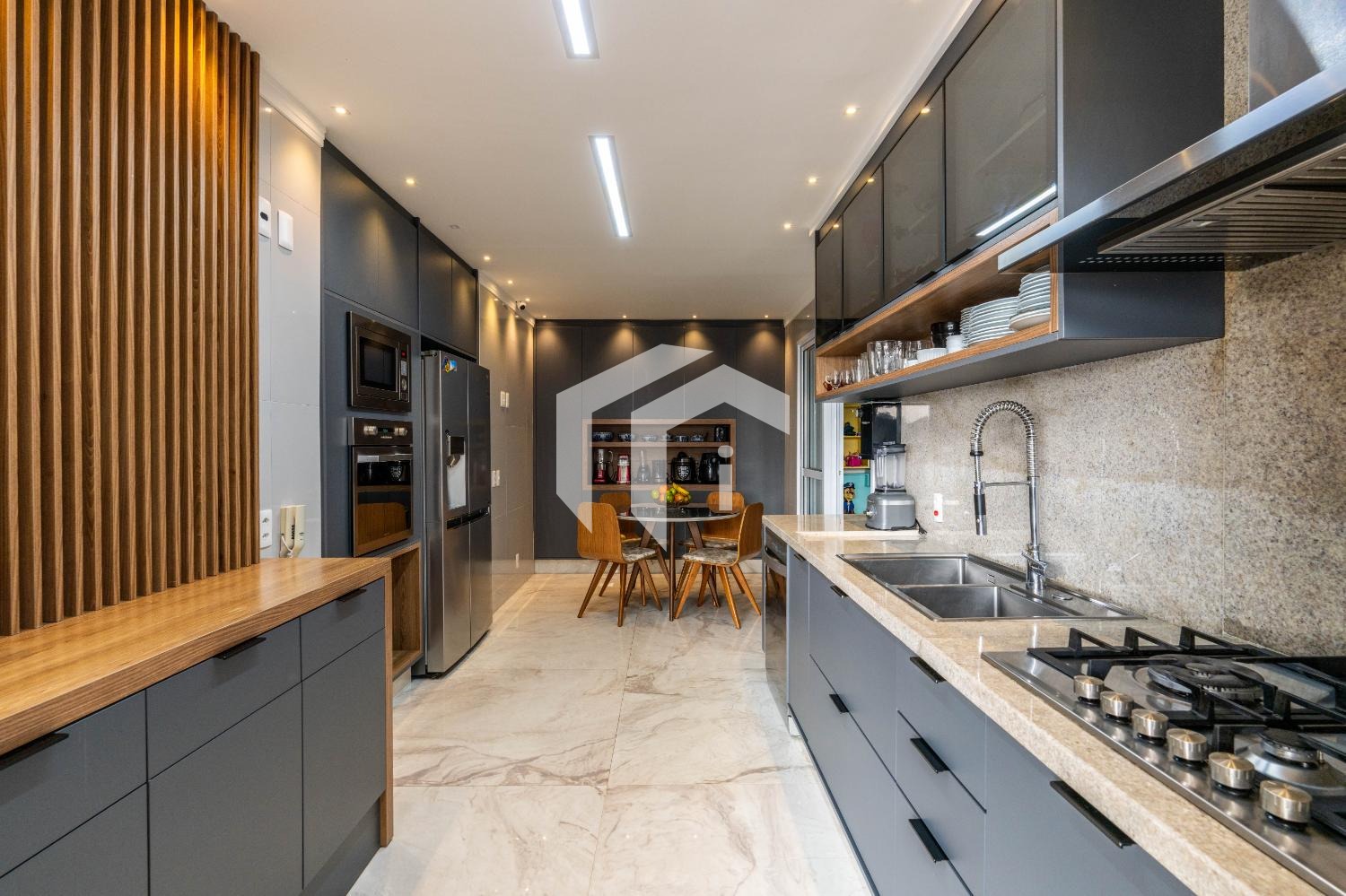 Cozinha recheada de armários planejados, uma despensa generosa e entrada de serviço promovendo praticidade.