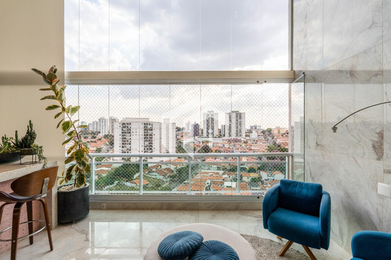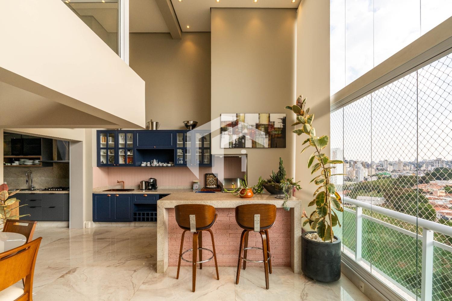 Sacada espaçosa com churrasqueira com vista livre para o resort do condomínio.