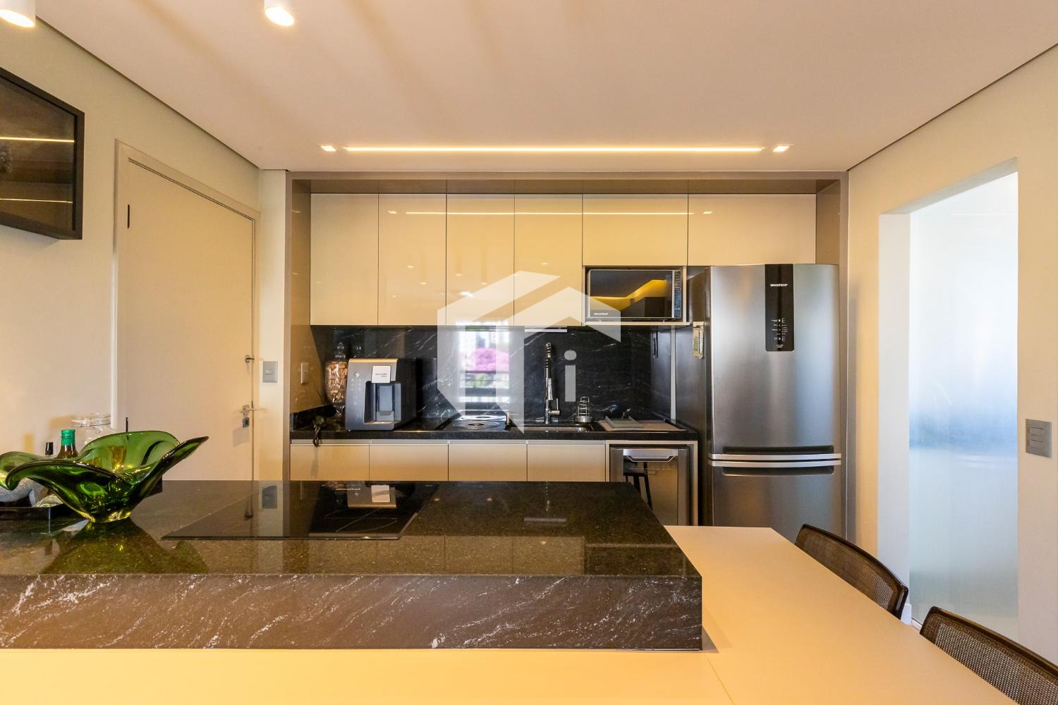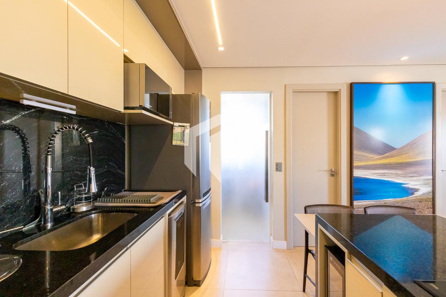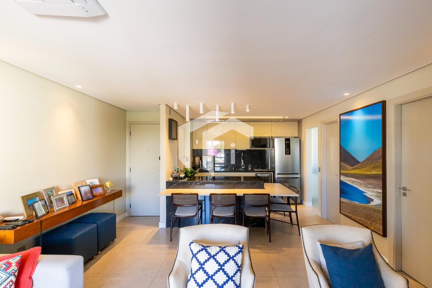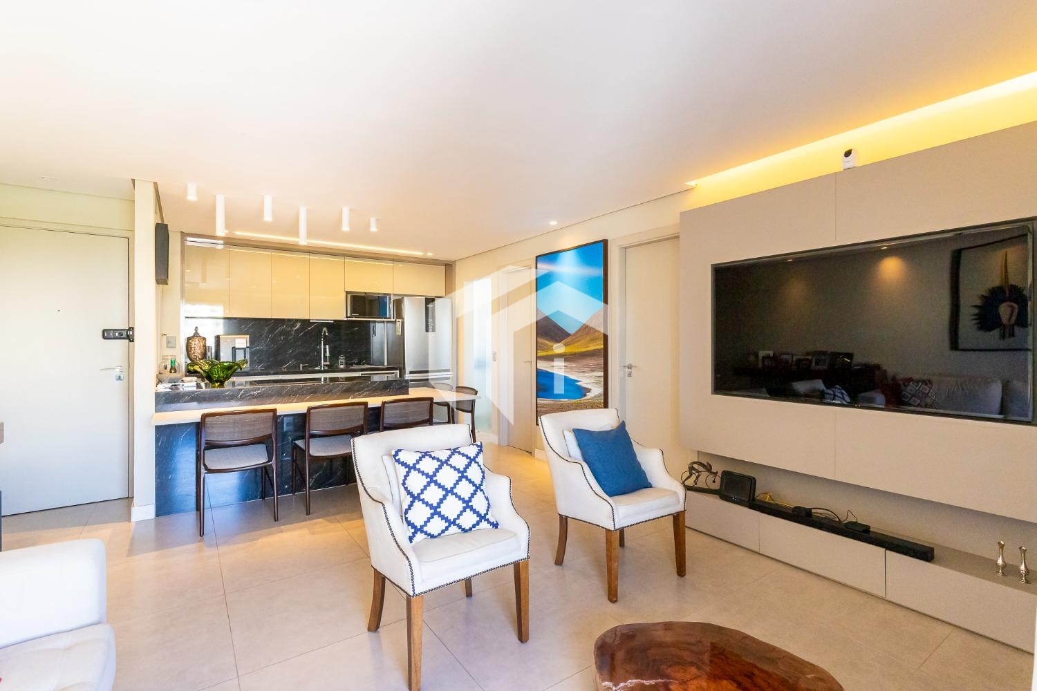 Living climatizado para 2 ambientes com uma convidativa varanda e lavabo, integrado à uma sofisticada e planejada cozinha americana, mais, área de serviço.