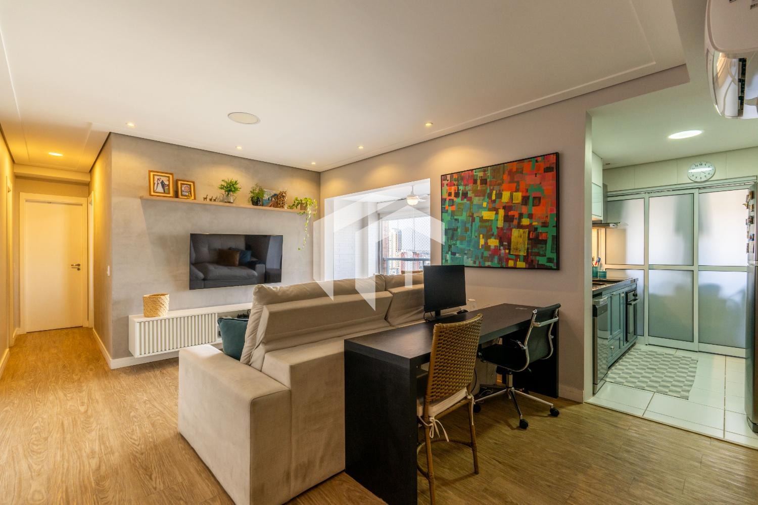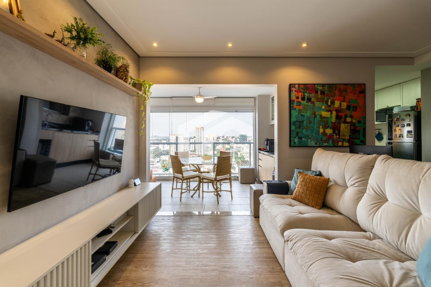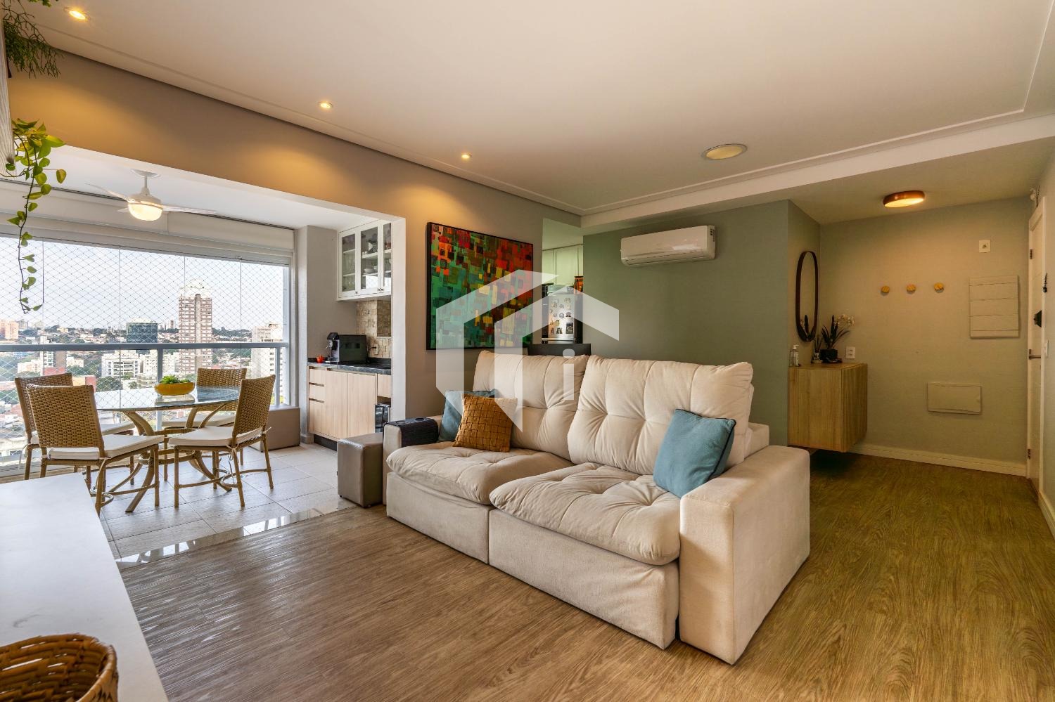 Sala ampla para 2 ambientes, climatizada e integrada à varanda gourmet, mais, o lavabo para o seu conforto.