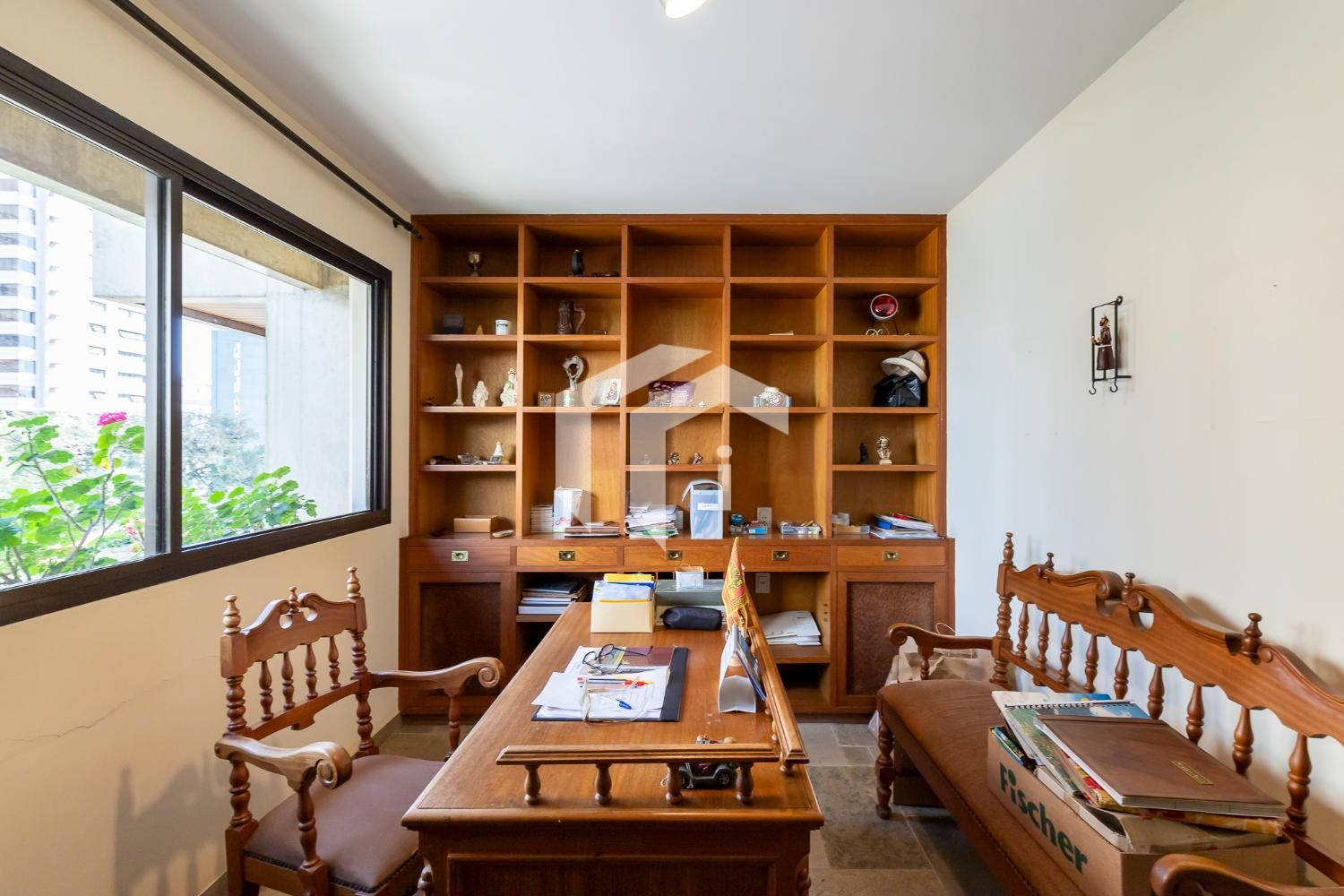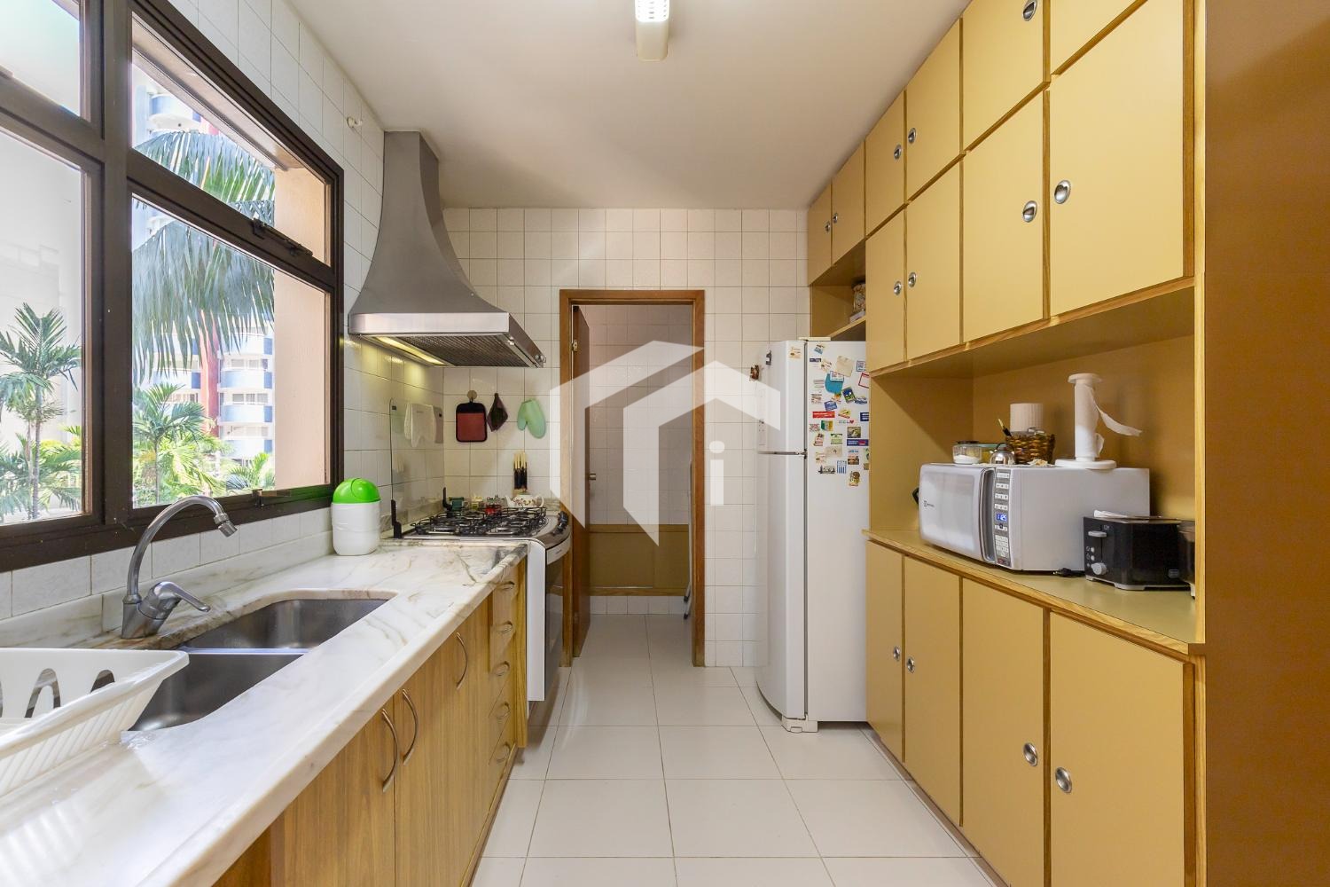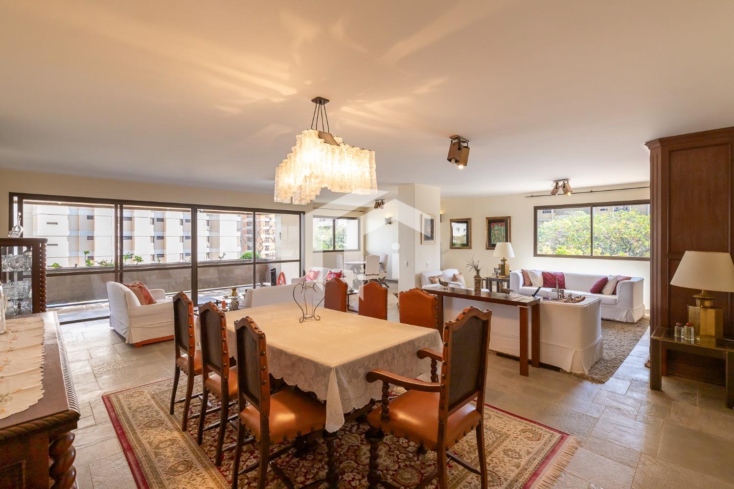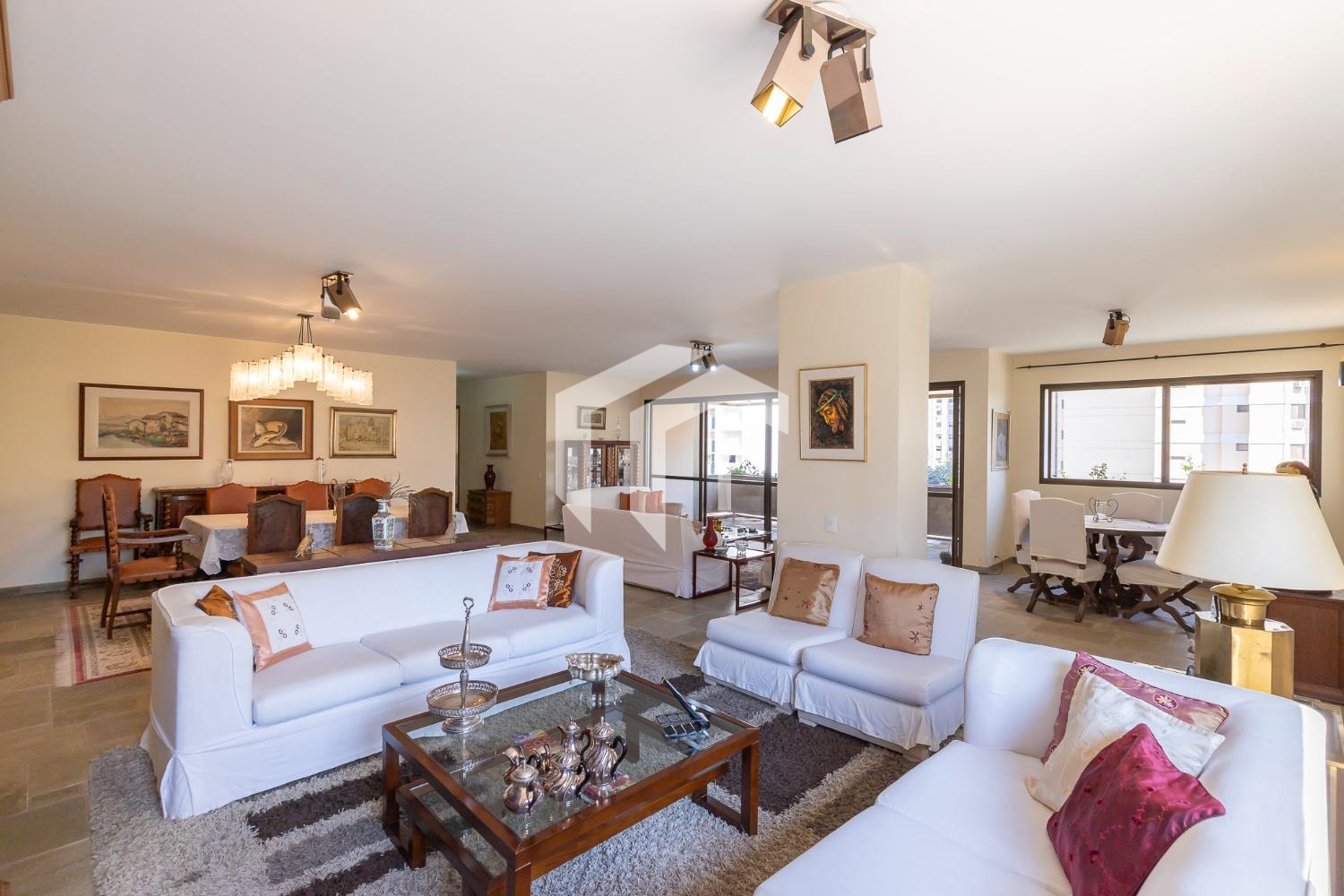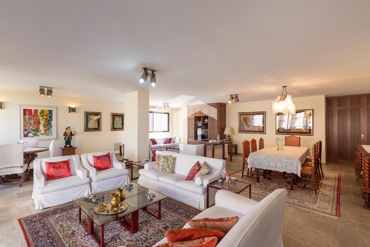 Situado em um andar intermediário, o imóvel possui um amplo living para quatro ambientes com varanda, escritório, sala de almoço, cozinha planejada e dependência de serviço completa.