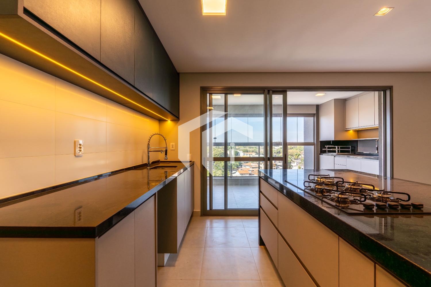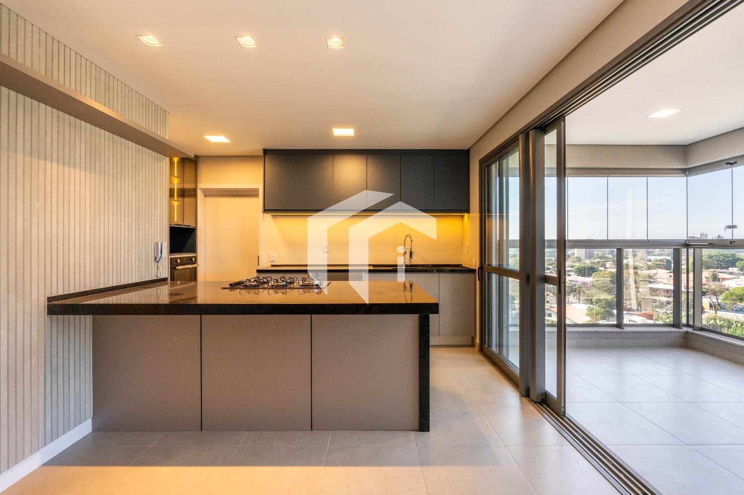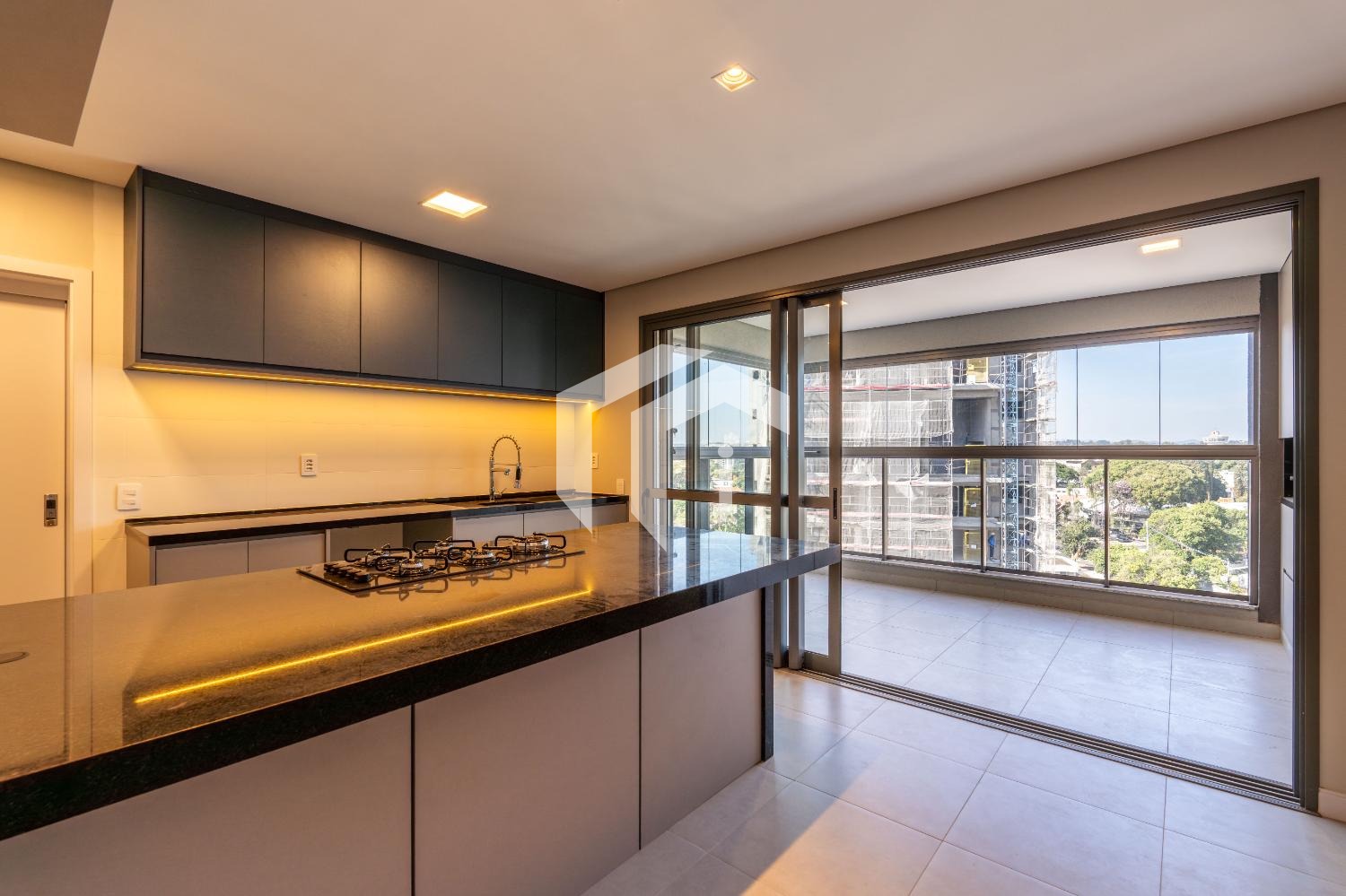 Cozinha americana completa em armários e totalmente integrada ao living e à varanda gourmet.
