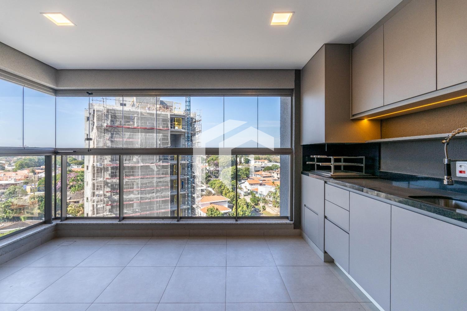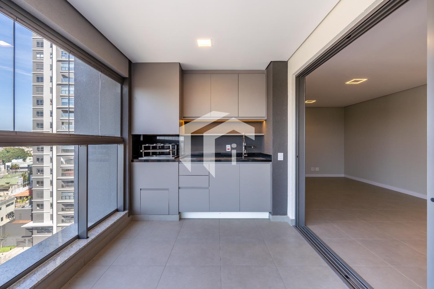 Convidativa varanda gourmet com churrasqueira à carvão, já com blindex rebatível.