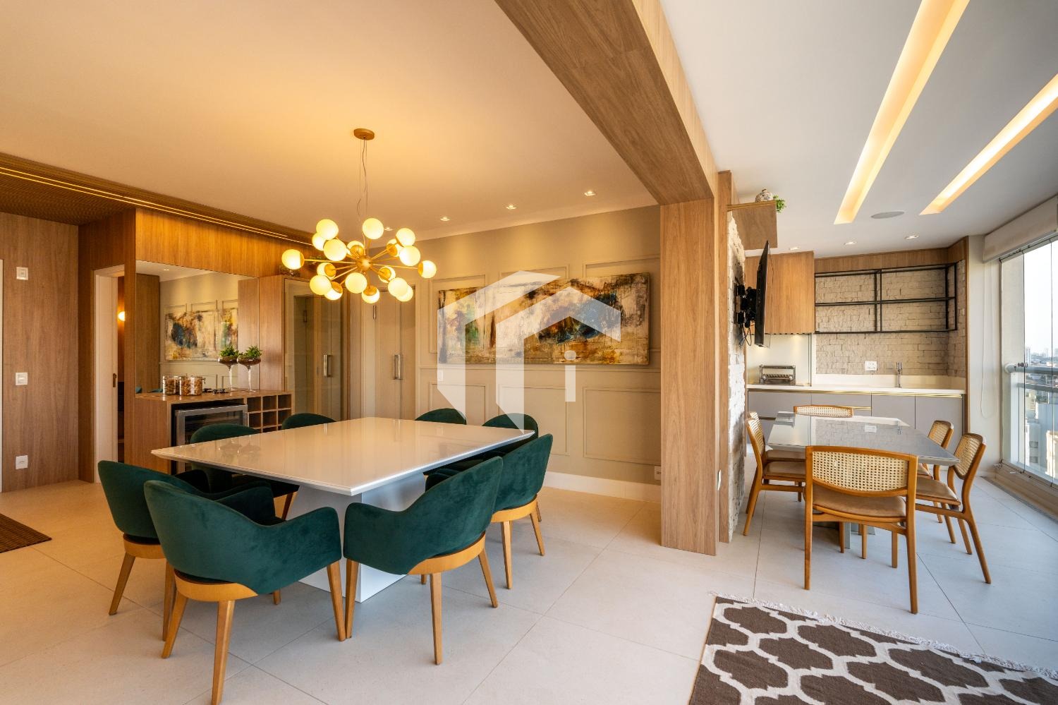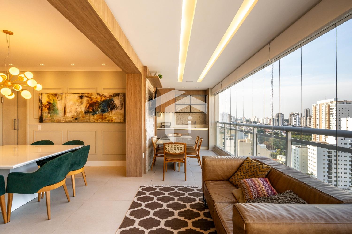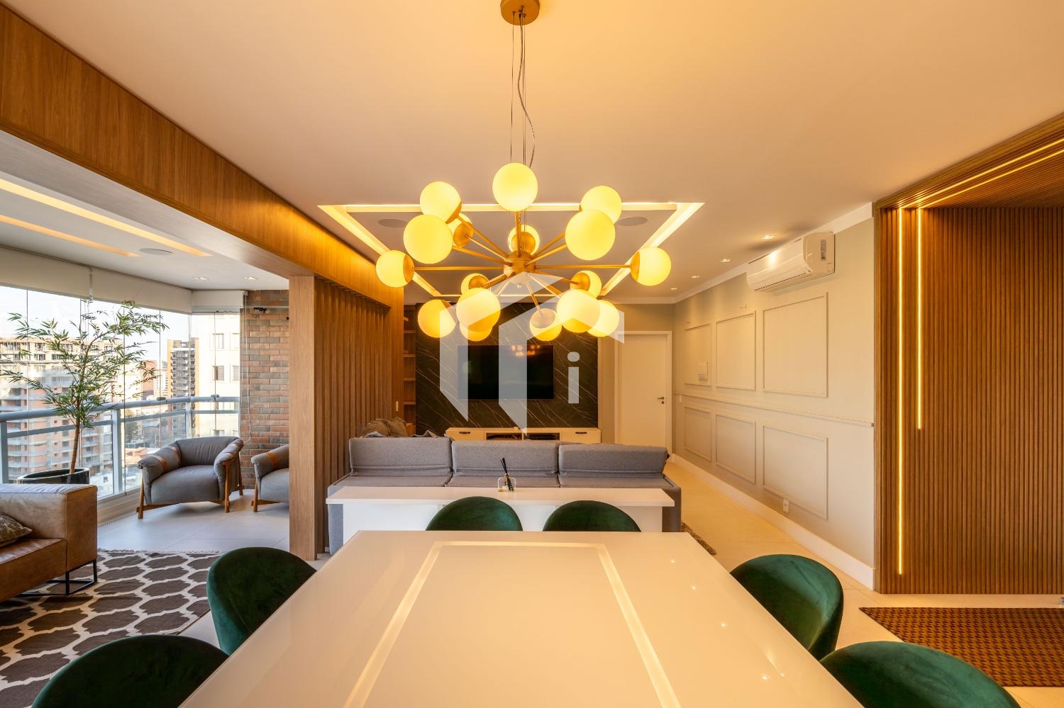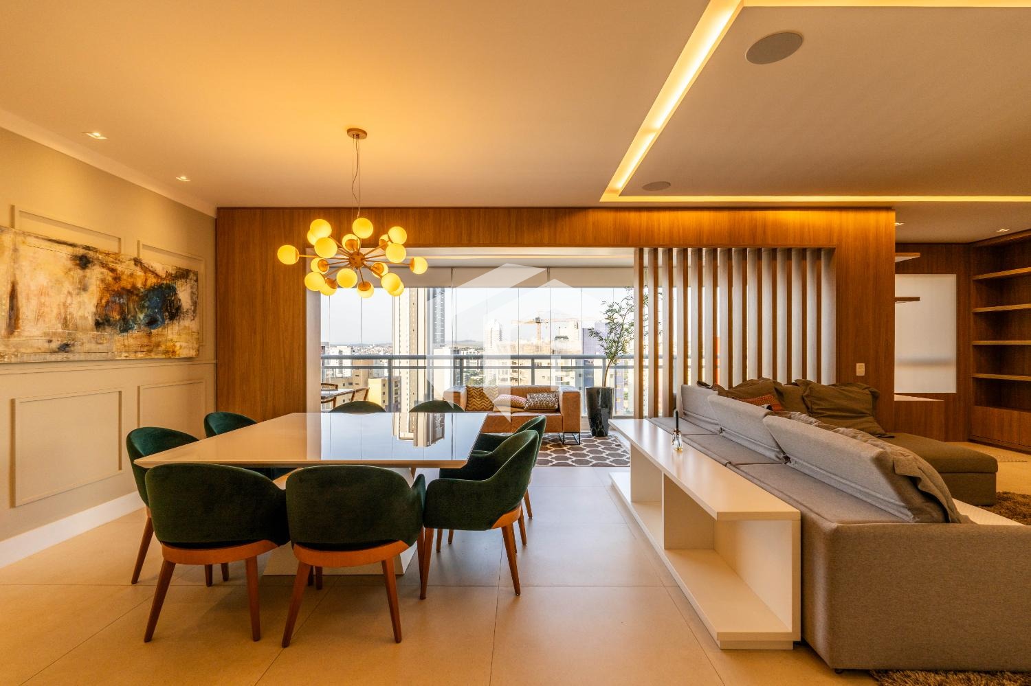 Living para 3 ambientes com lavabo, home office e tudo integrado a uma convidativa varanda gourmet.