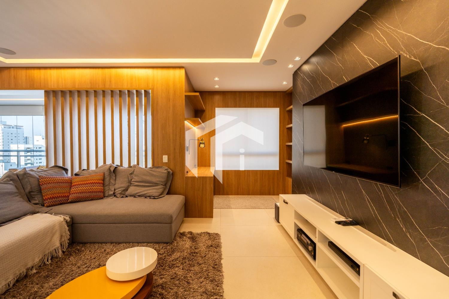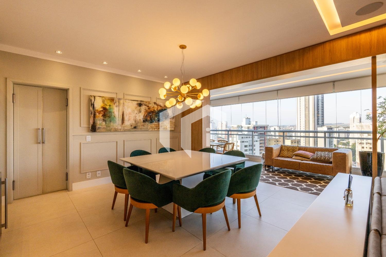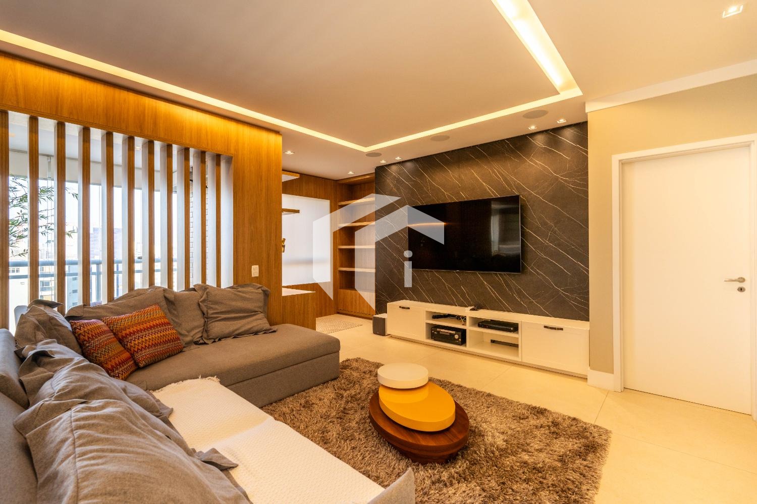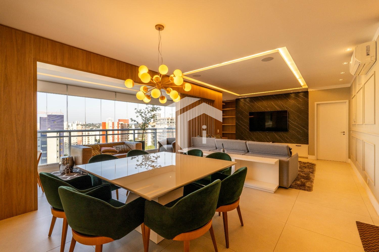 Living para 3 ambientes com lavabo, home office e tudo integrado a uma convidativa varanda gourmet.