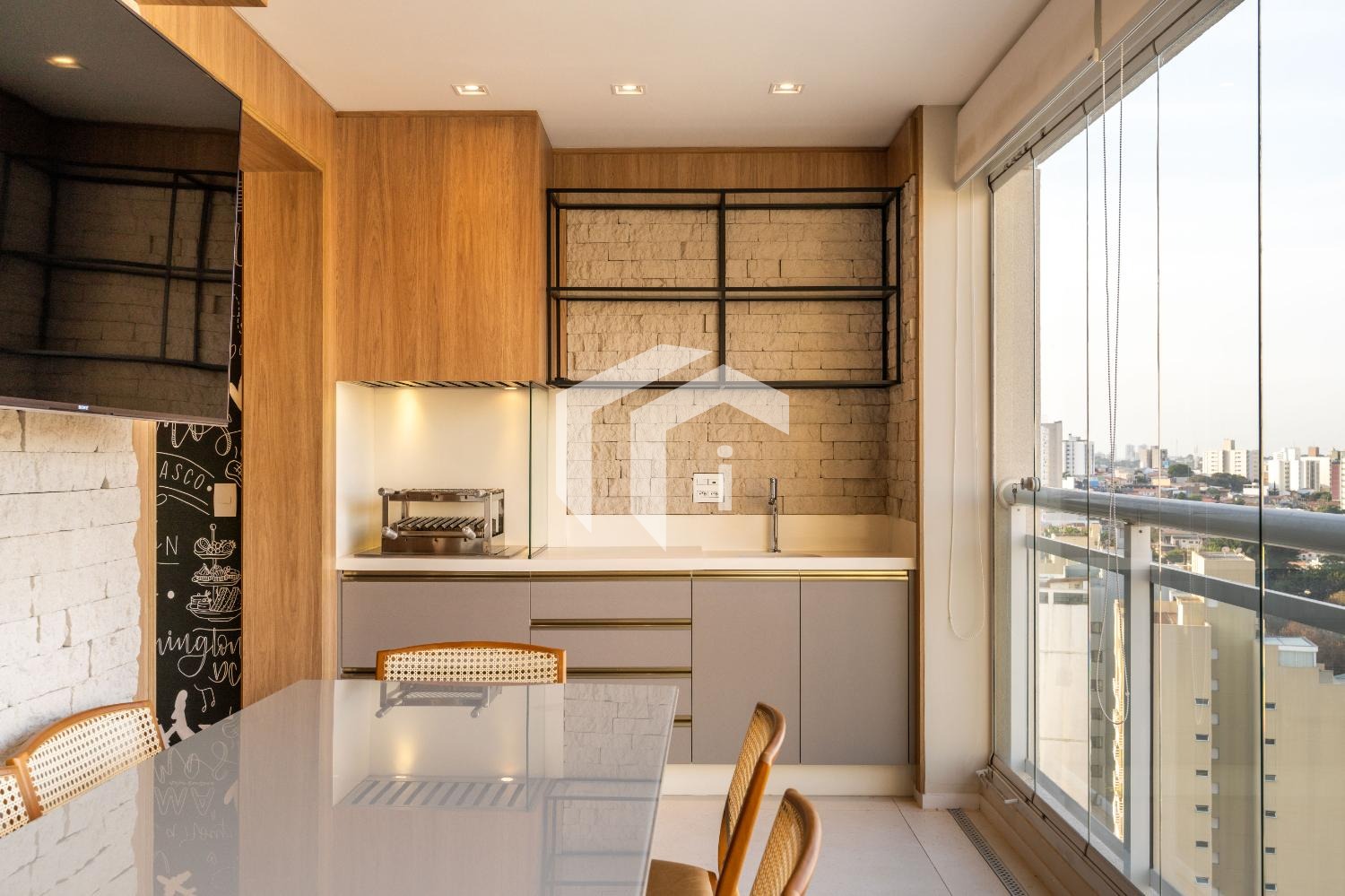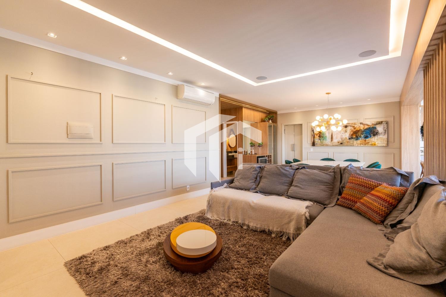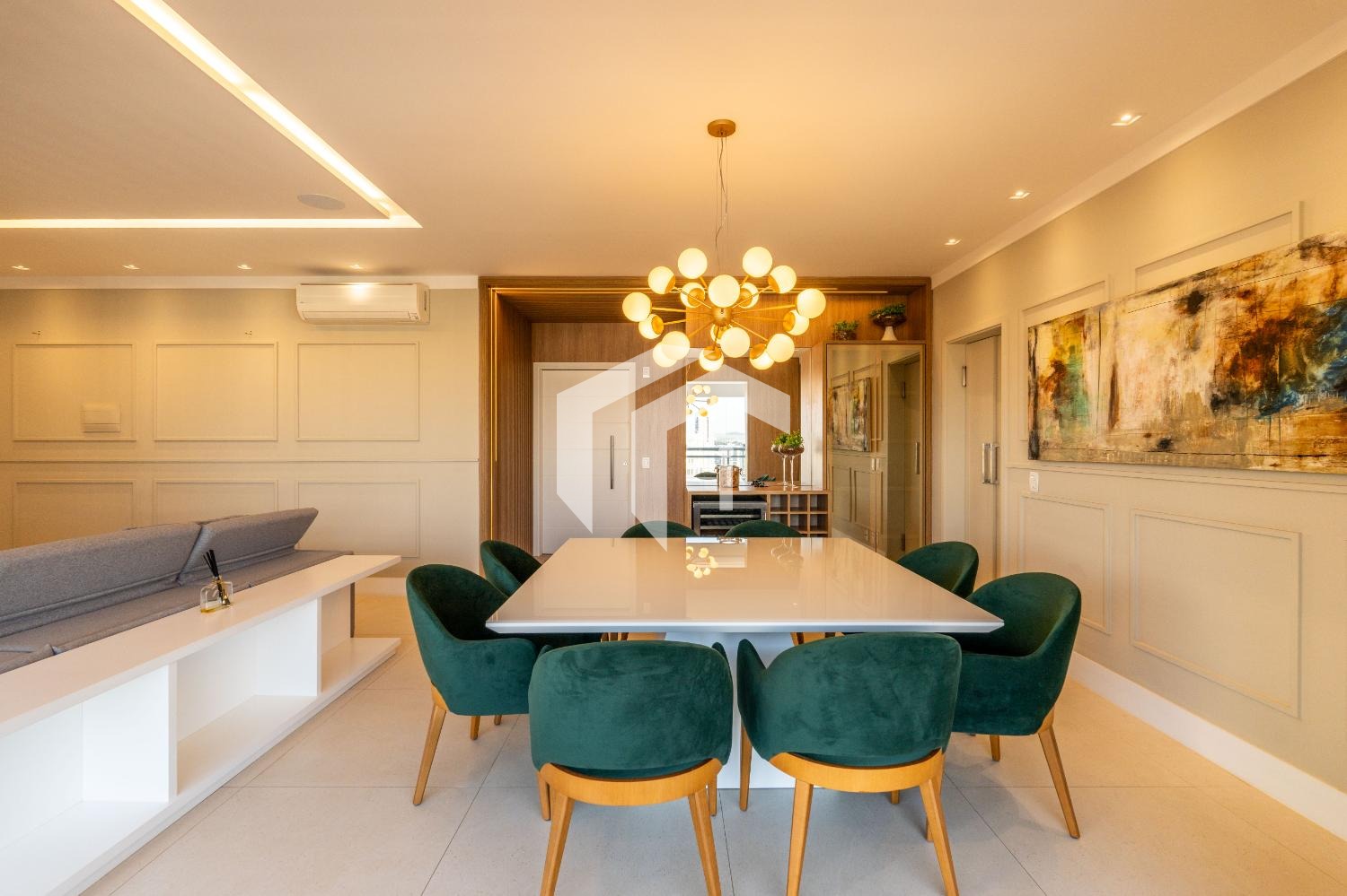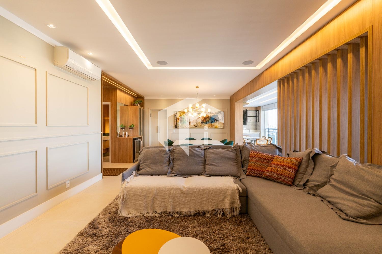 Living para 3 ambientes com lavabo, home office e tudo integrado a uma convidativa varanda gourmet.