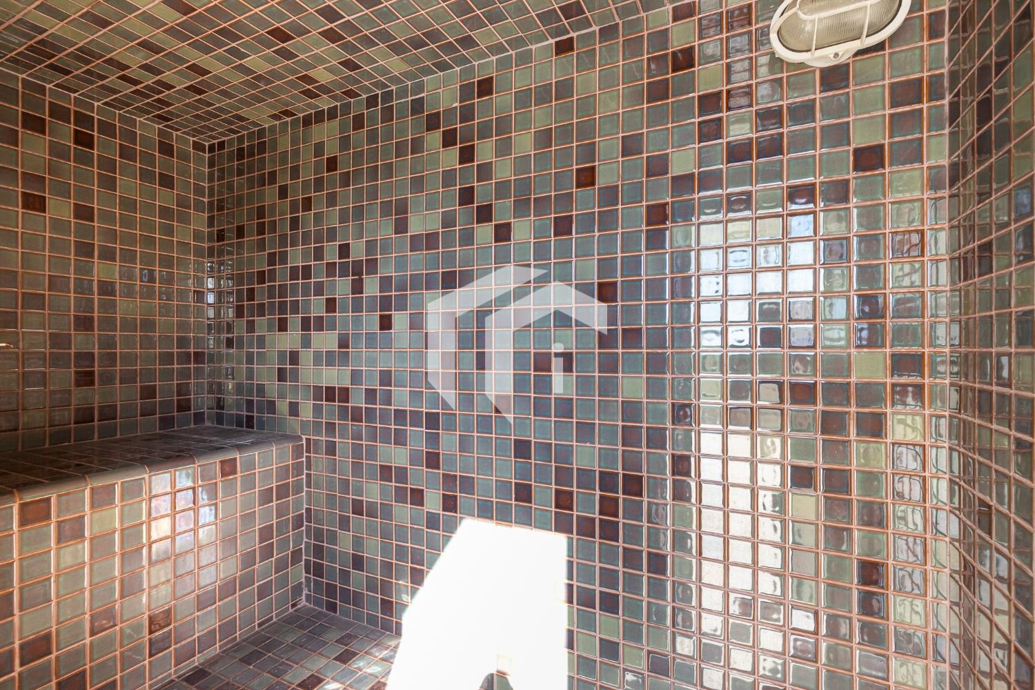 Piso superior: Amplo living, suíte, varanda com churrasqueira, lavabo, piscina e sauna.