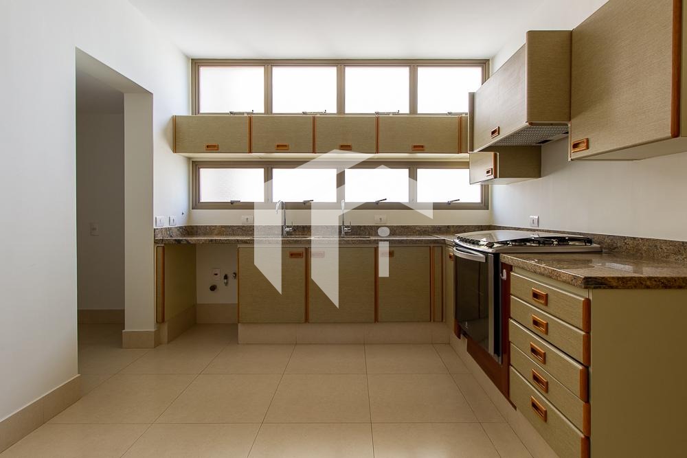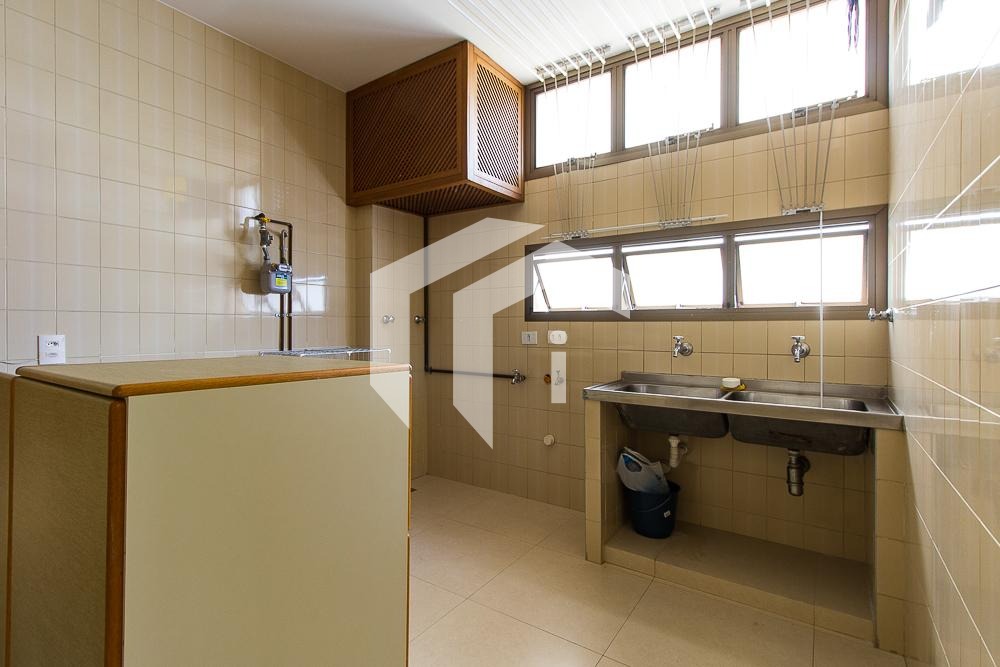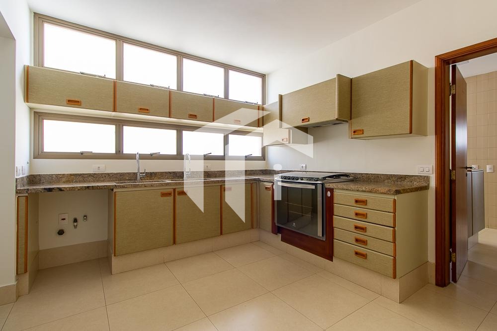 Cozinha rica em planejados com copa e despensa, mais, área de serviço e dependência de empregados.
