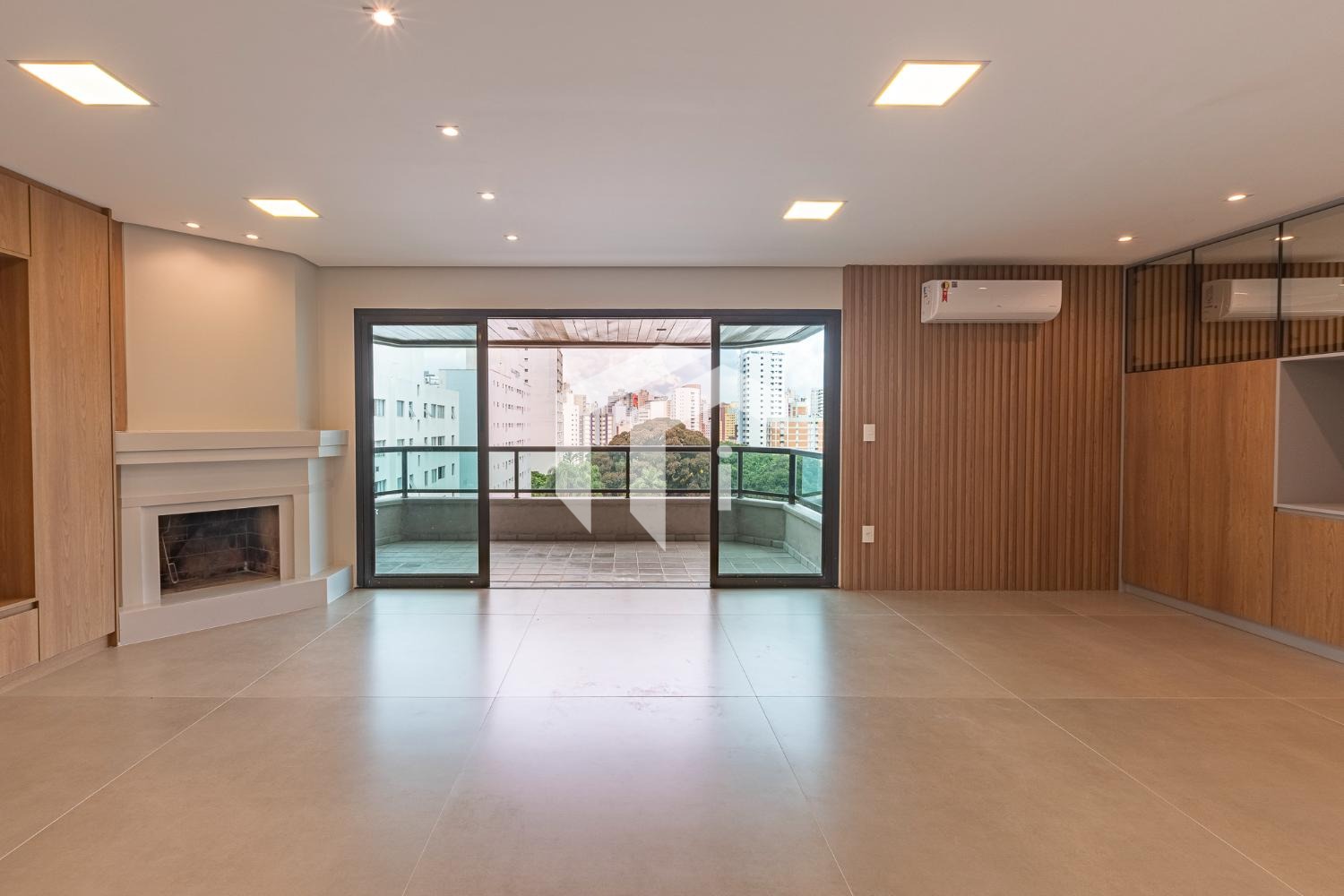 Living climatizado para 3 ambientes com ampla varanda, mais, lavabo e lareira.