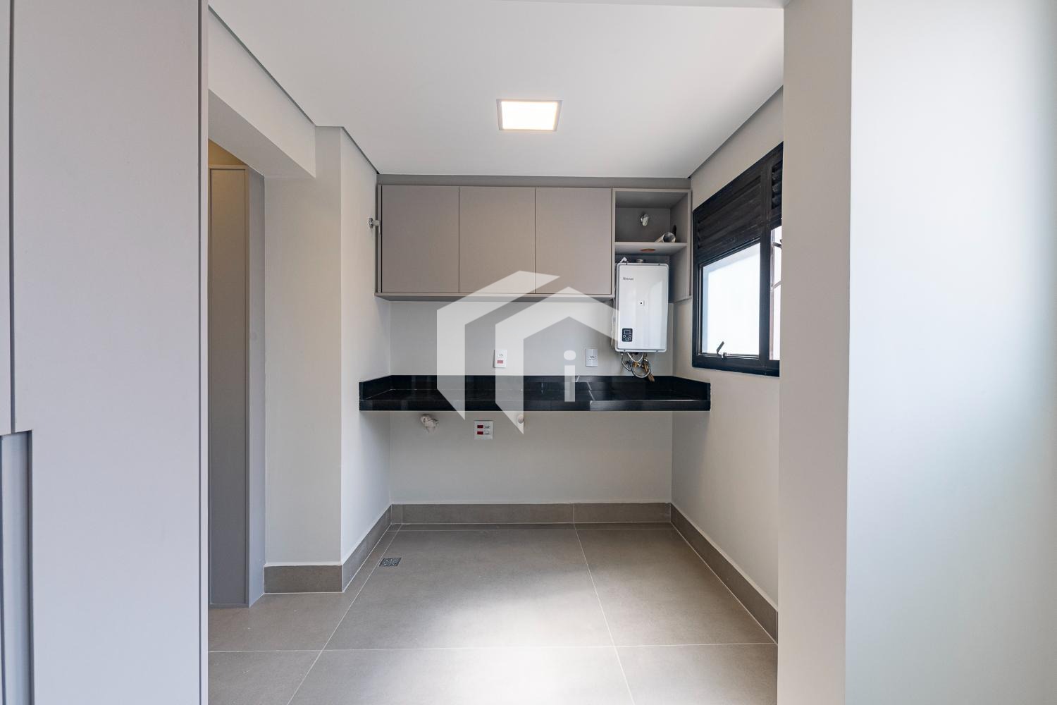 Cozinha com copla repleta em armários e área de serviço com wc de apoio.