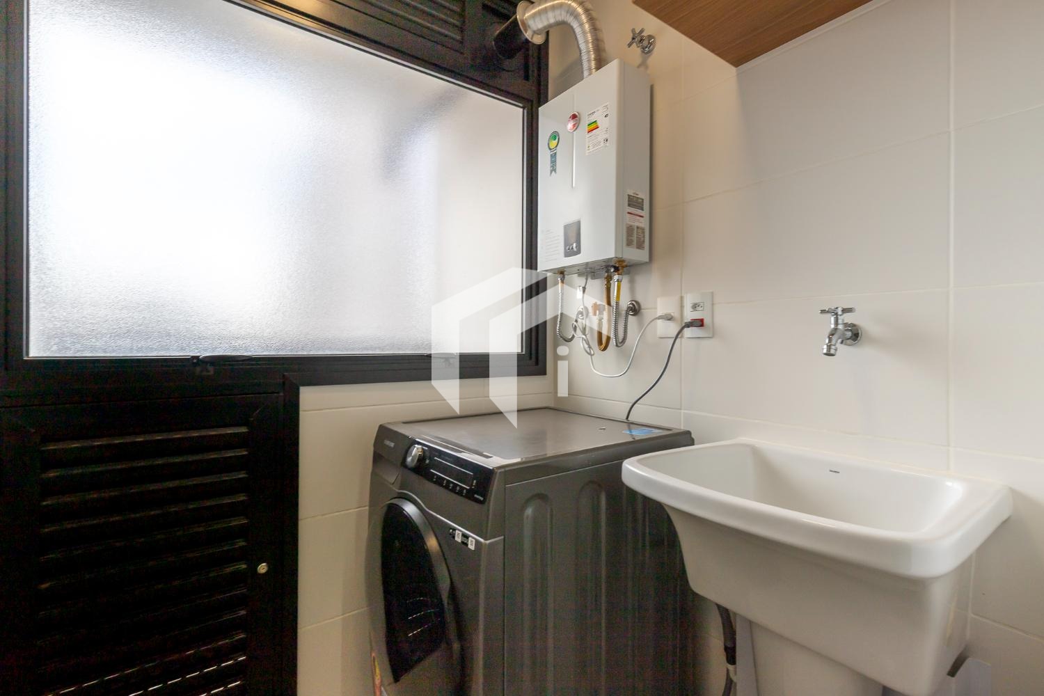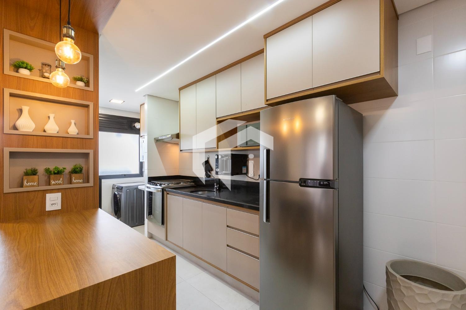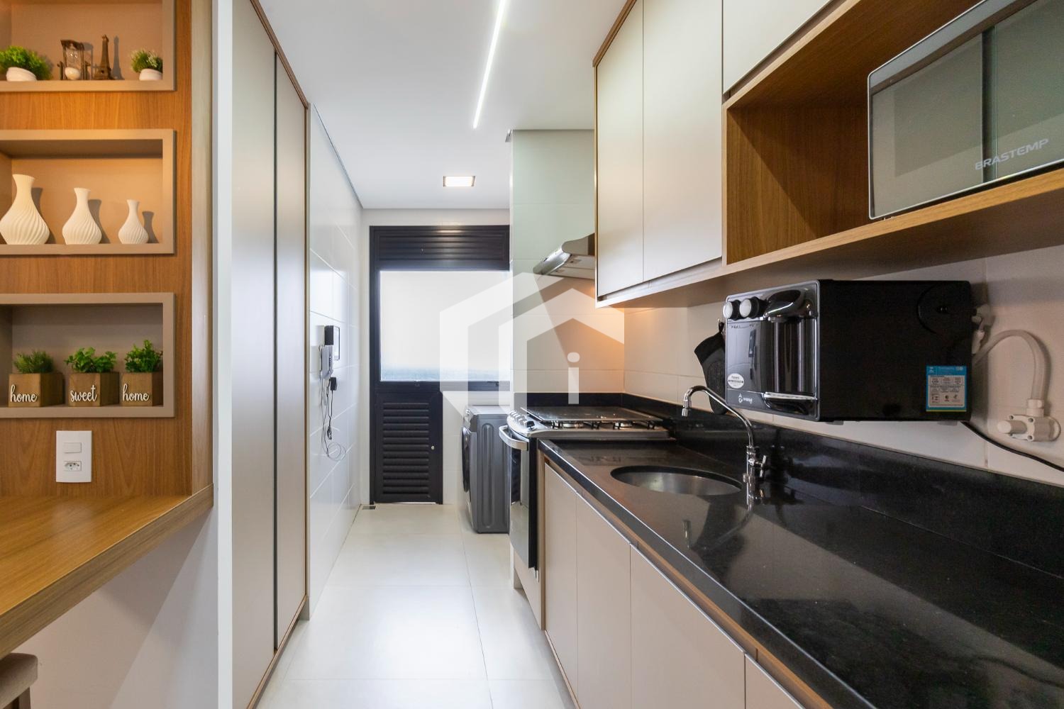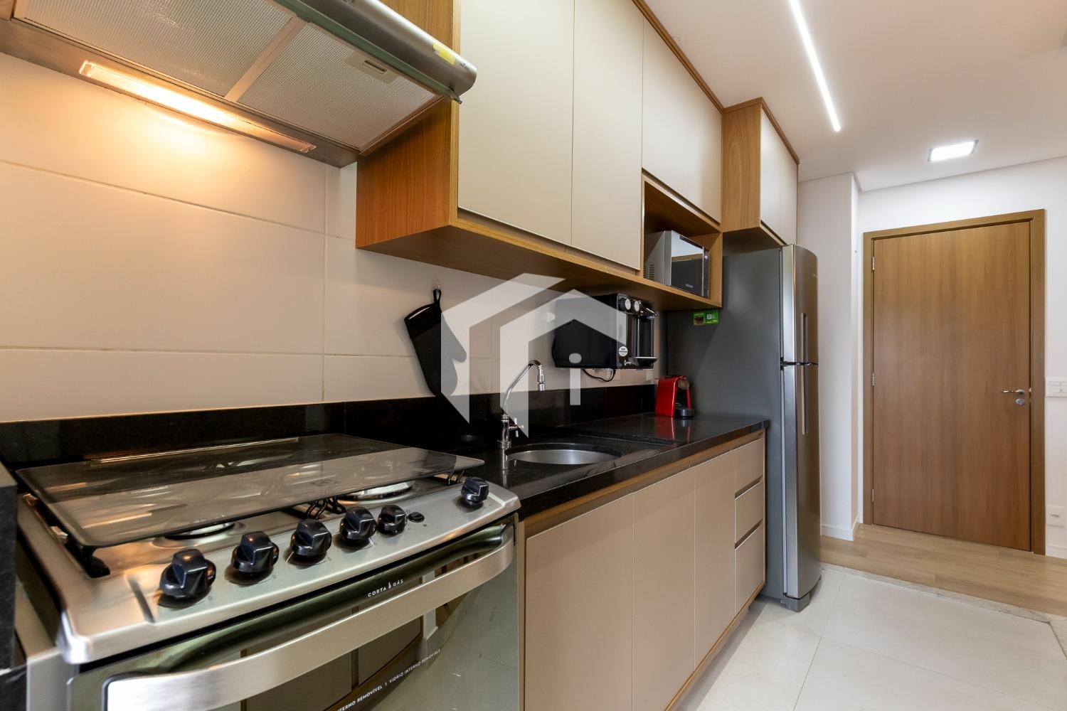 Sala para 2 ambientes com varanda, cozinha equipada com fogão embutido, geladeira, purificador de água, micro-ondas, lavadora de roupas, além de mesa sob medida.