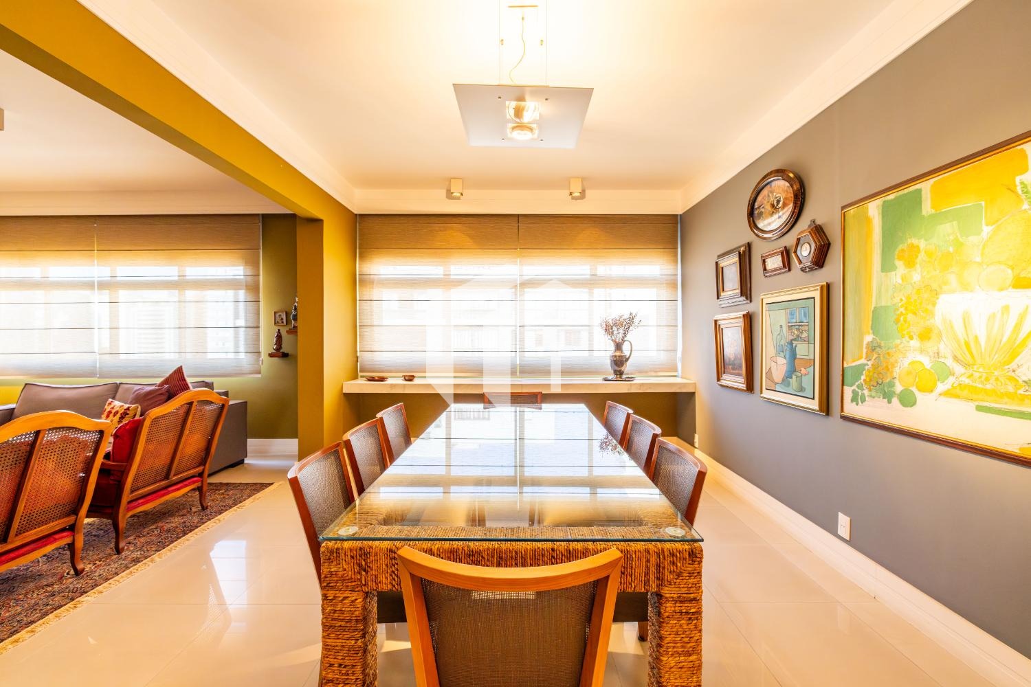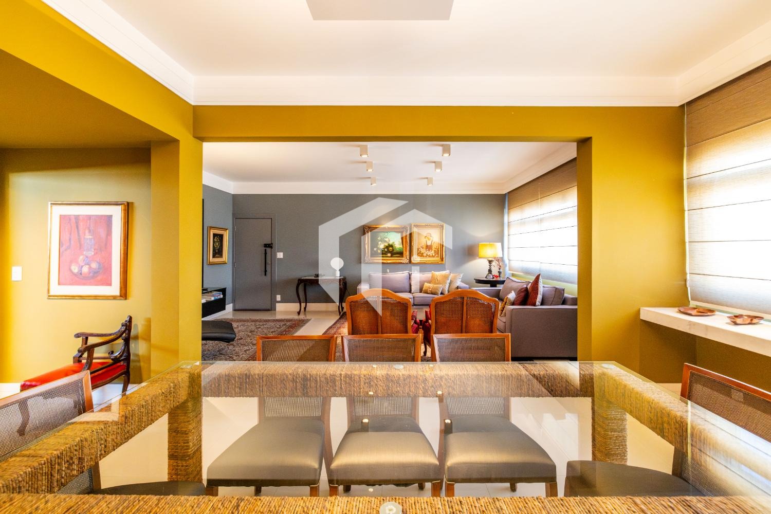 Sala de estar integrada à sala de jantar, criando um ambiente amplo e acolhedor.