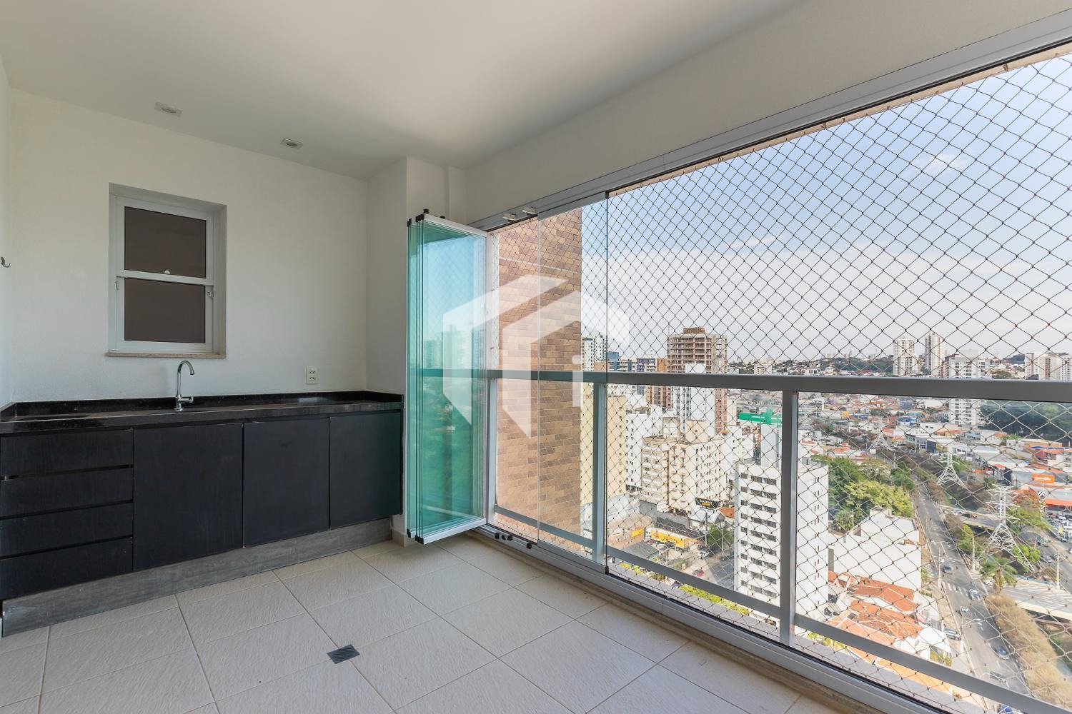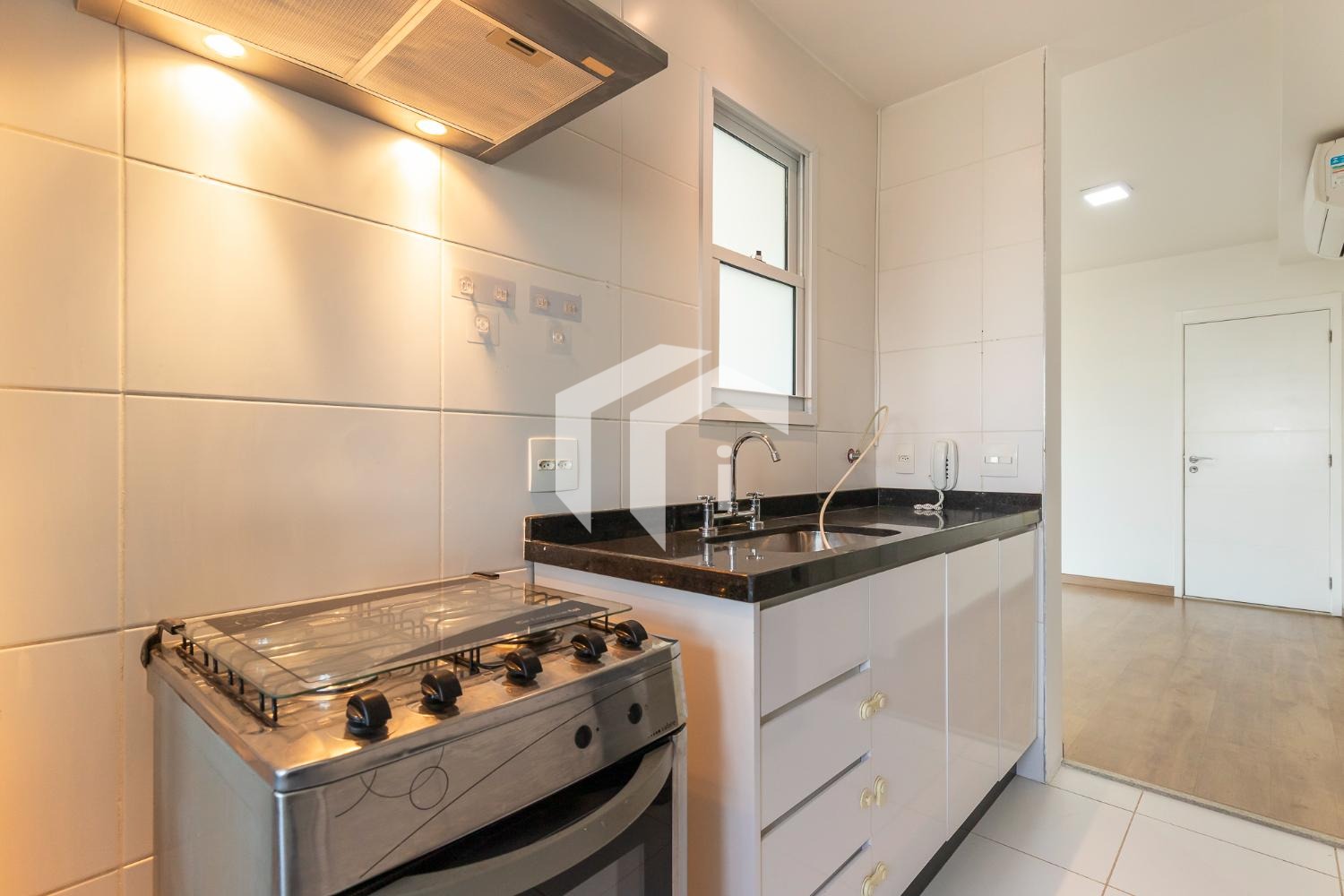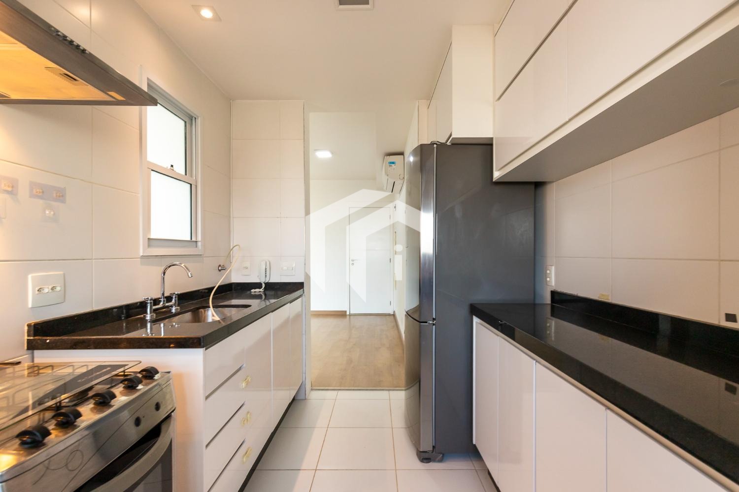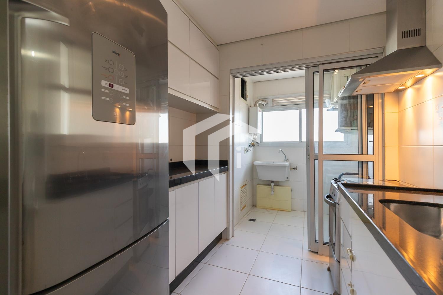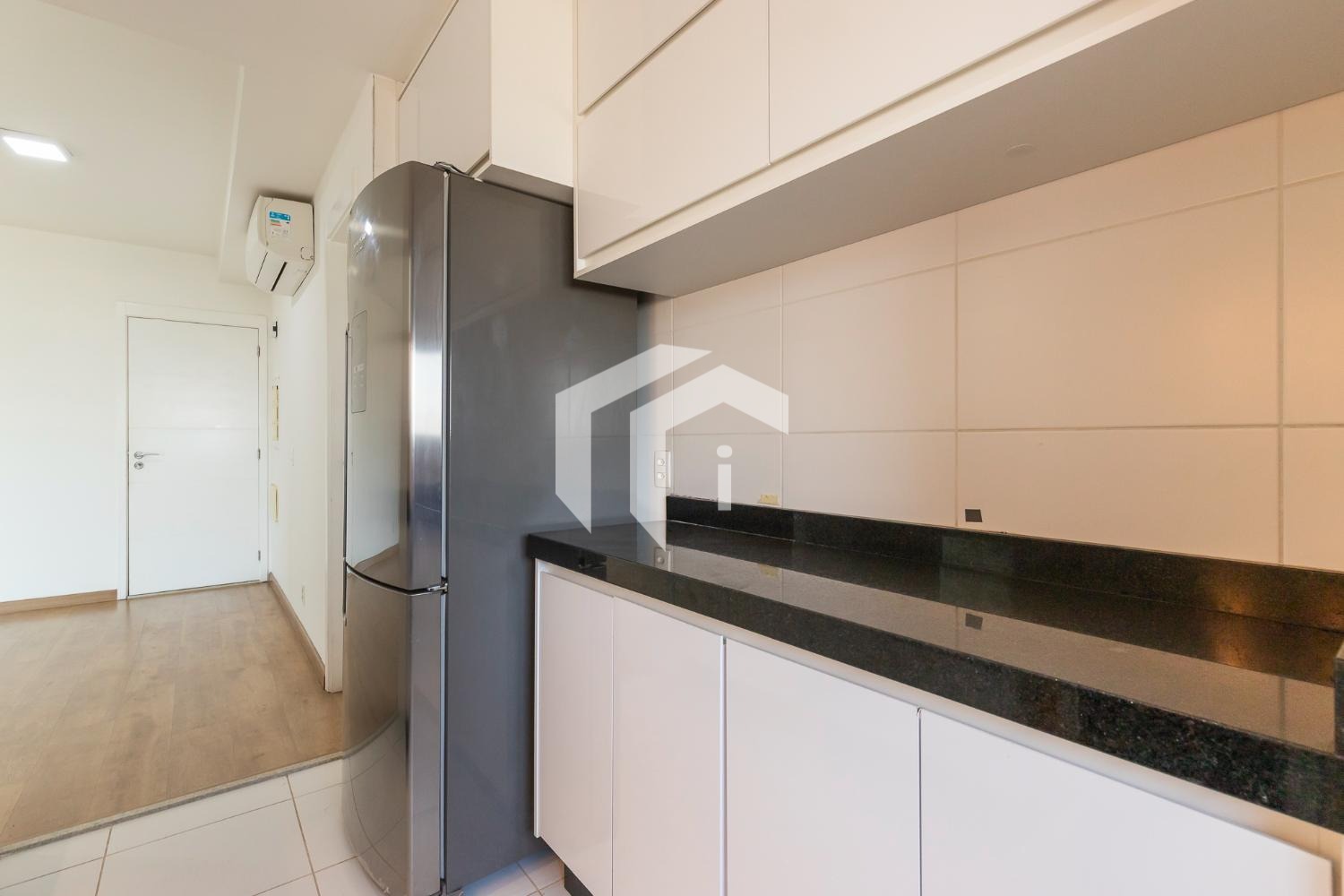 Living para 2 ambientes climatizada, integrando a varanda com fechamento de vidro, lavabo, cozinha com planejados, geladeira e fogão.