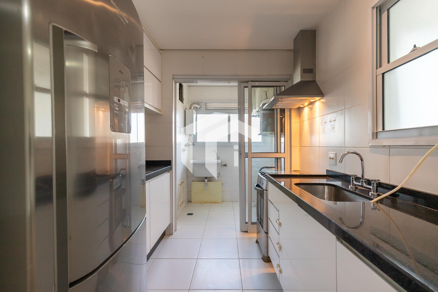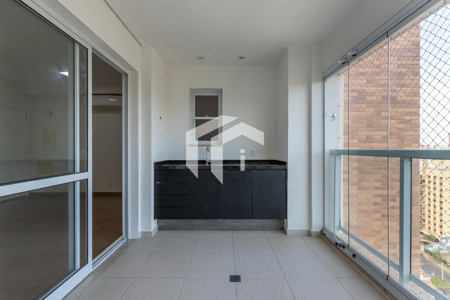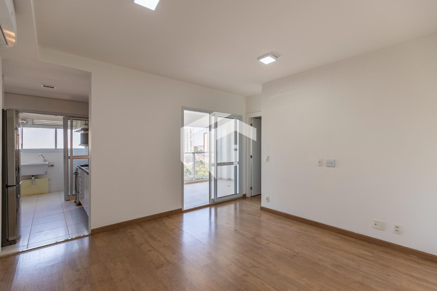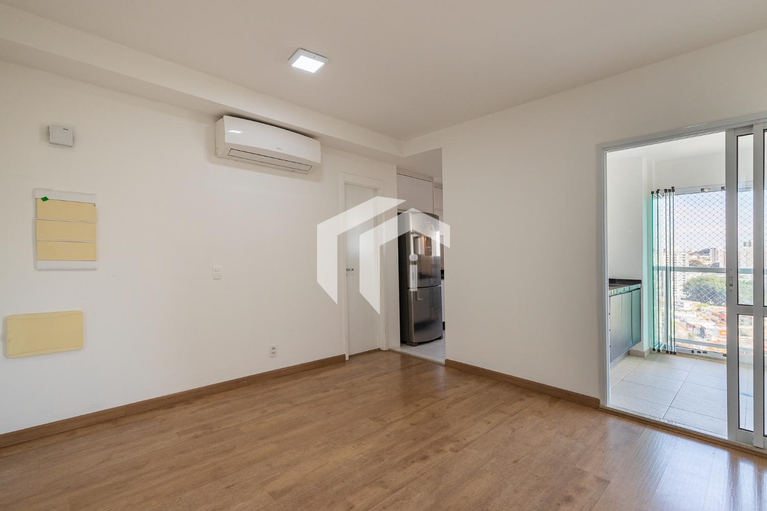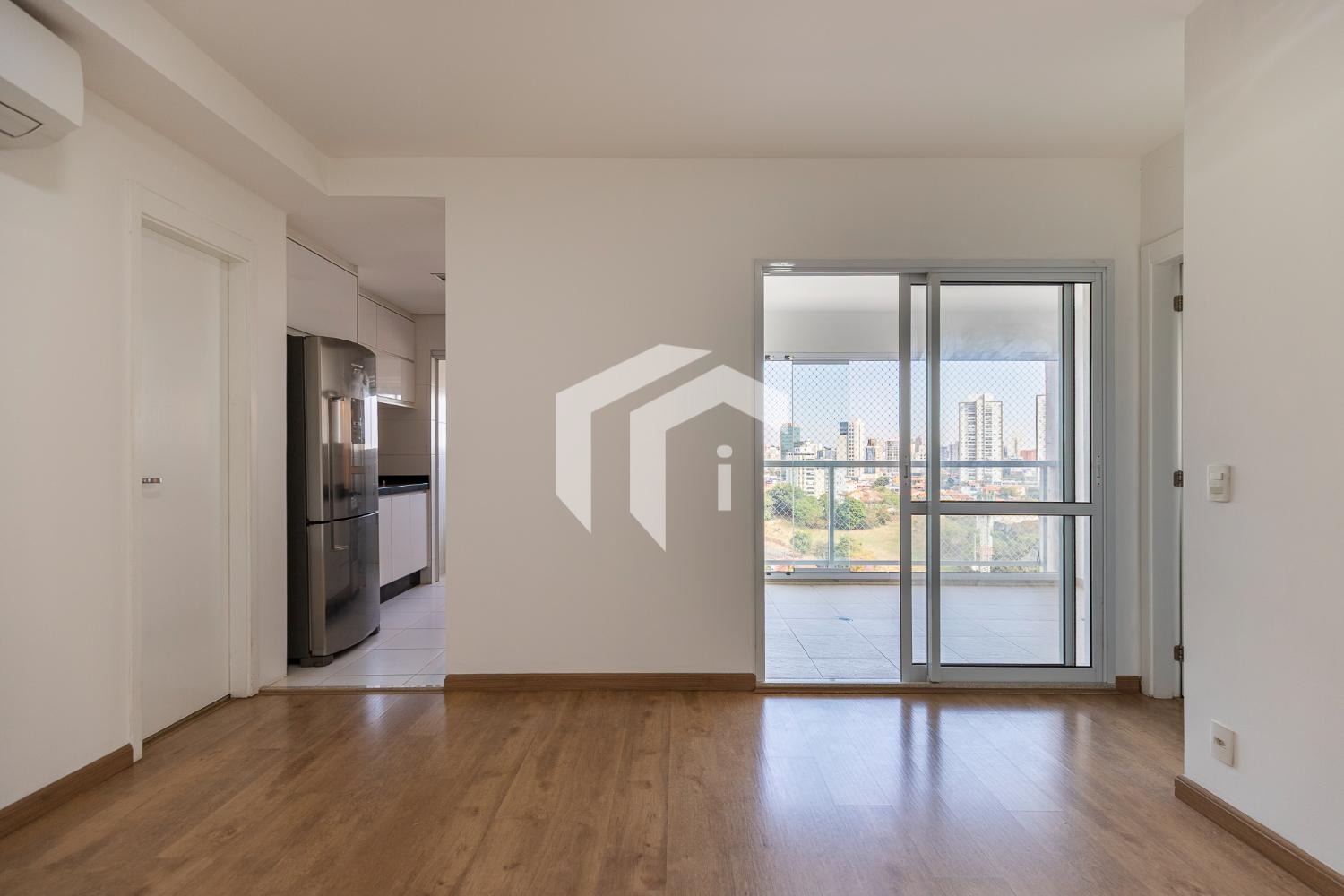 Living para 2 ambientes climatizada, integrando a varanda com fechamento de vidro, lavabo, cozinha com planejados, geladeira e fogão.