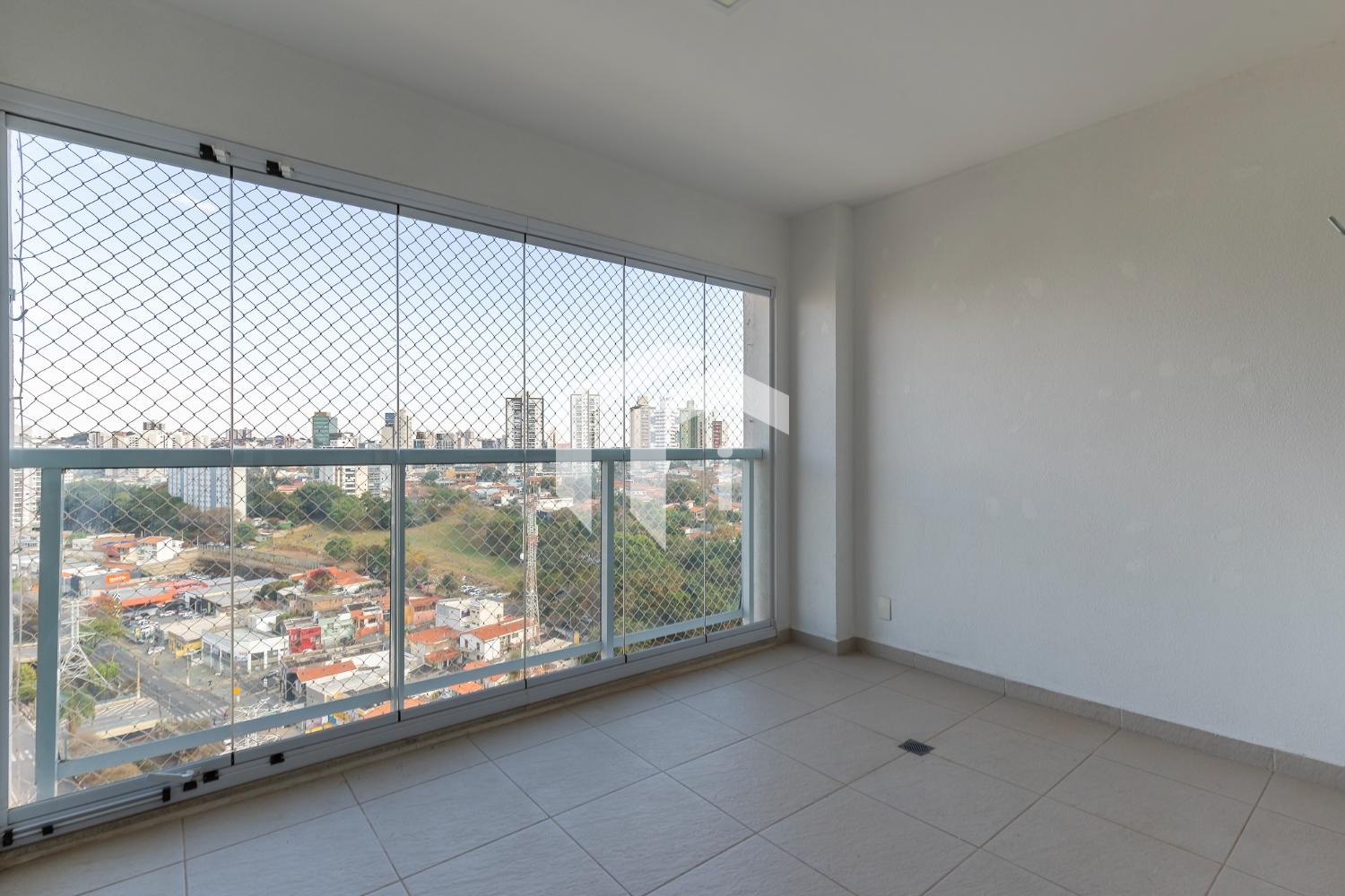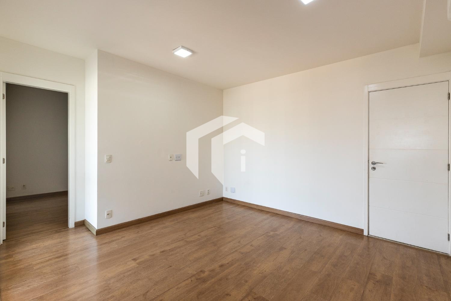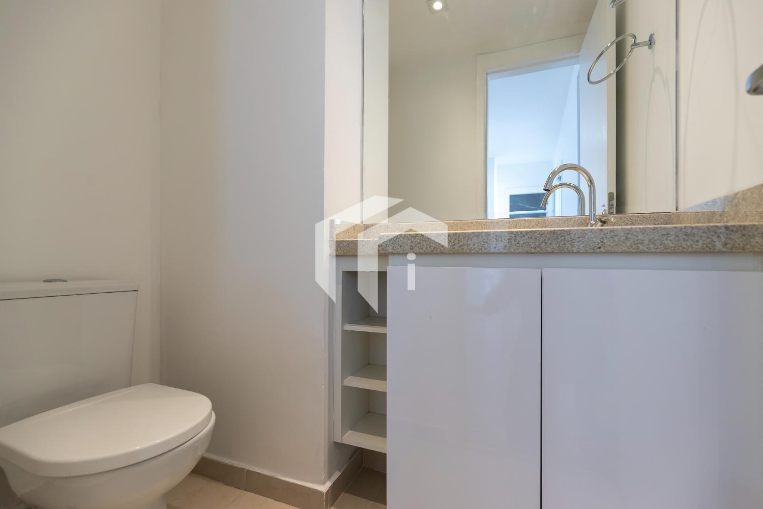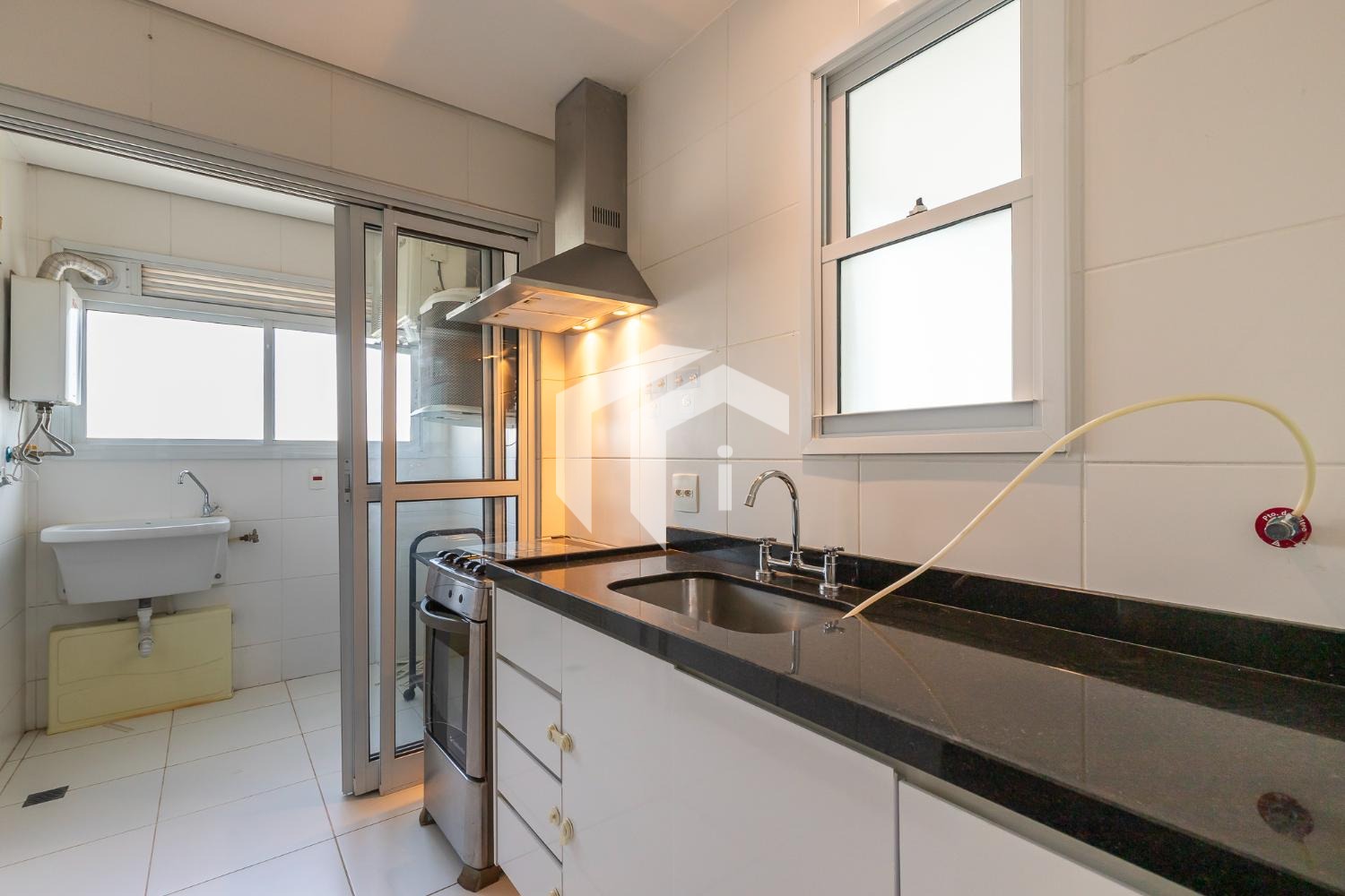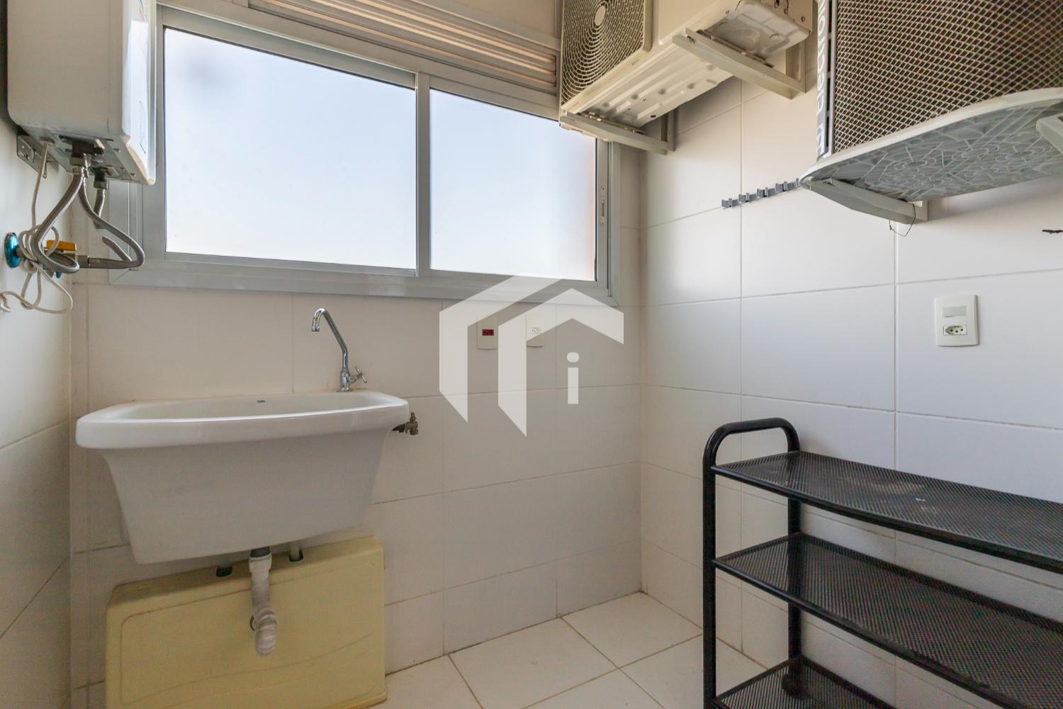 Living para 2 ambientes climatizada, integrando a varanda com fechamento de vidro, lavabo, cozinha com planejados, geladeira e fogão.