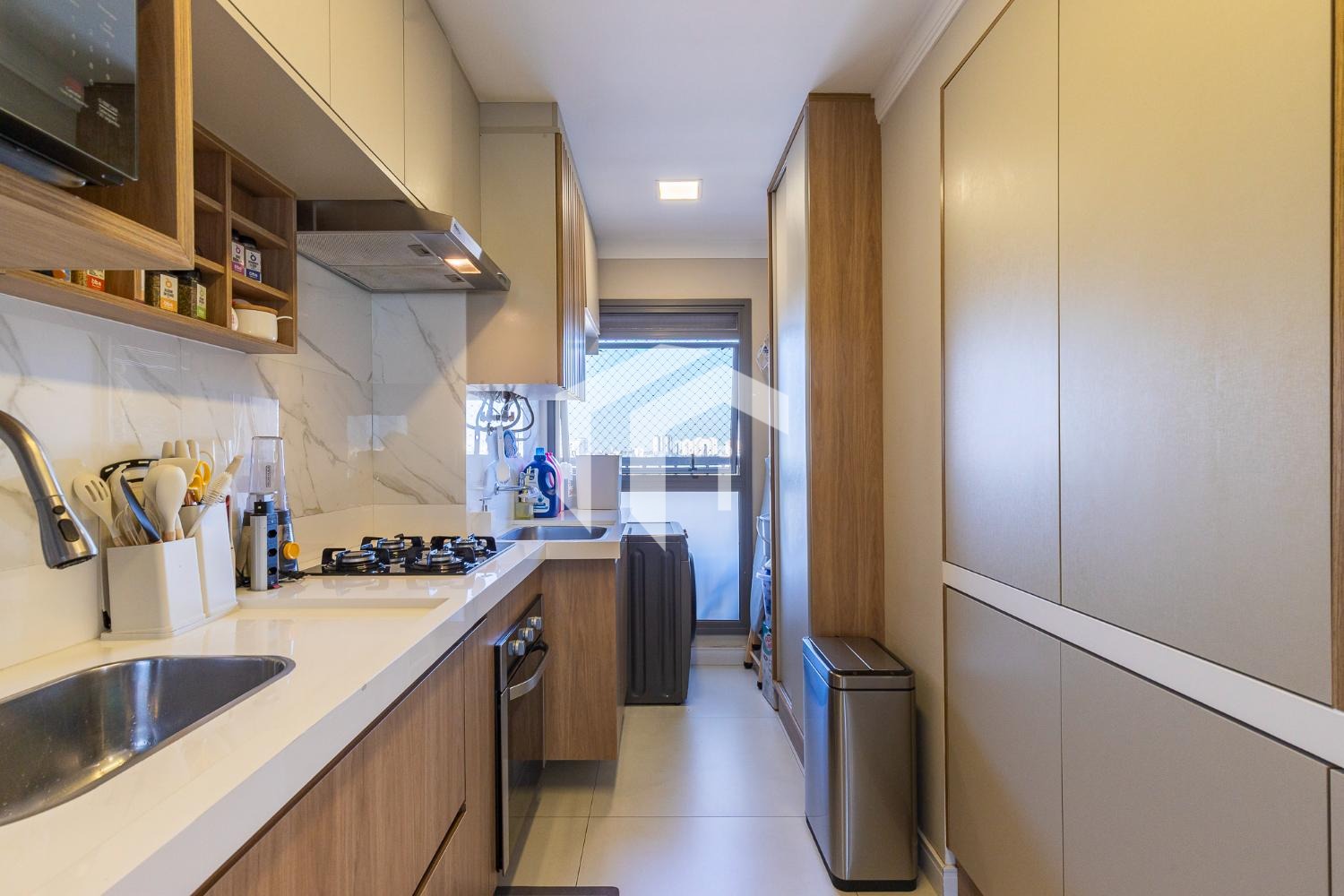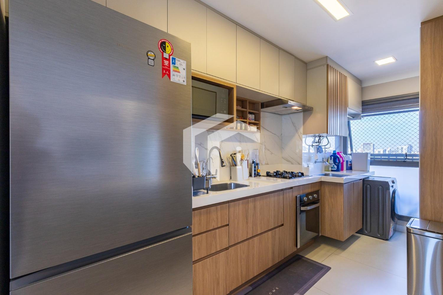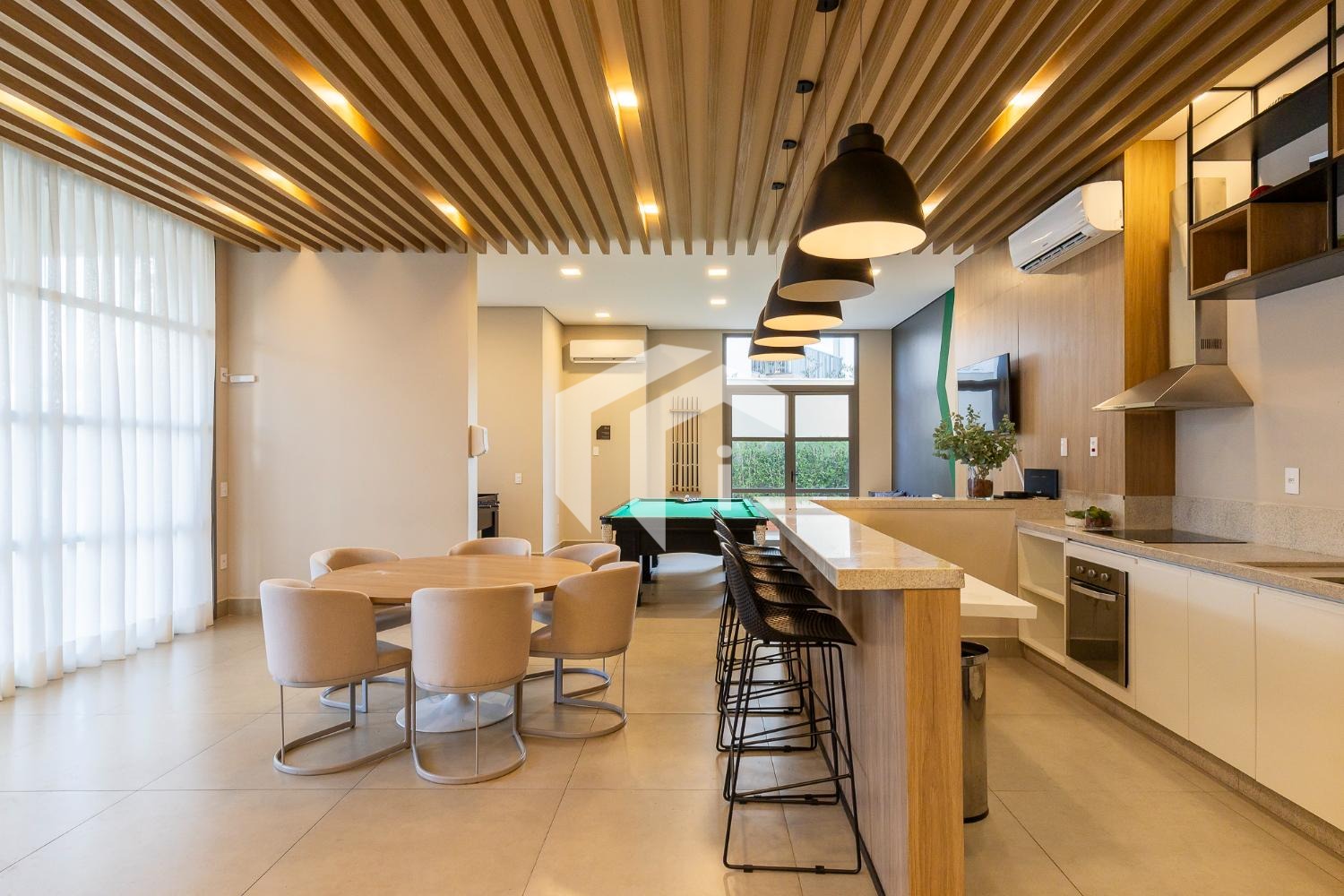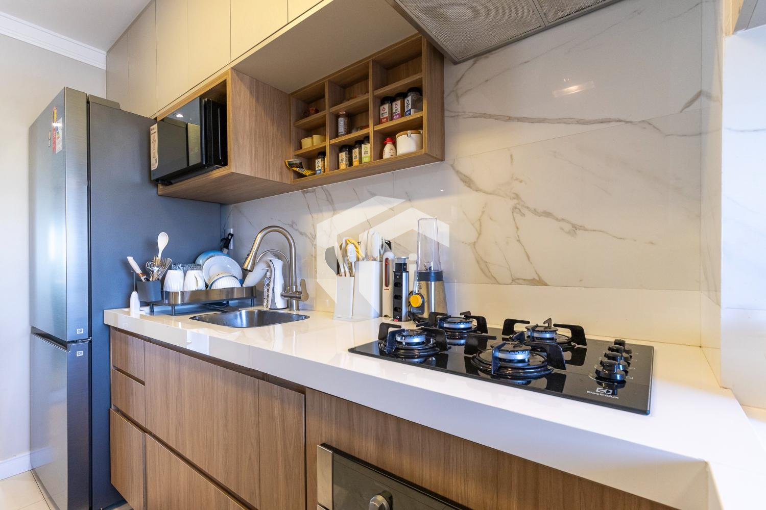 • Cozinha aberta equipada com armários de alta qualidade e design sofisticado.