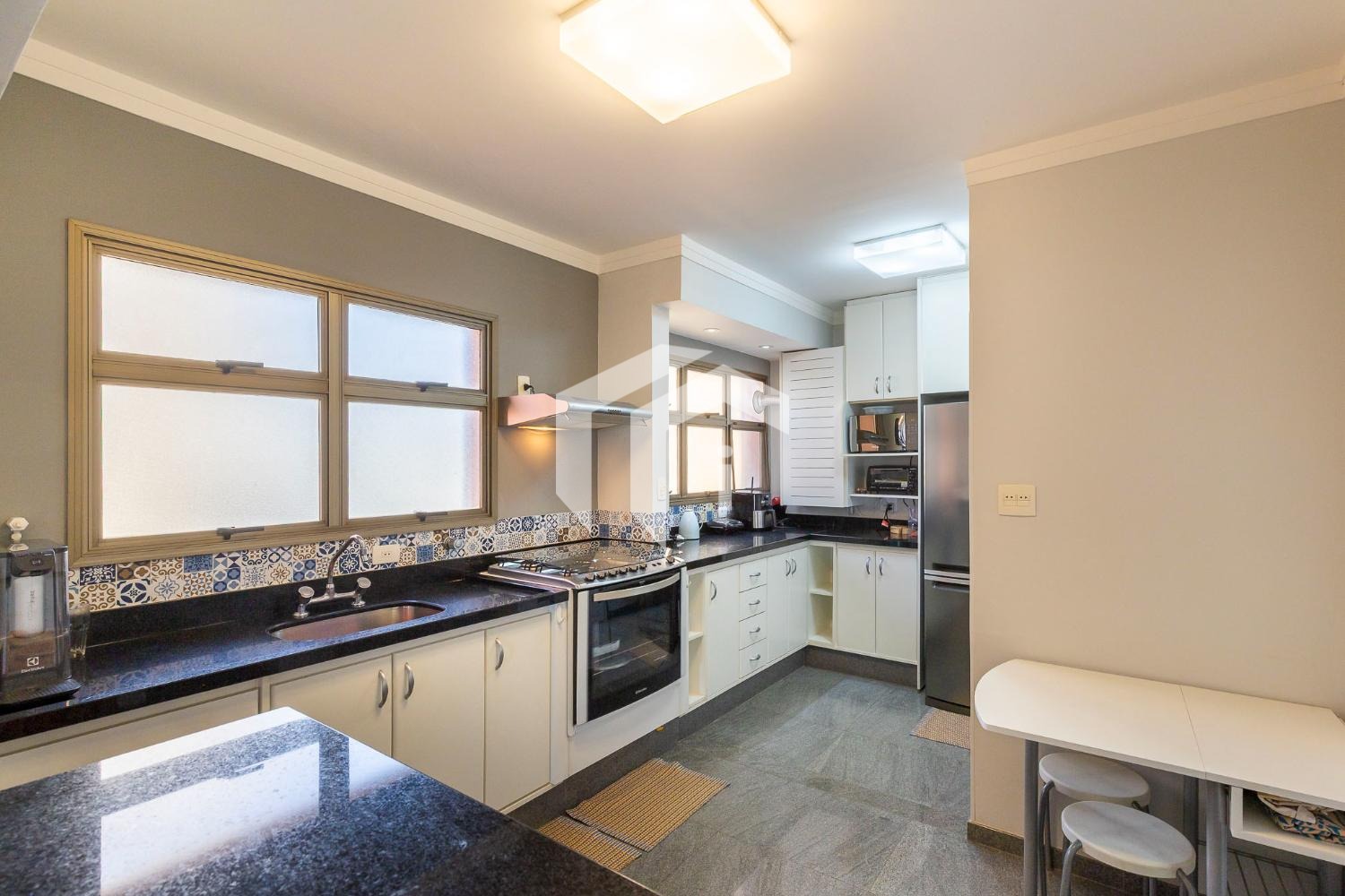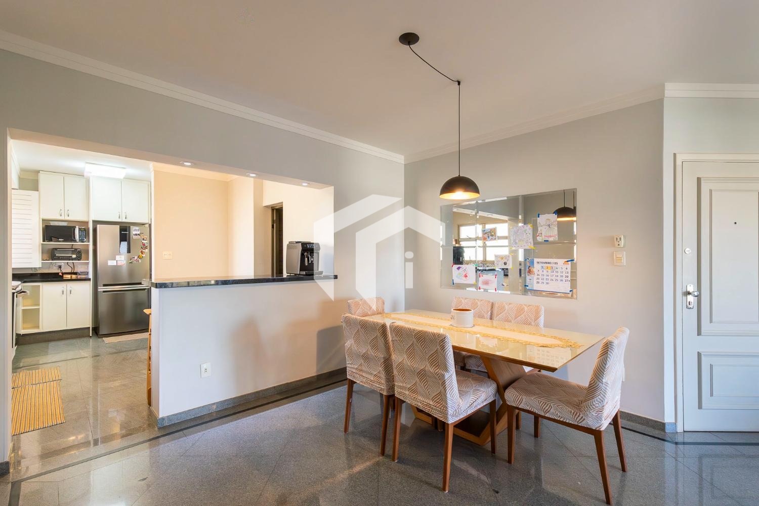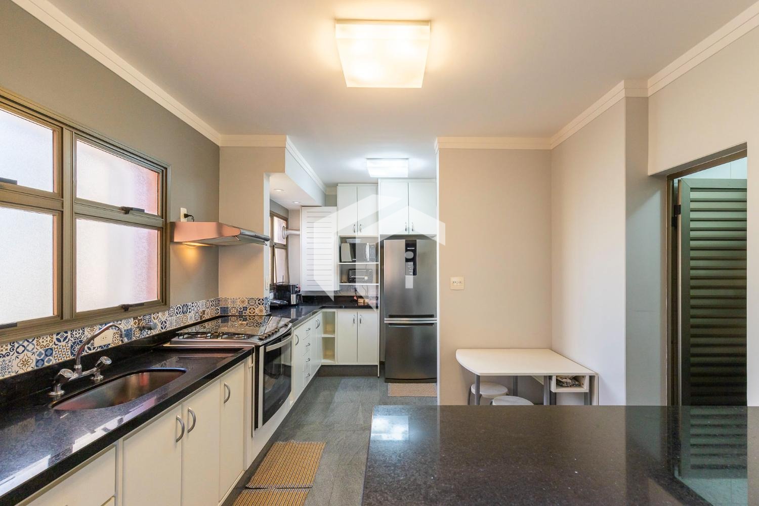 Tudo integrado a uma convidade cozinha americana, repleta de planejados e com despensa.