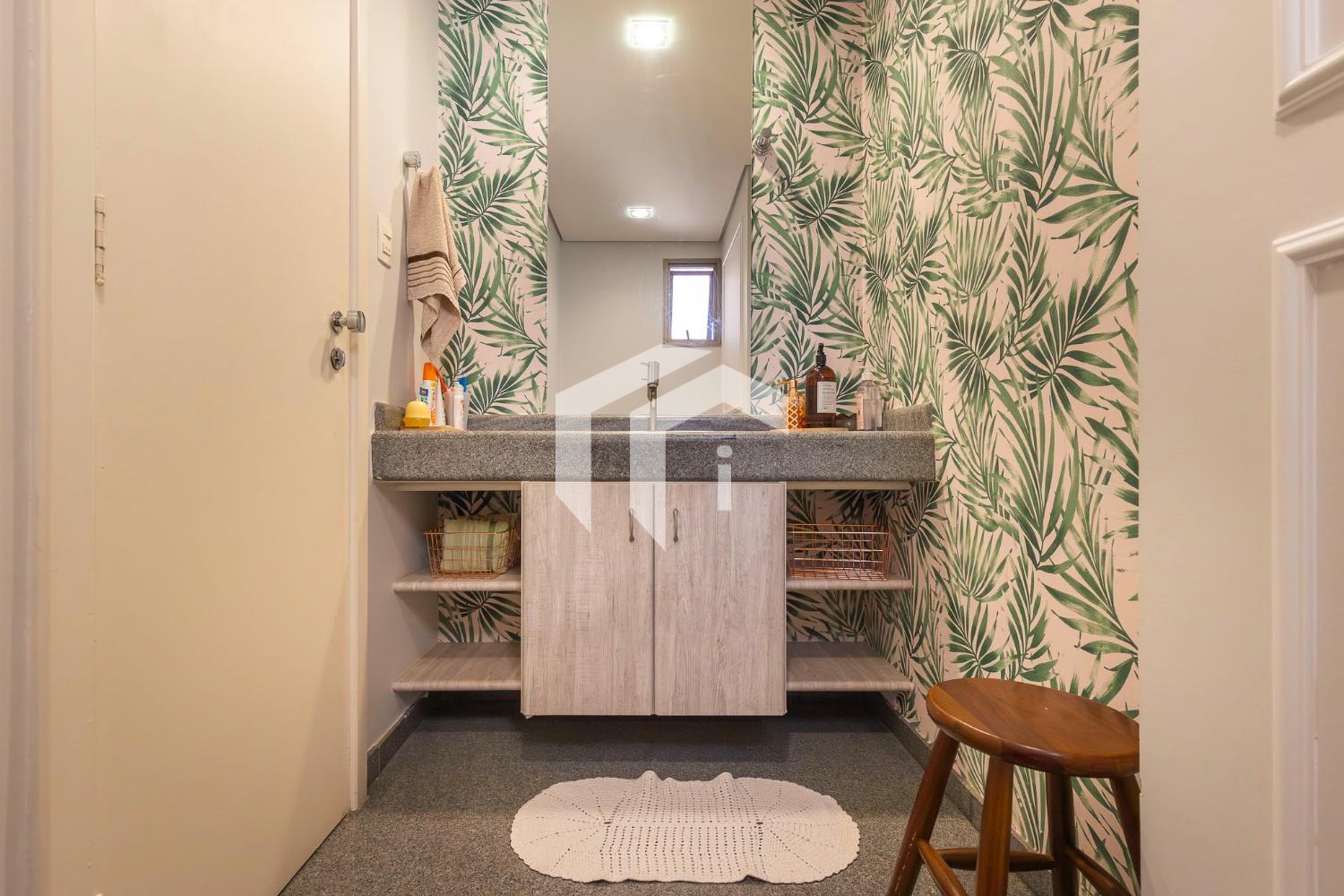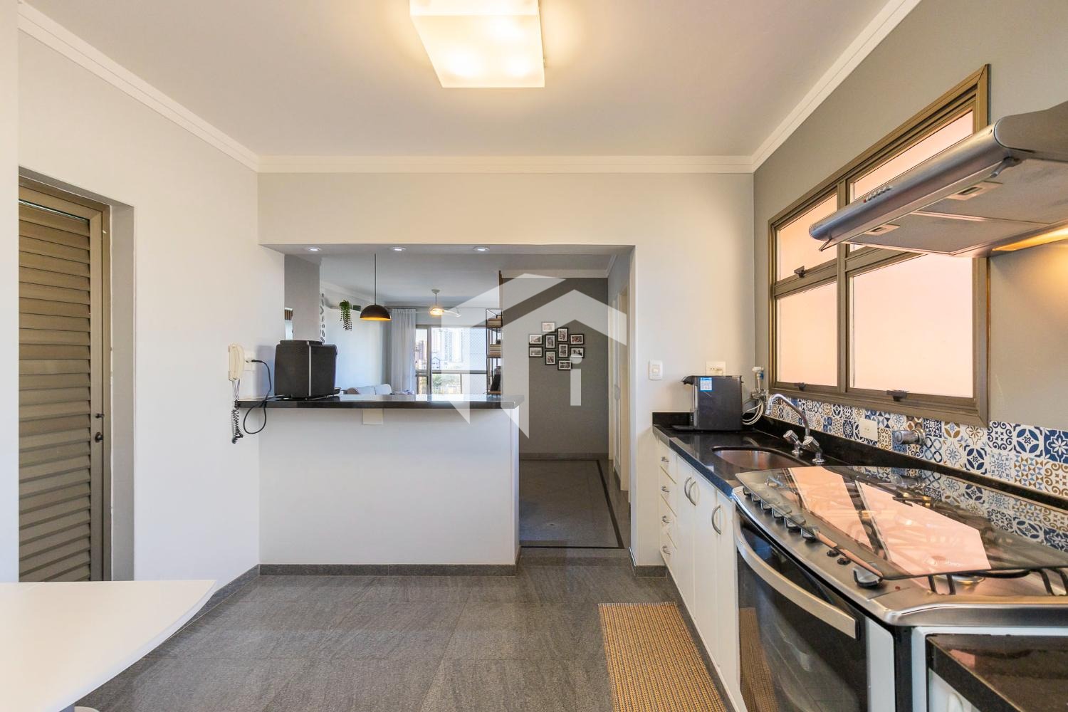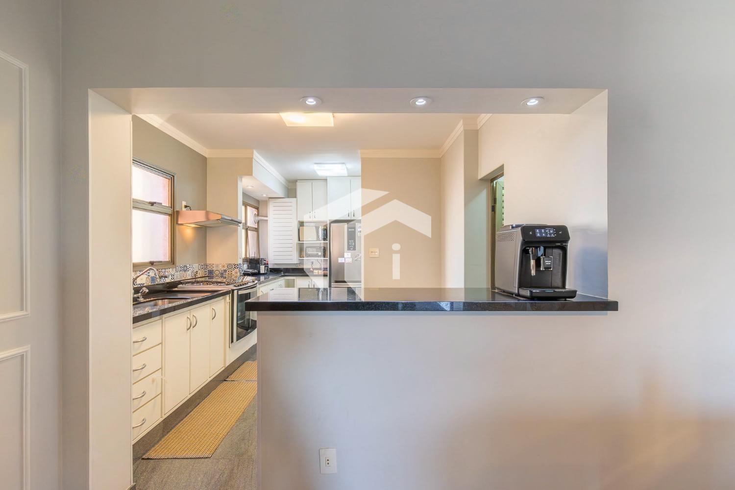 Tudo integrado a uma convidade cozinha americana, repleta de planejados e com despensa.