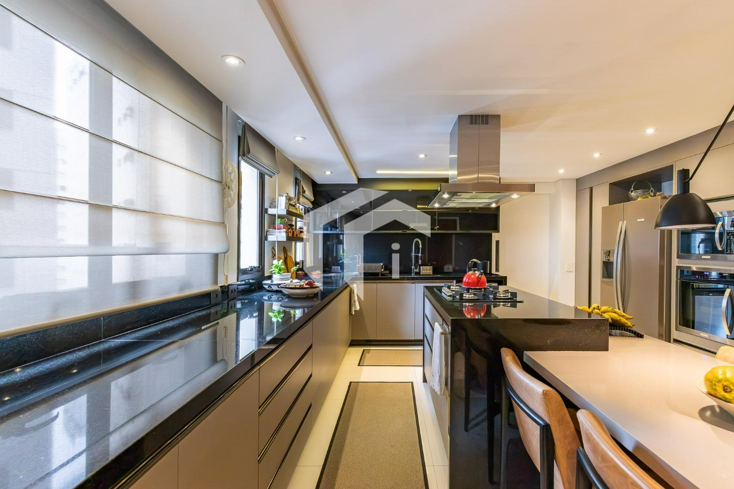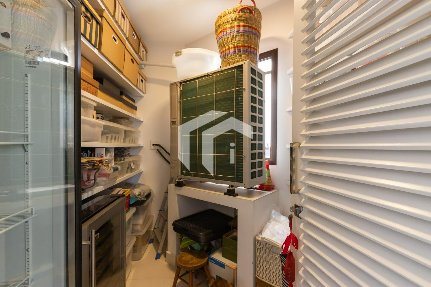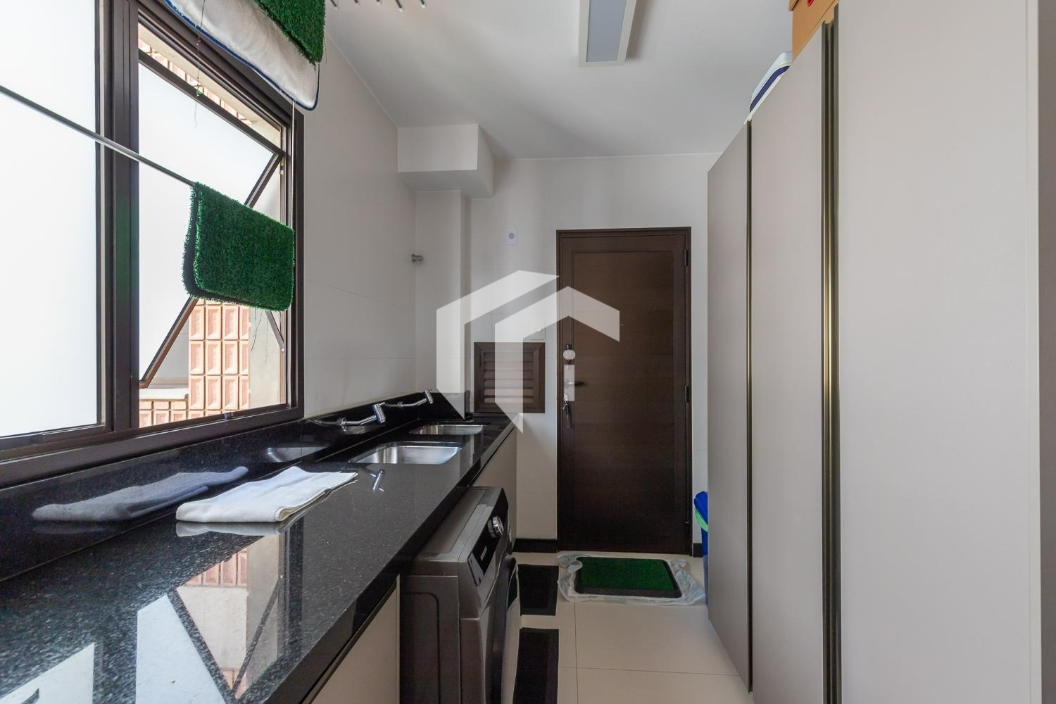 Cozinha equipada com copa de apoio e despensa, além de uma área de serviço completa com dependência.
