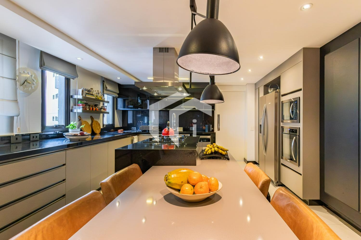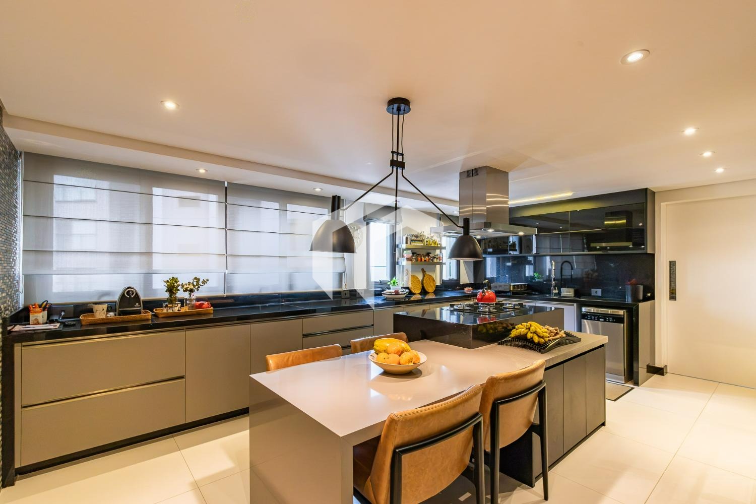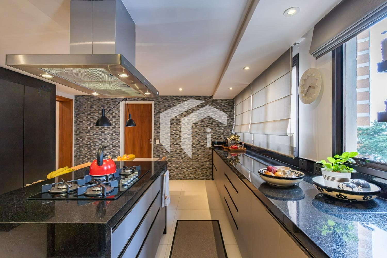 Cozinha equipada com copa de apoio e despensa, além de uma área de serviço completa com dependência.