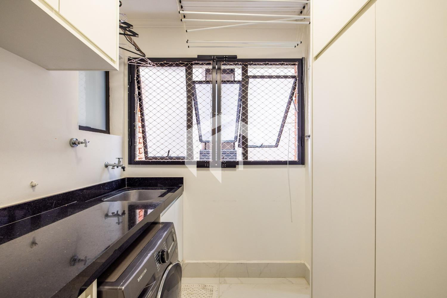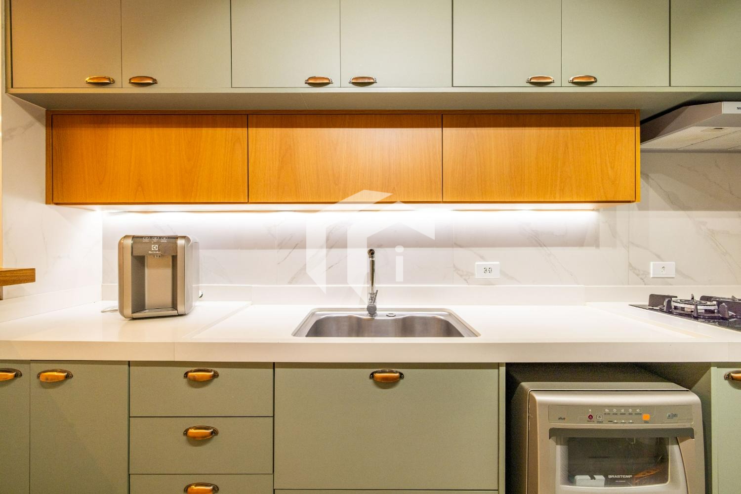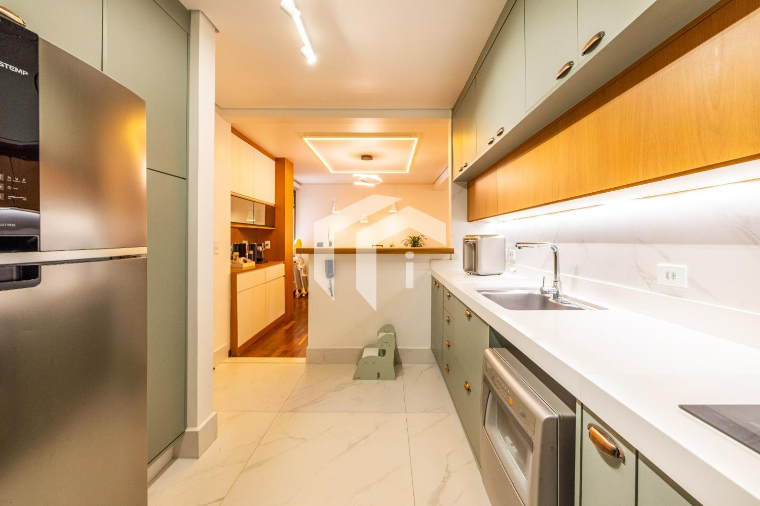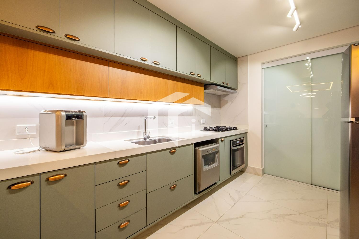 Cozinha americana finamente planejada e equipada e área de serviço com wc.