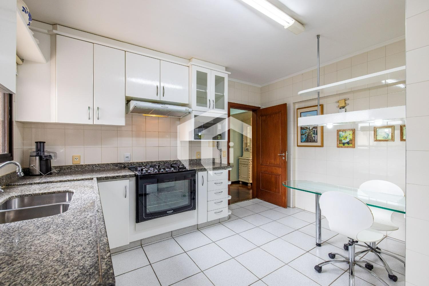 Ampla cozinha planejada com copa de apoio e área de serviço com wc.