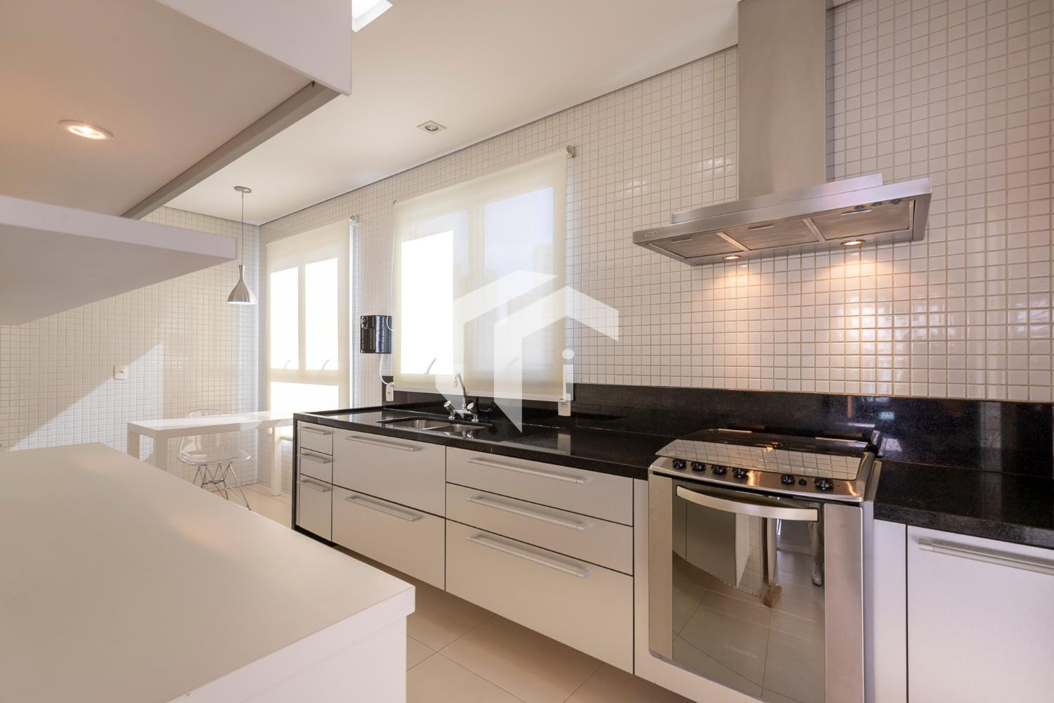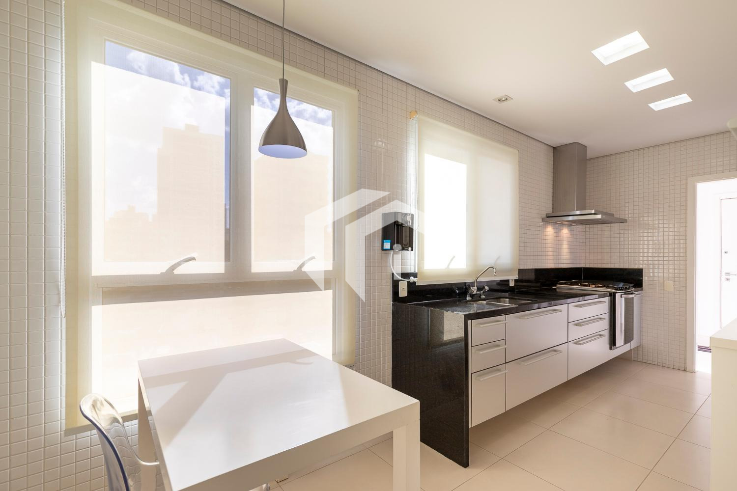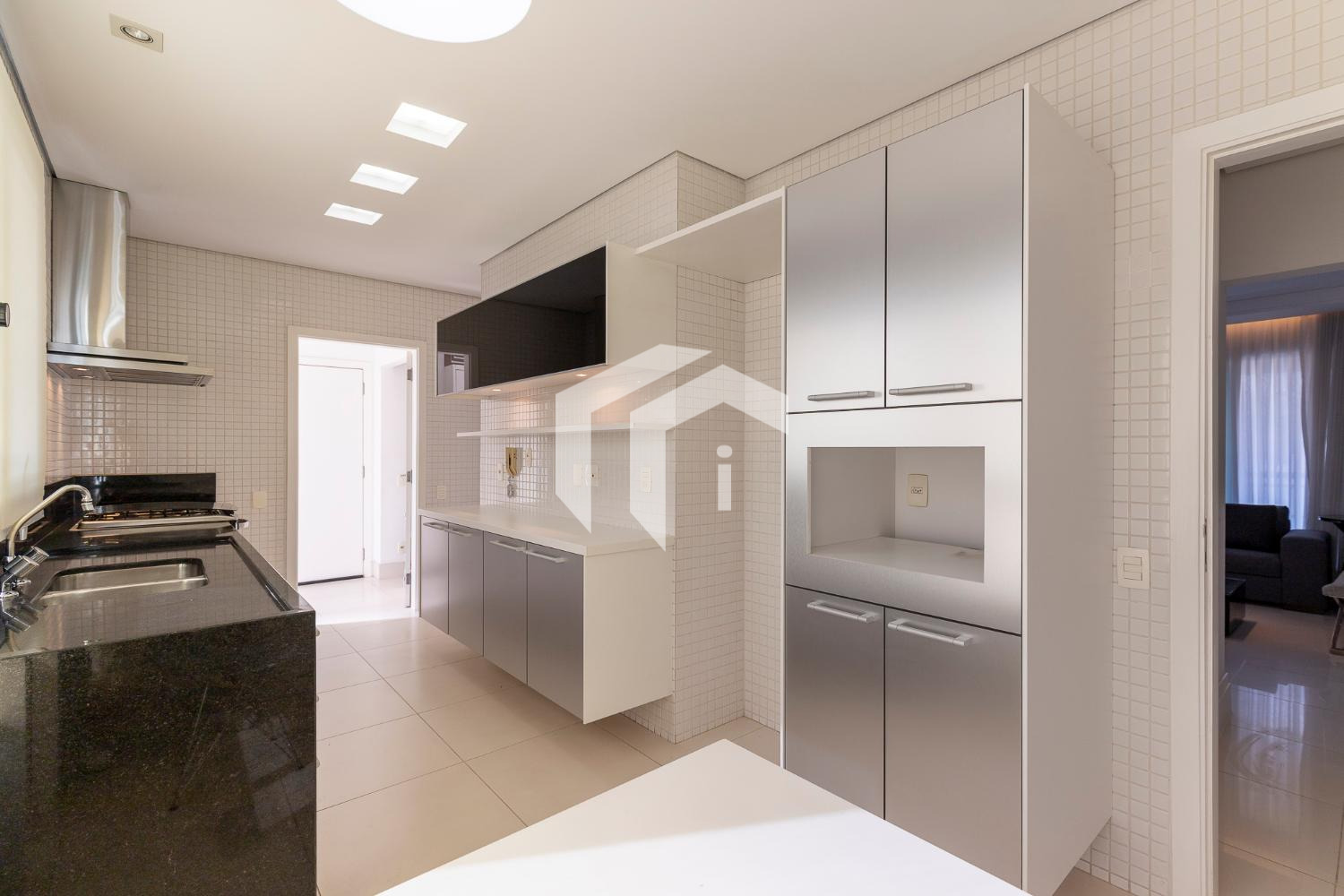 Cozinha planejada e repleta de armários com copa de apoio e despensa, e área de serviço wc.