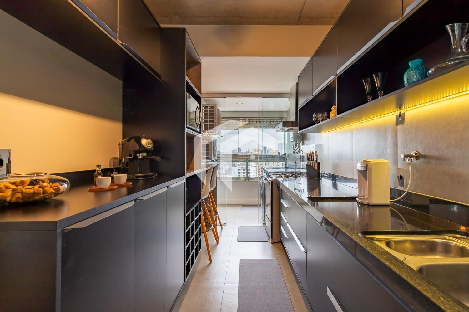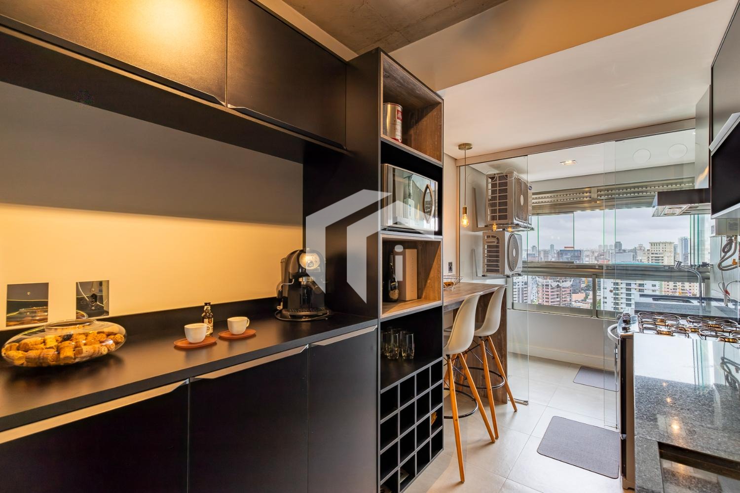 A cozinha planejada e integrada à área de serviço reforça o estilo prático e funcional, mantendo o conceito contemporâneo do imóvel.