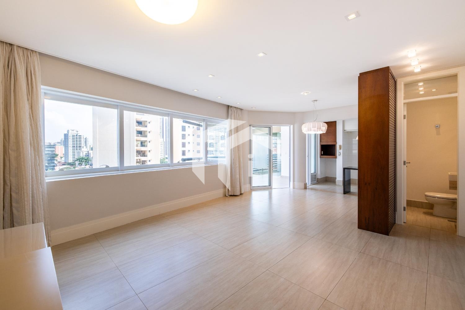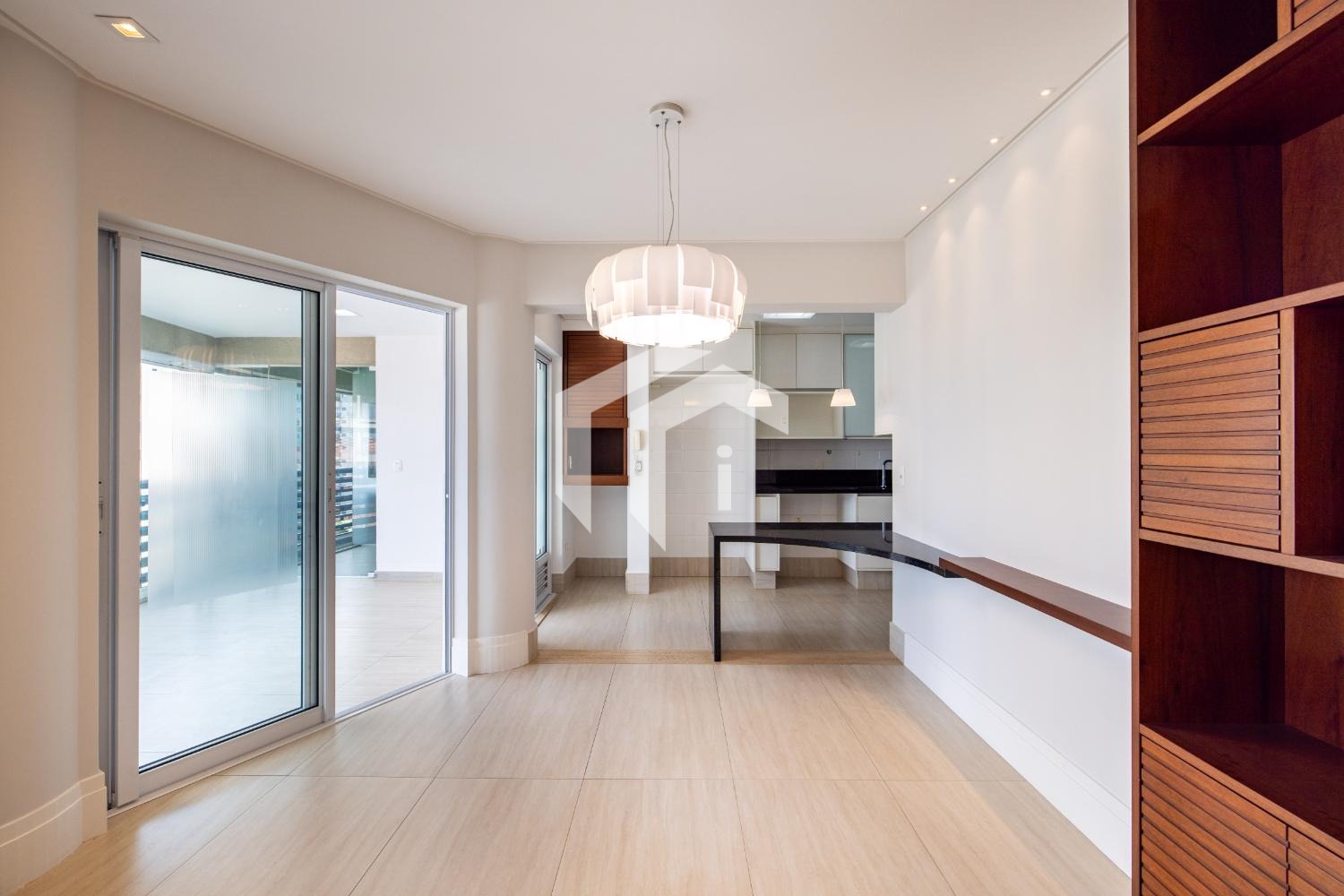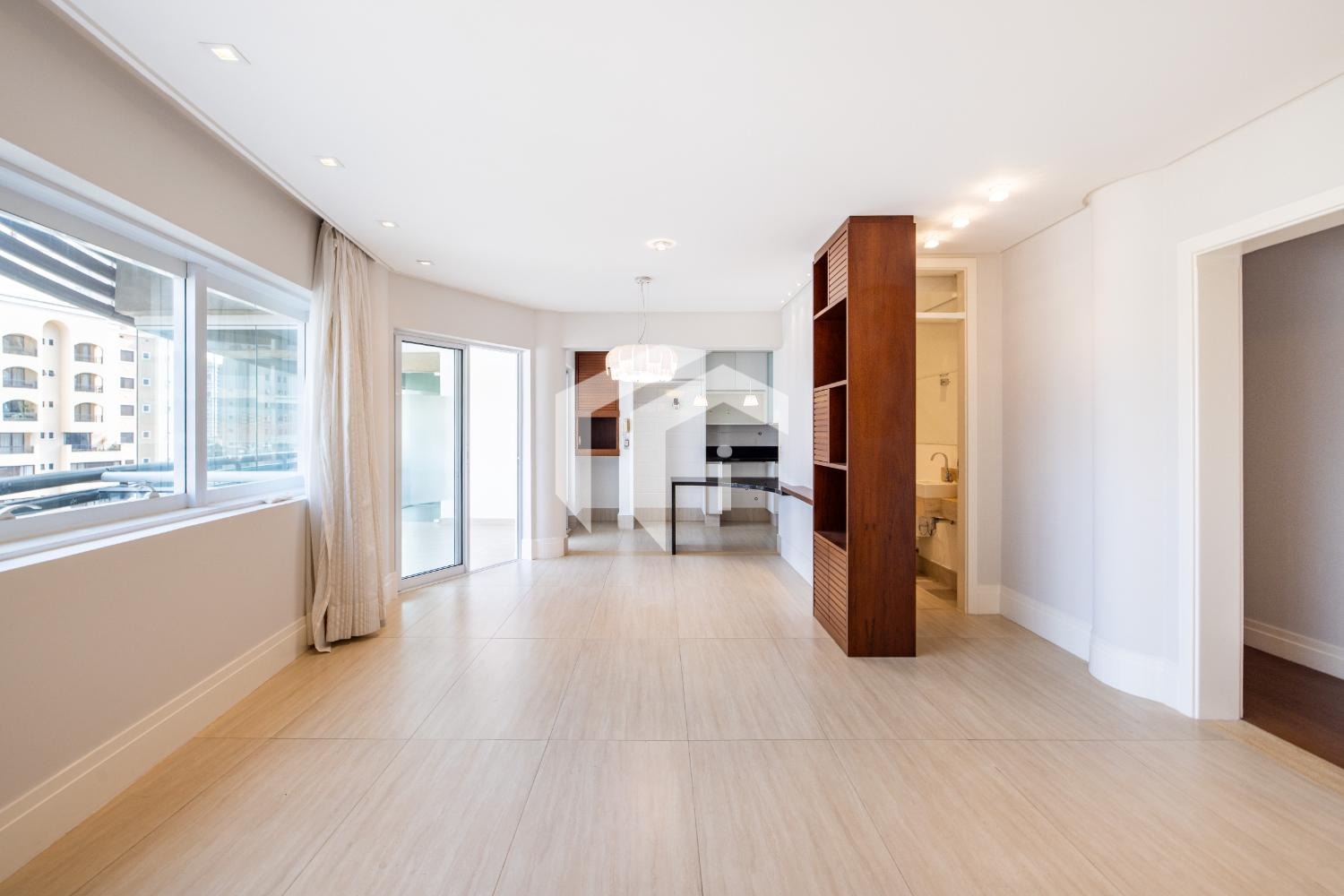 Sala ampla para 3 ambientes, com ar-condicionado, lavabo e integrada à varanda gourmet, que oferece uma vista agradável e muito conforto, mais, home office.