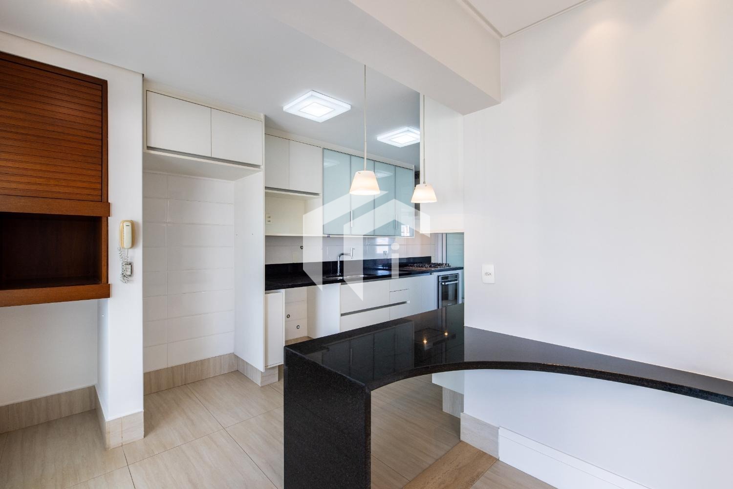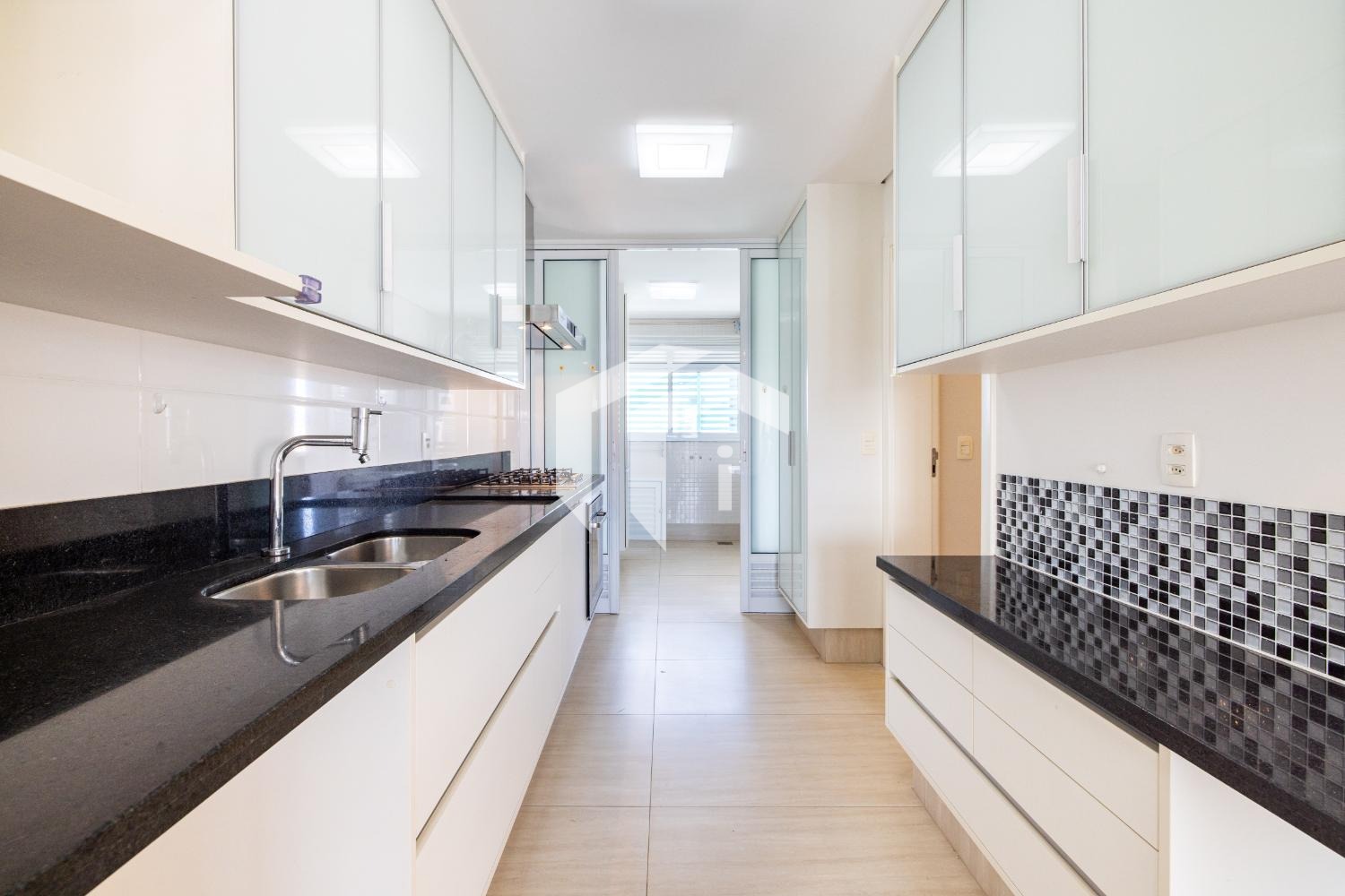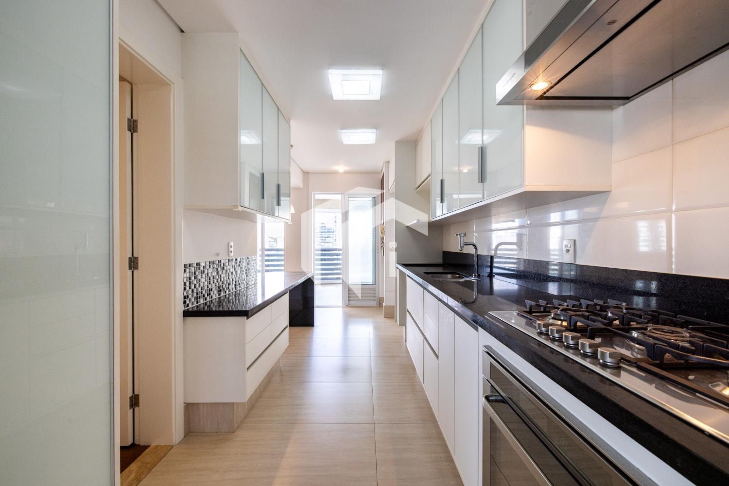 Cozinha completa, equipada com cooktop, forno, coifa e despensa.