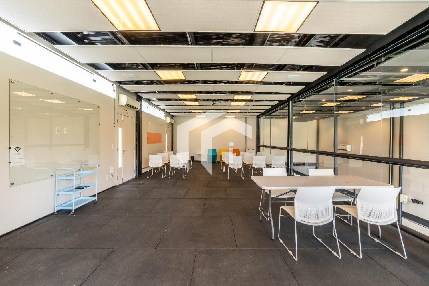 As salas possuem divisórias modulares e podem ser individuais ou conjuntas ou o espaço todo aberto, virando um grande salão.