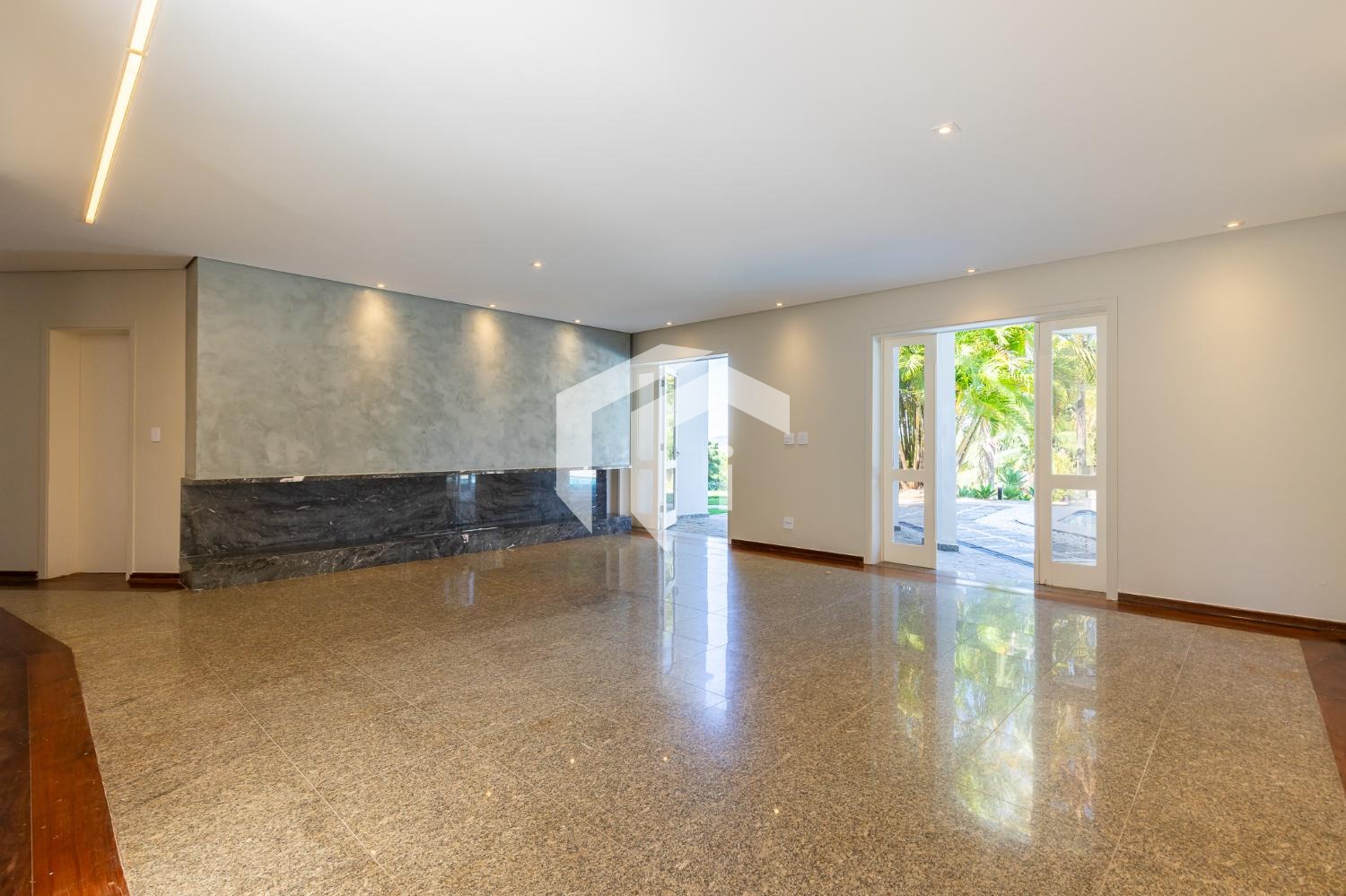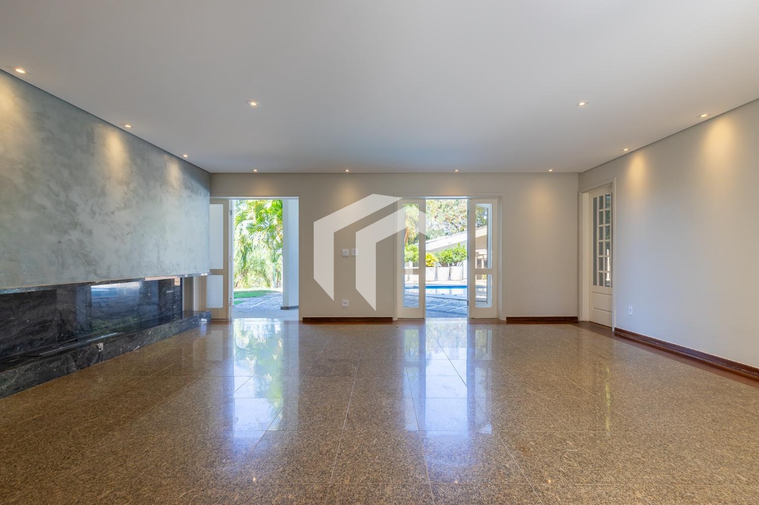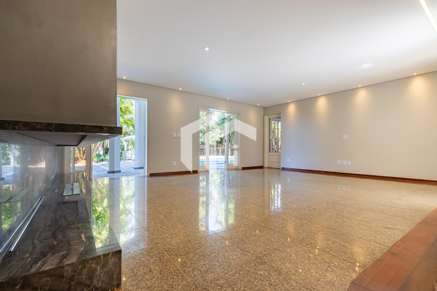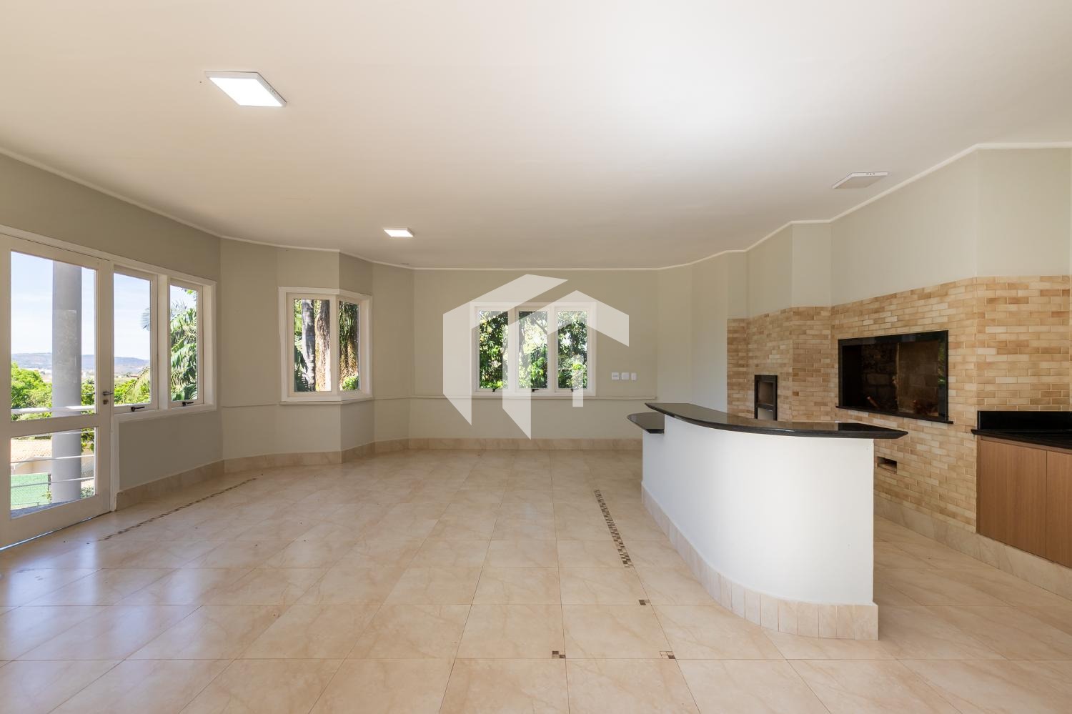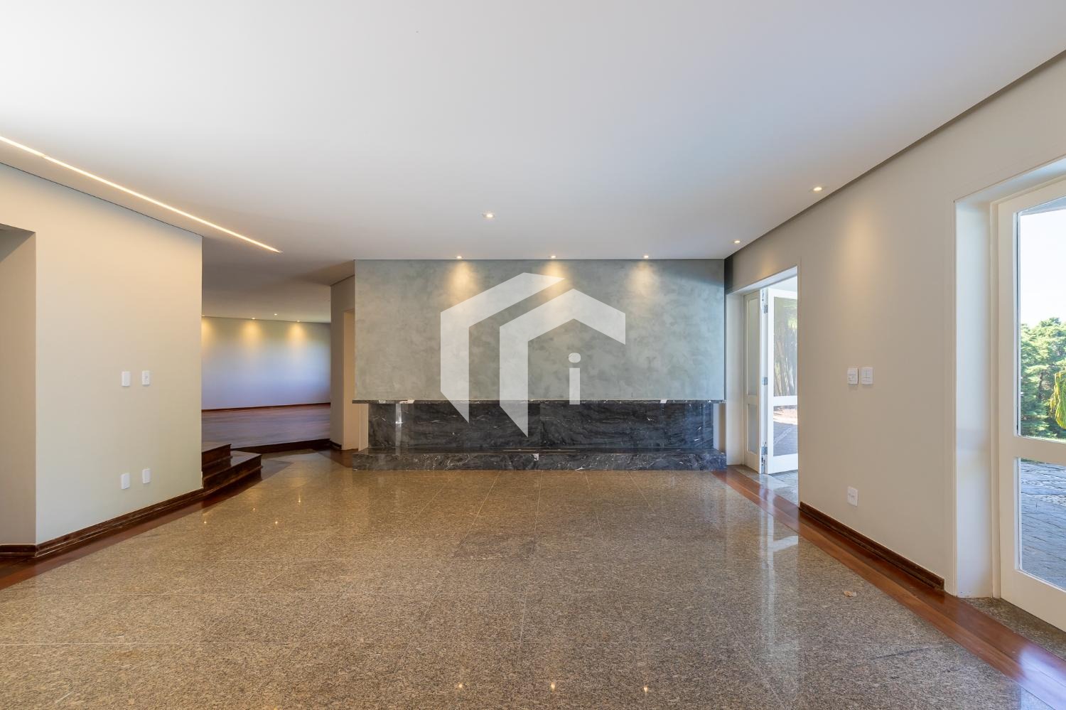 Sala para 4 ambientes com lareira e home theater, lavabo e extensa varanda.