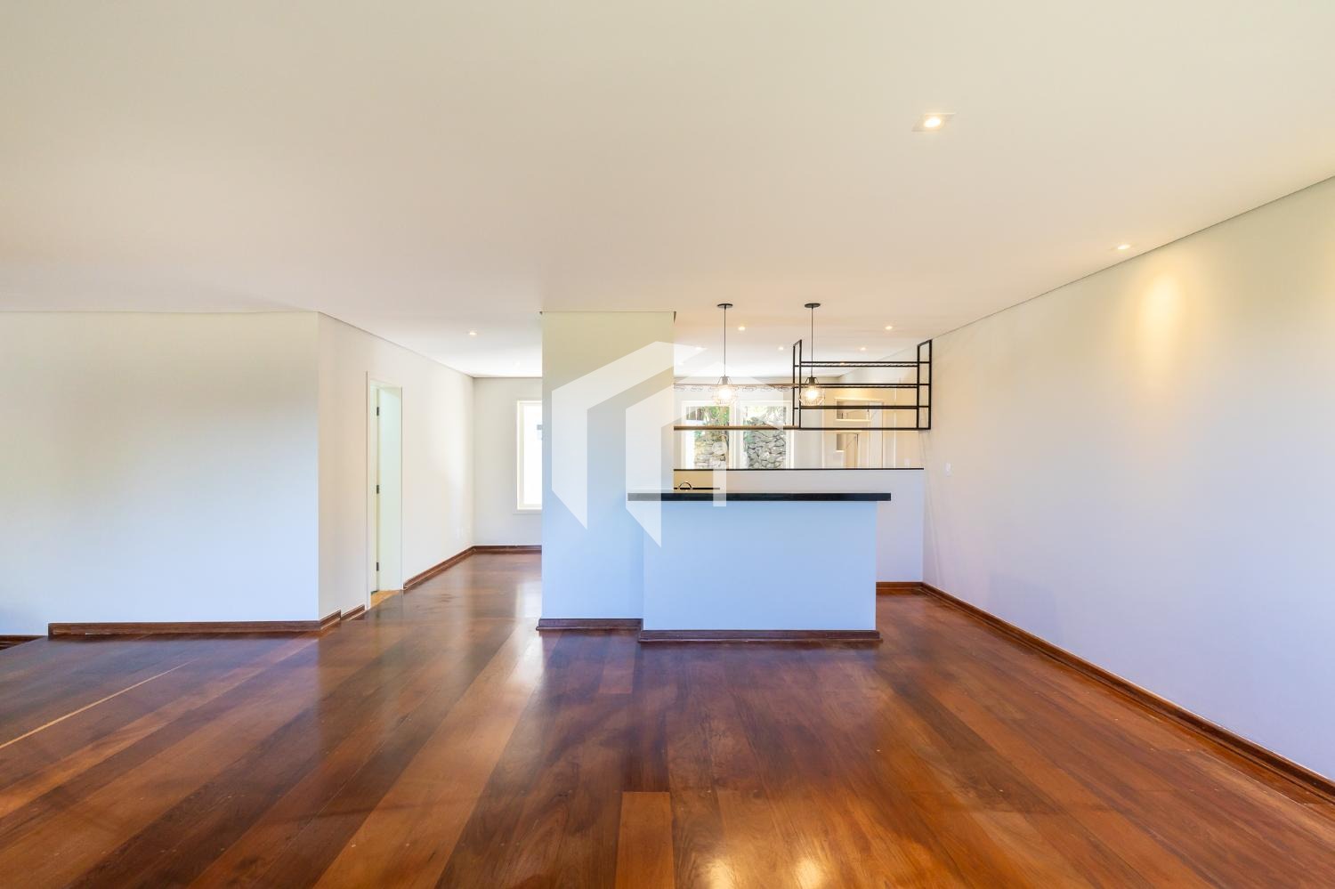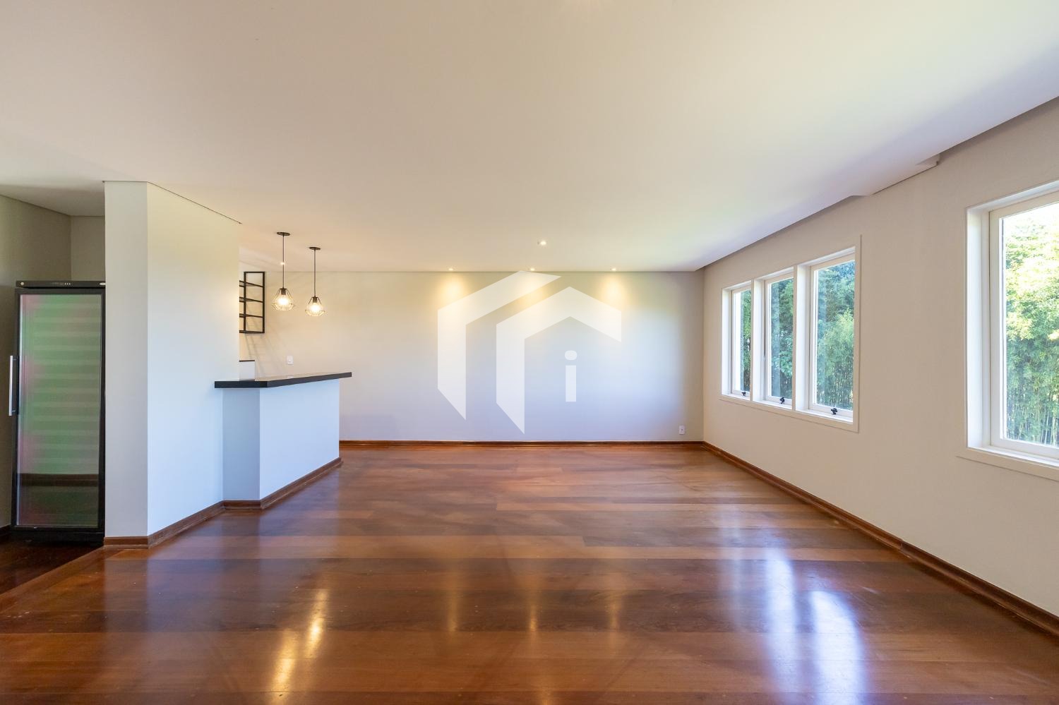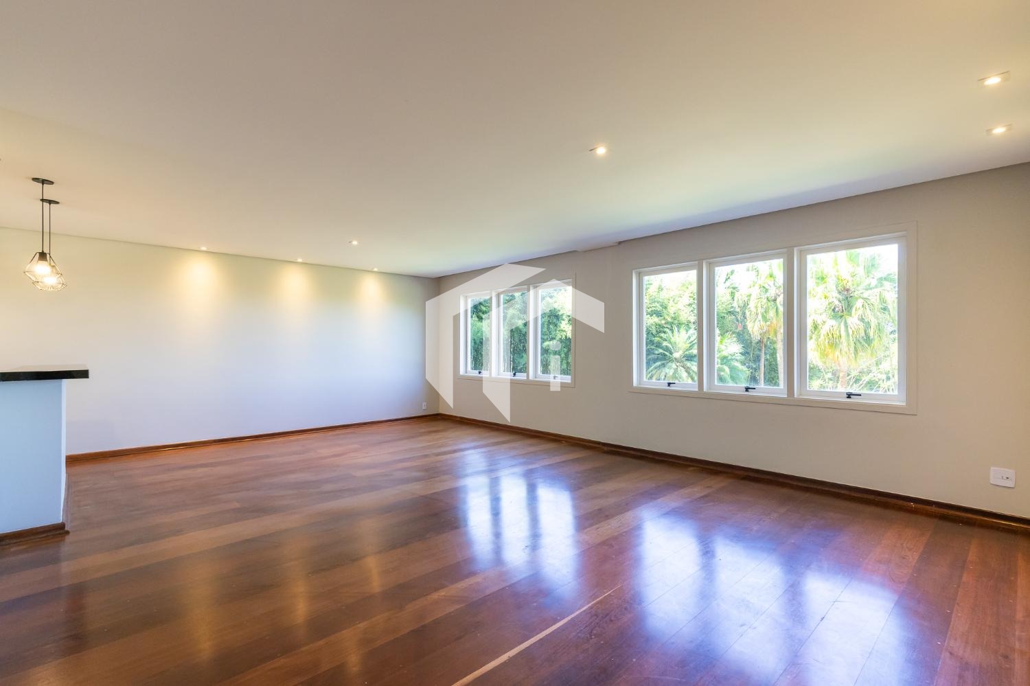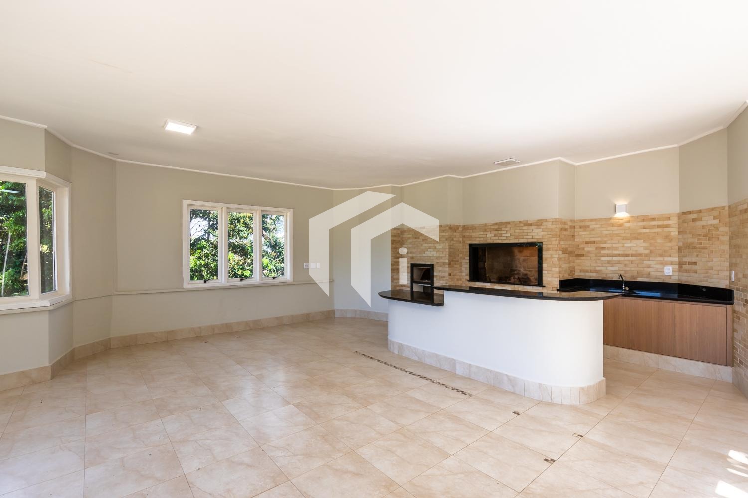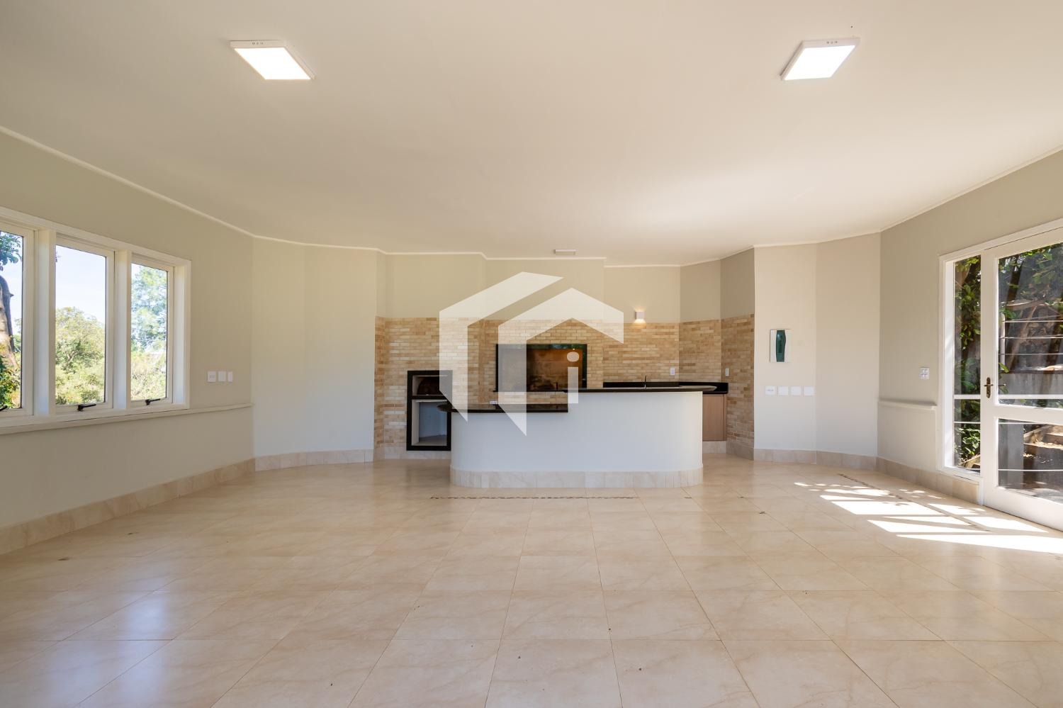 Sala para 4 ambientes com lareira e home theater, lavabo e extensa varanda.