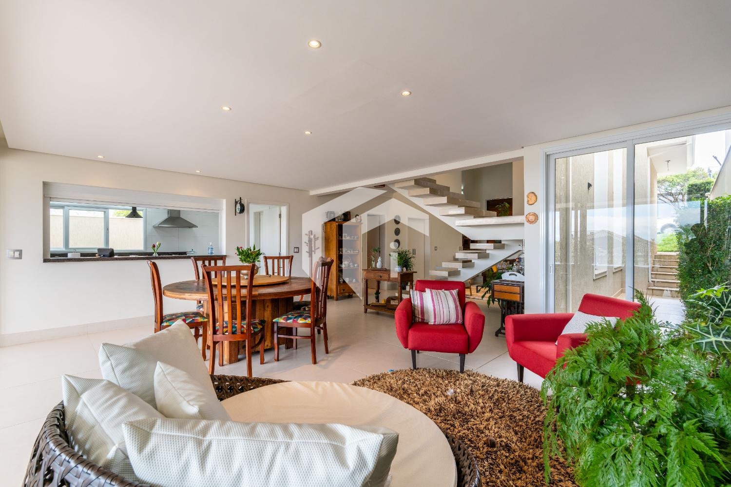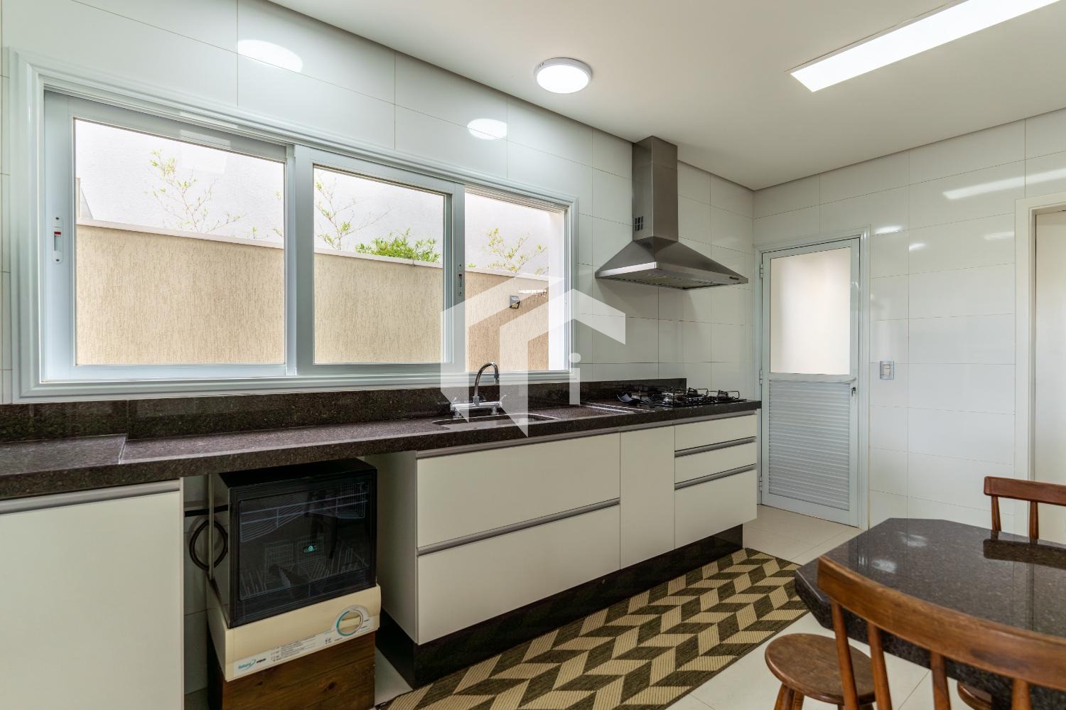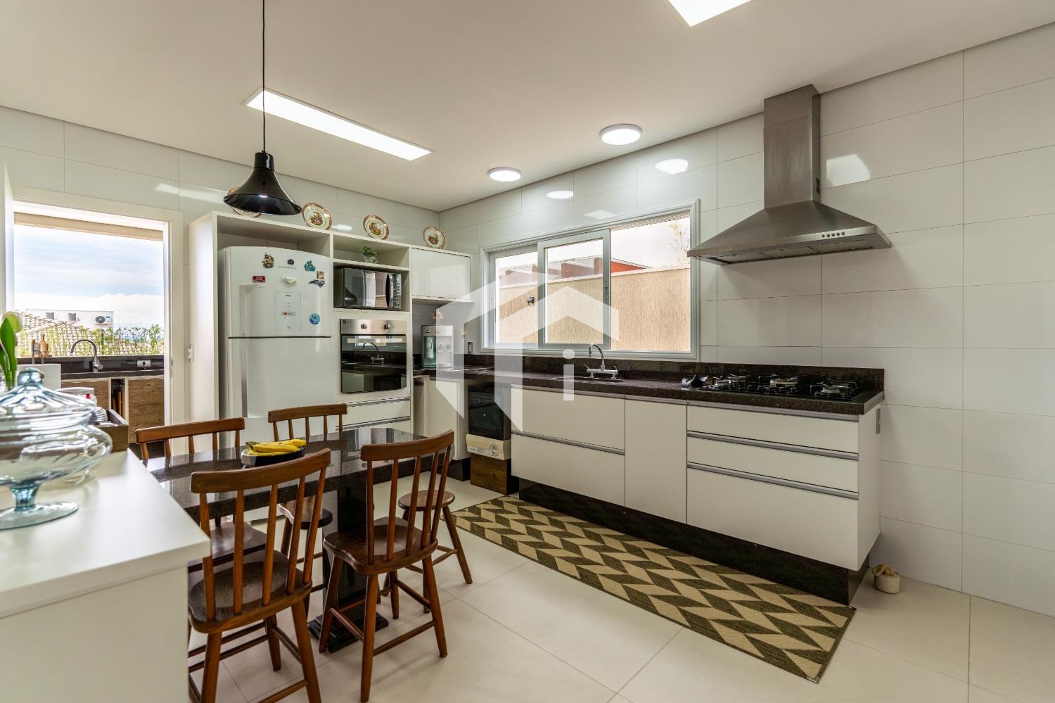 A cozinha é bem equipada, com passa pratos com fechamento automático em alumínio, a cozinha se conecta com à sala de almoço, onde as refeições contemplam todo o visual da área externa.