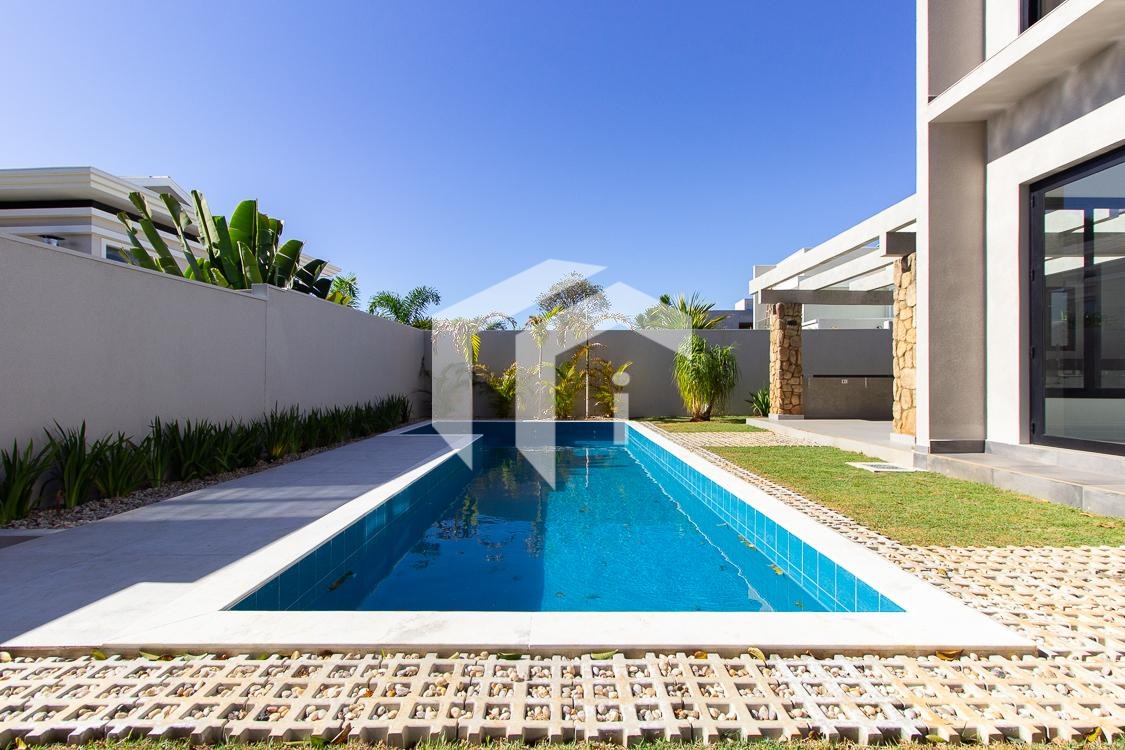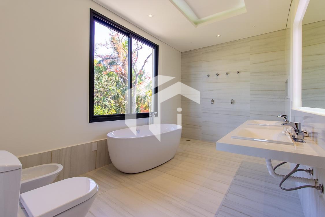 Dispõe de uma suíte térrea acessível, ideal para idosos ou cuidadores, além de espaços versáteis como escritório e áreas de entretenimento. O living amplo se abre para uma sala de estar, sala de jantar com pé-direito duplo, e sala íntima, conectando-se à uma cozinha gourmet espaçosa. A área íntima no piso superior inclui suítes confortáveis, com a Master destacando-se pelo closet amplo e um luxuoso banheiro com cubas e chuveiros duplos, além de uma banheira. A área de lazer é completa com piscina, deck, e banheiro de apoio, garantindo entretenimento e conforto. Completam o imóvel 8 vagas de garagem, evidenciando a praticidade e o luxo dessa propriedade única.