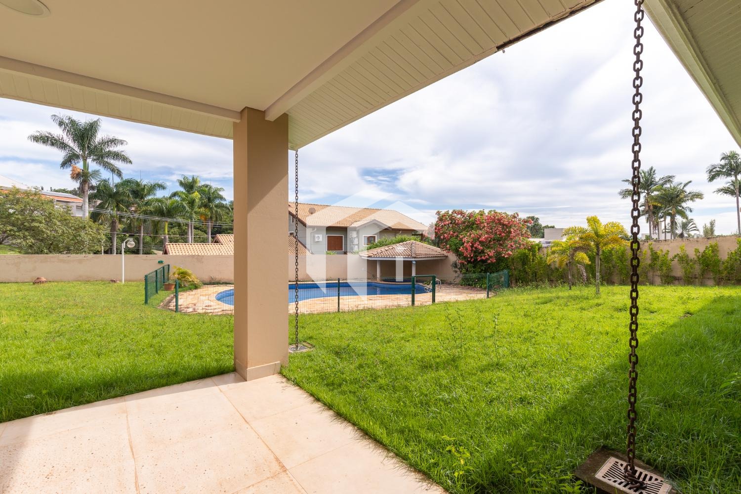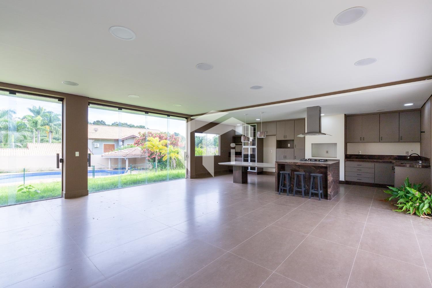 Quintal e piscina com bar.
