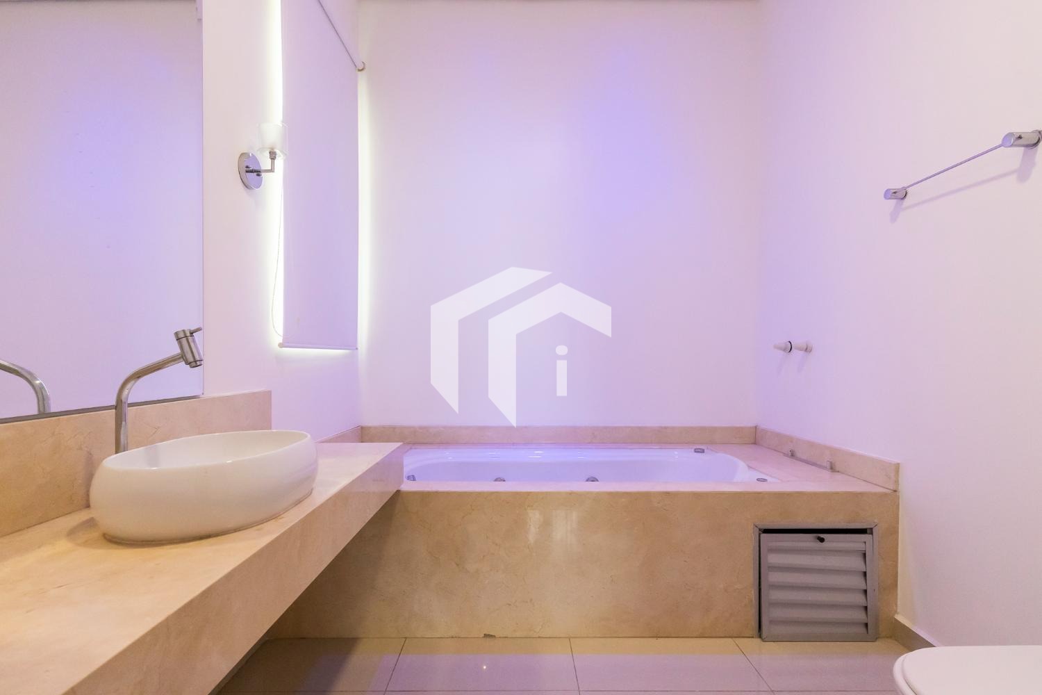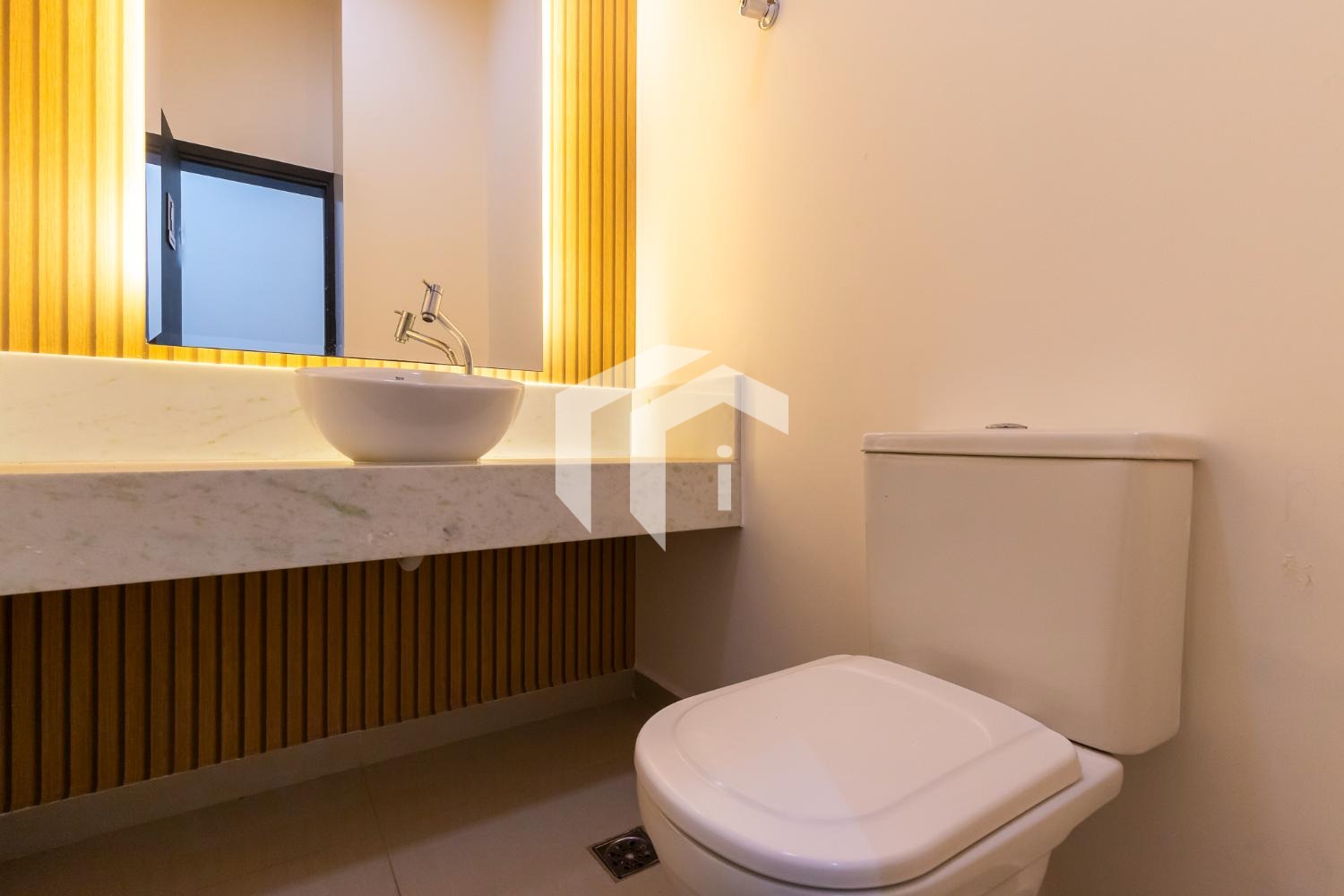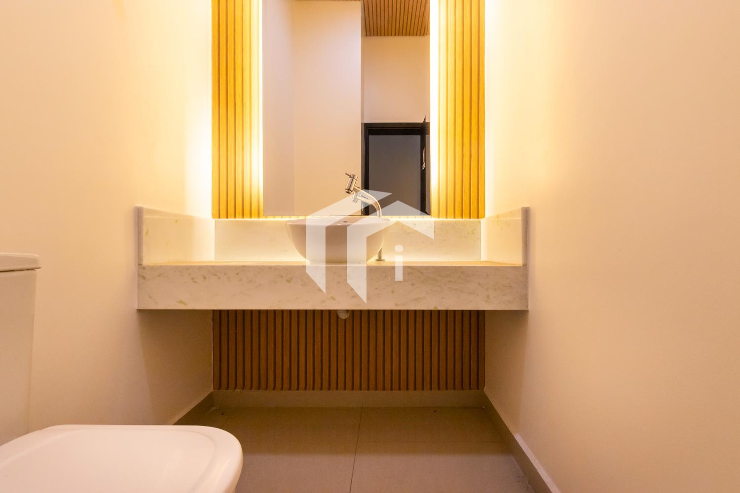 Casa moderna, fachada com amplas janelas, piso porcelanato, ar condicionado, banheiro adaptado.