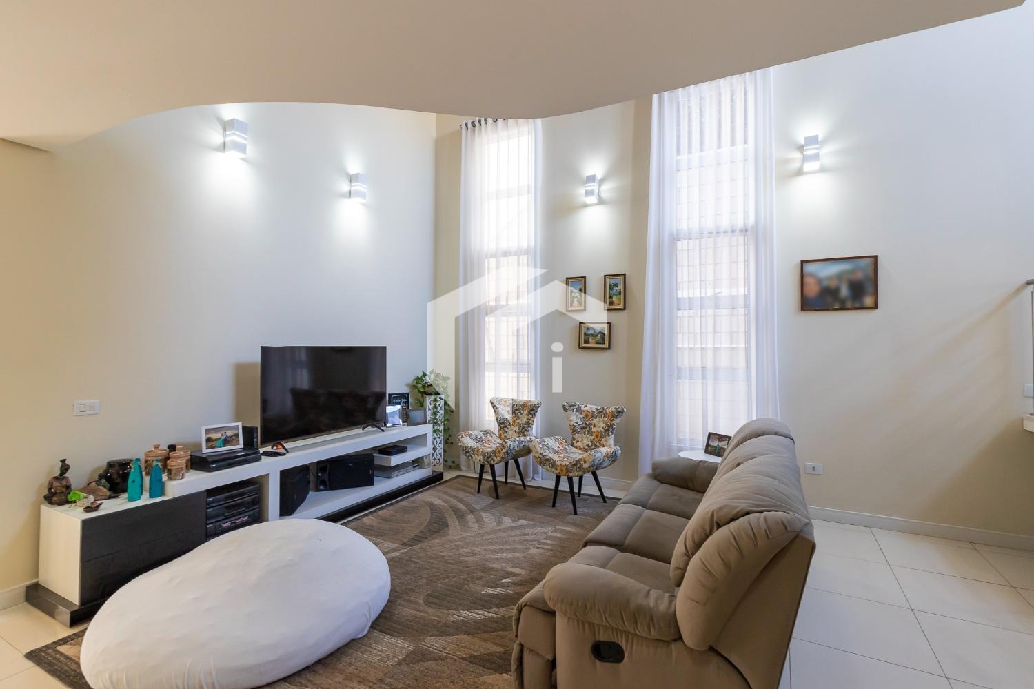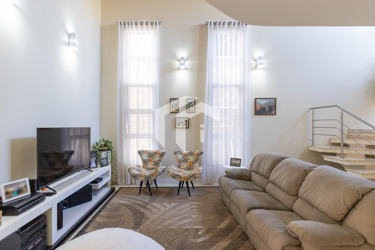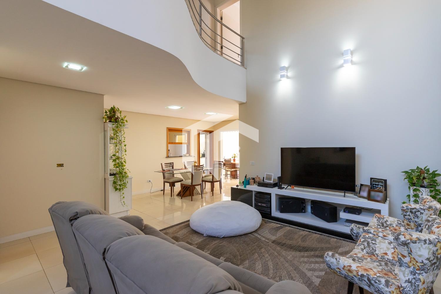O living com pé direito duplo, proporcionando amplitude e sofisticação, perfeito para os dois ambientes.