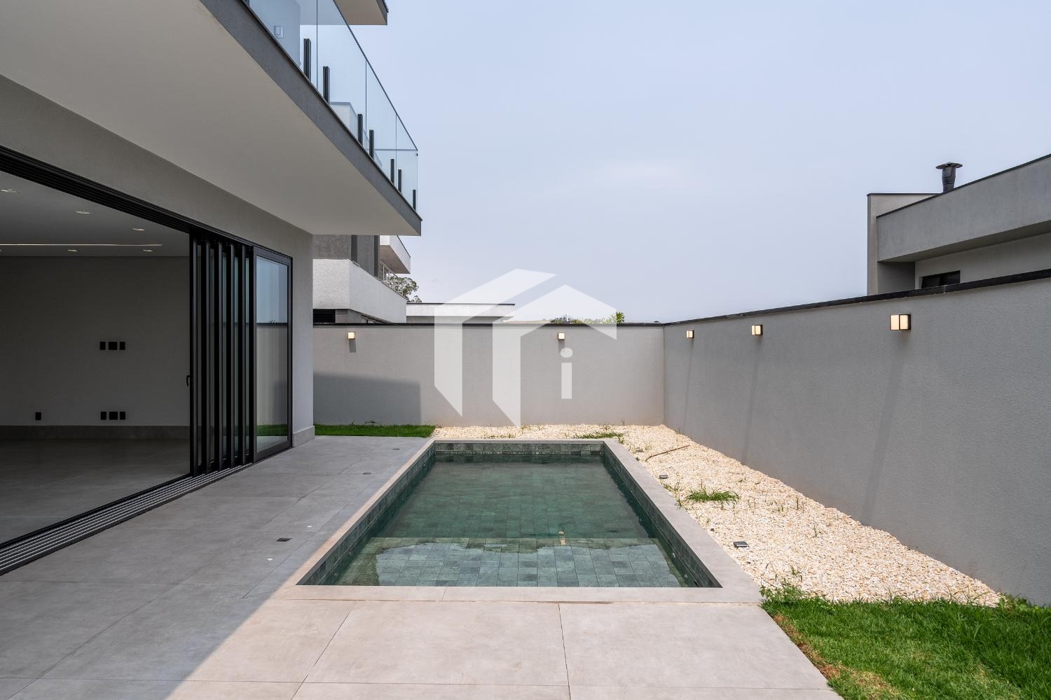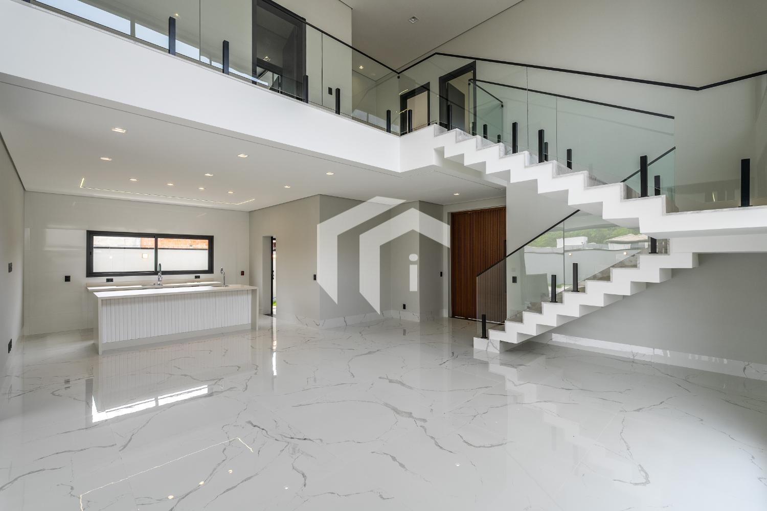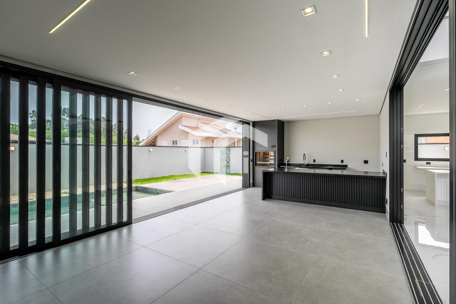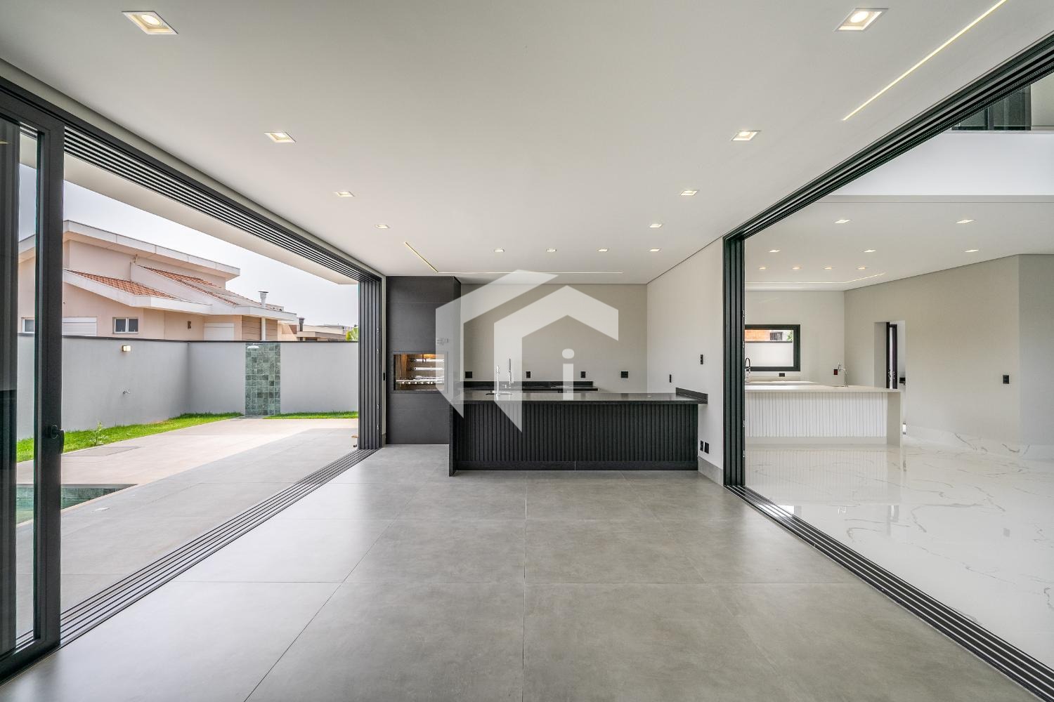 Amplo living com pé direito alto, cozinha com conceito aberto, espaço gourmet integrado com a piscina.
