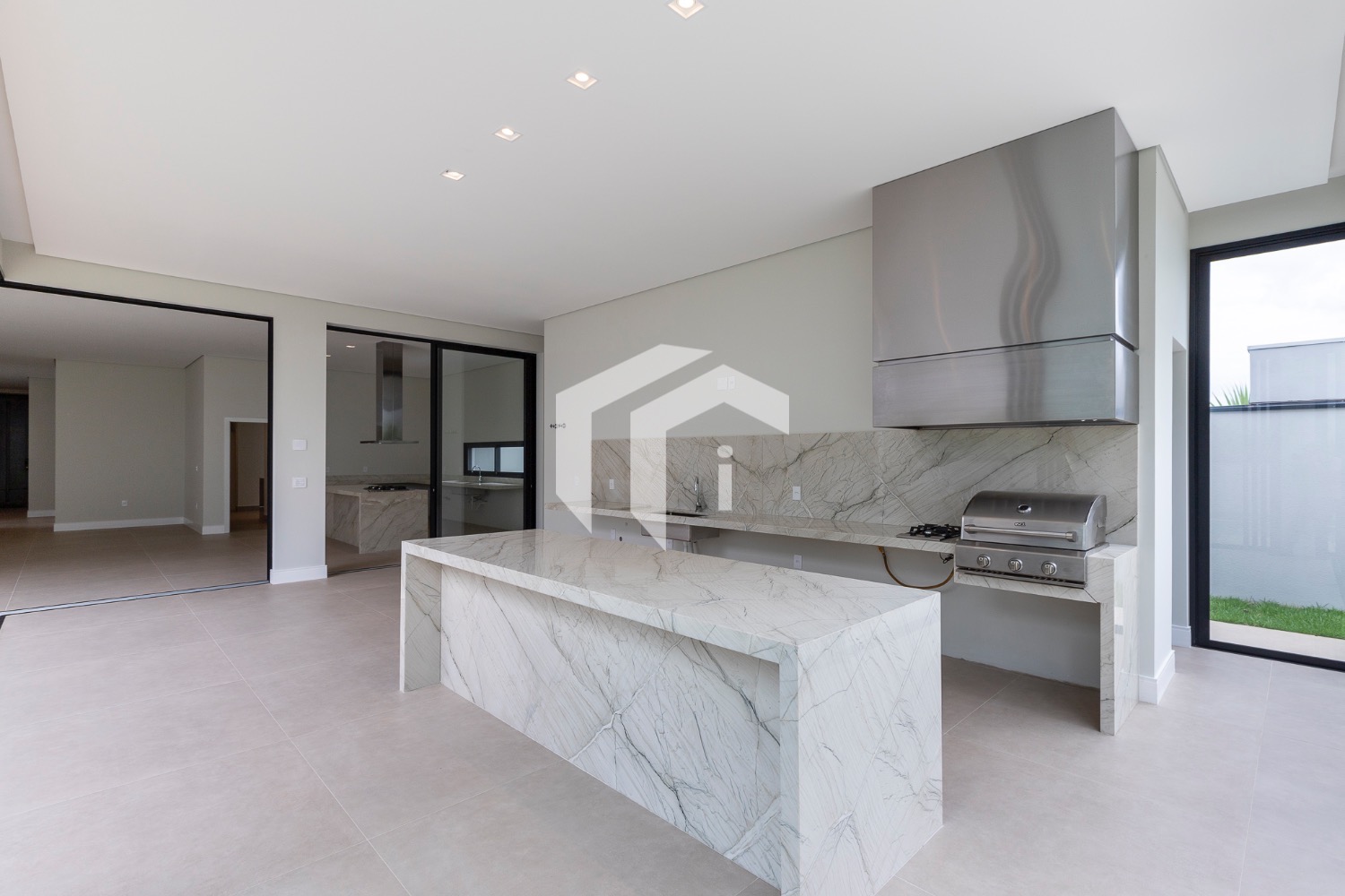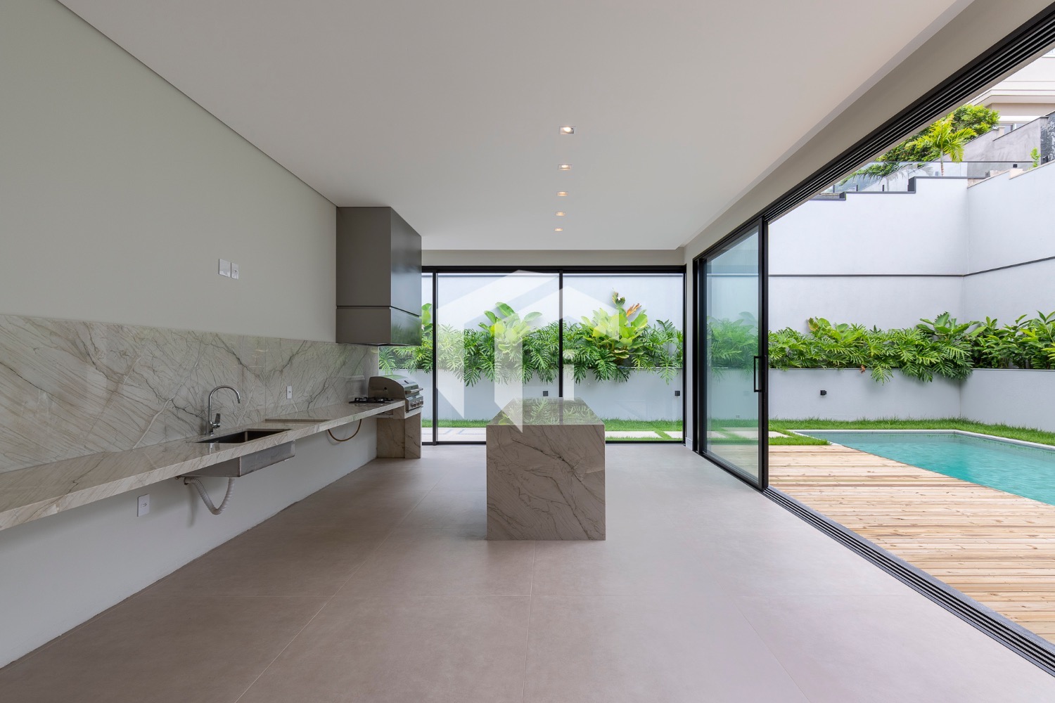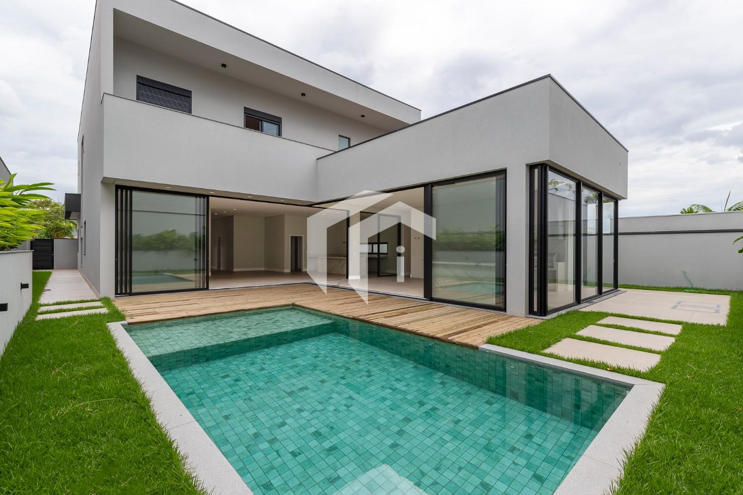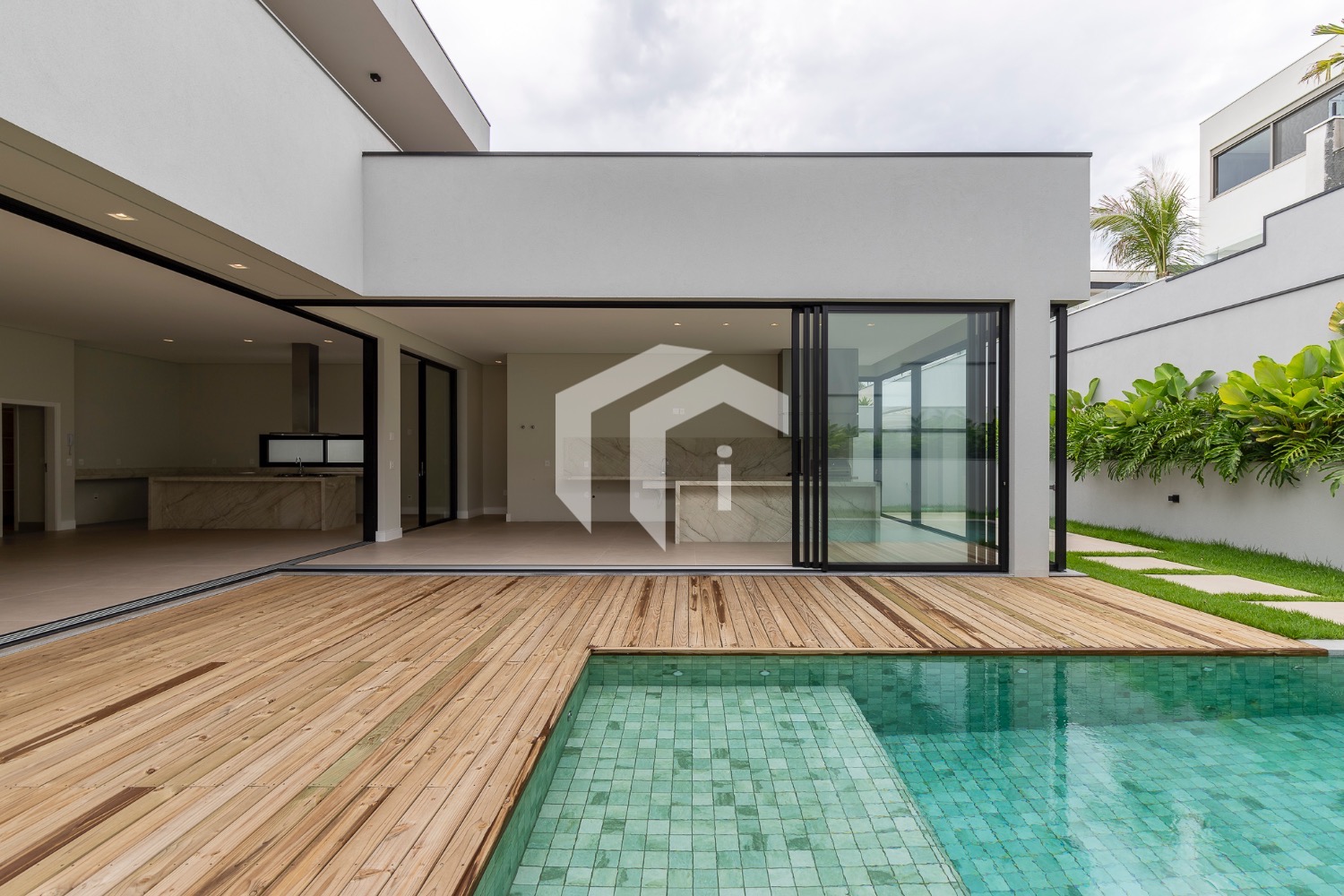 Sobrado de alto padrão com acabamento diferenciado, planta integrada com ambientes amplos. Piso superior com copa de apoio e 4 amplas suítes, todas elas com closet, master com closet e banheiro Sr. e Sra. Piso. No inferior possui escritório (ou suíte térrea), home theater, lavabo, living para 3 ambientes com cozinha integrada, despensa e lavanderia. Varanda gourmet com banheiro de apoio e jardim com piscina. 3 vagas de garagem cobertas.