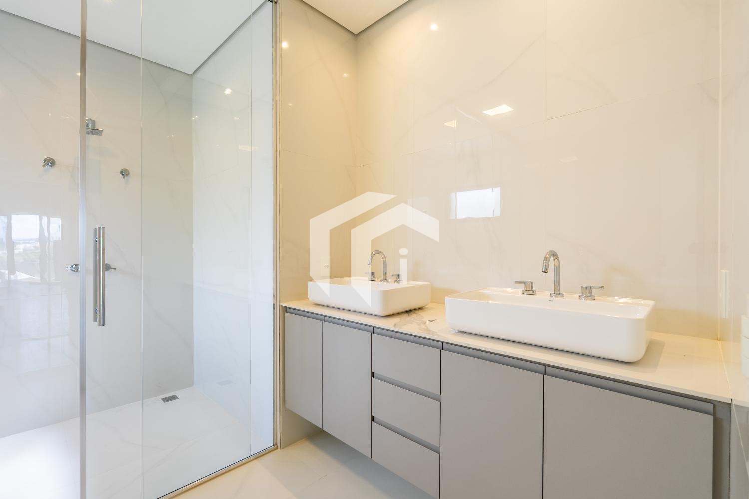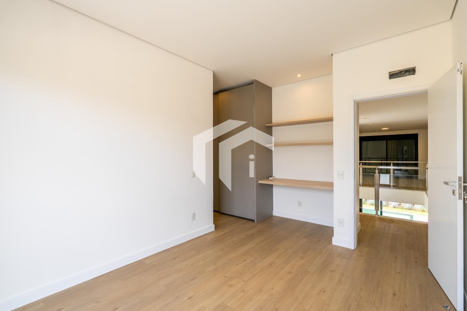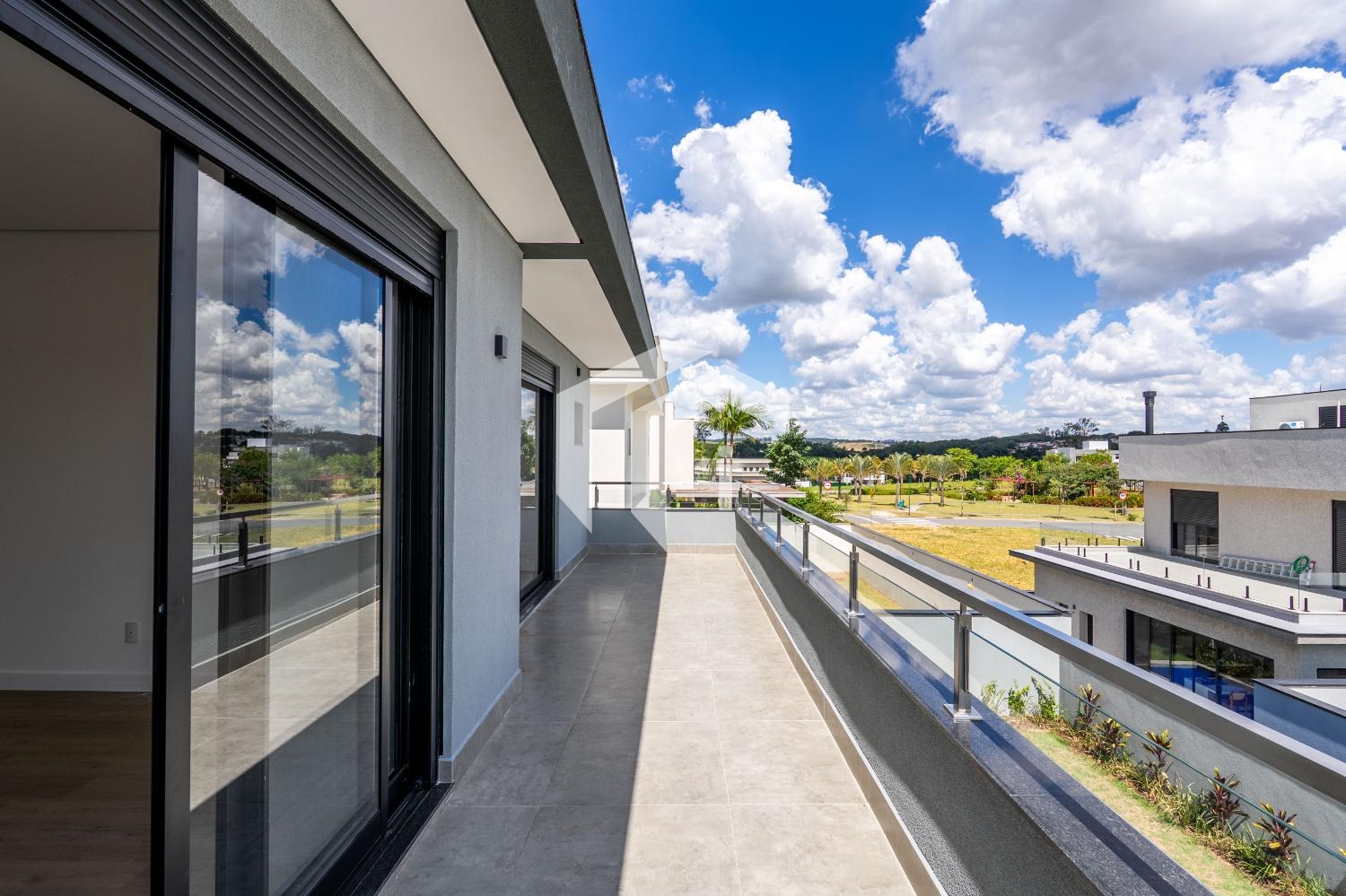 No piso superior, encontram-se três suítes, todas com varanda privativa. Uma delas destaca-se por um amplo closet e um banheiro equipado com cuba dupla e chuveiros independentes, oferecendo um toque de sofisticação.