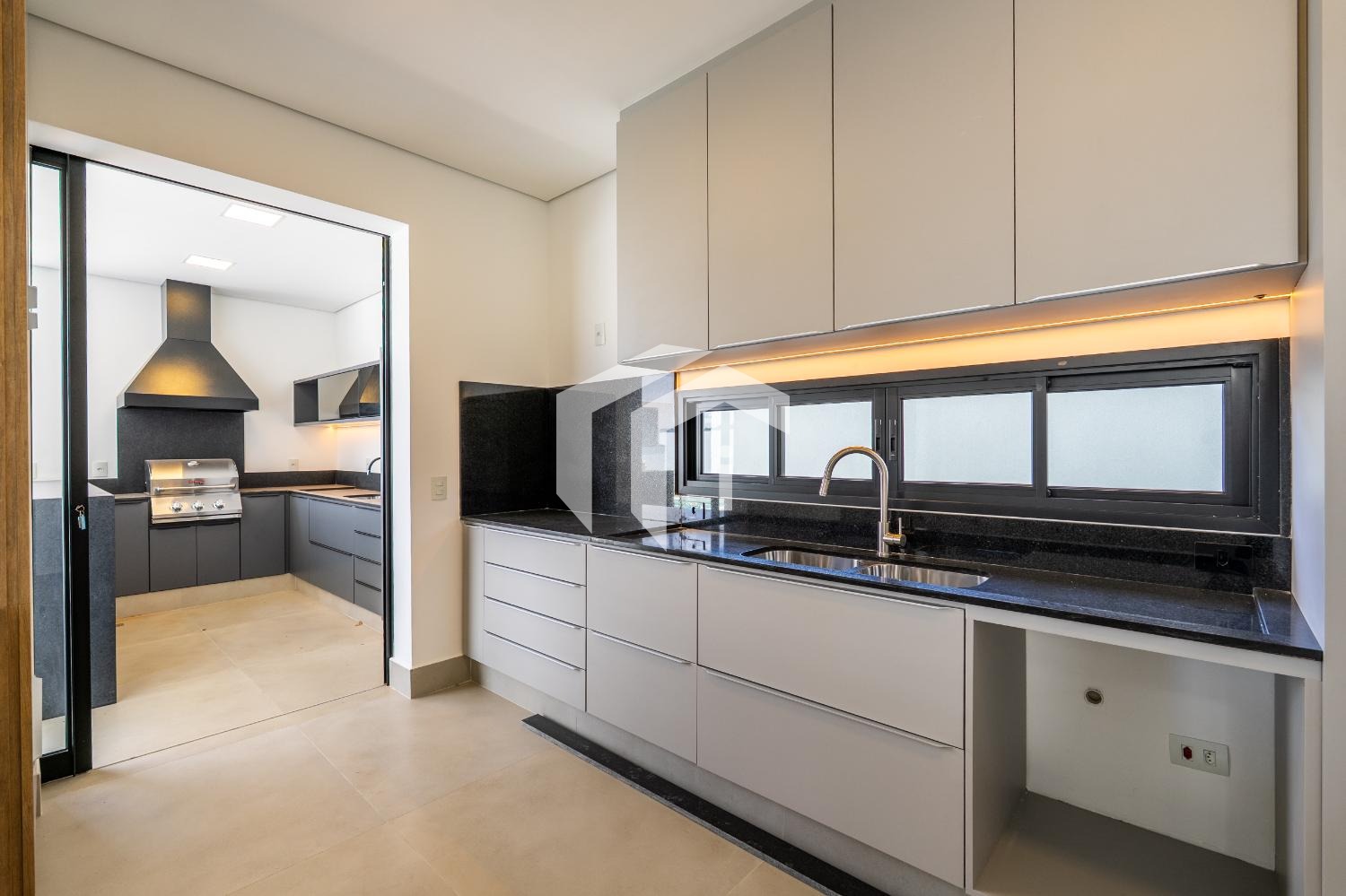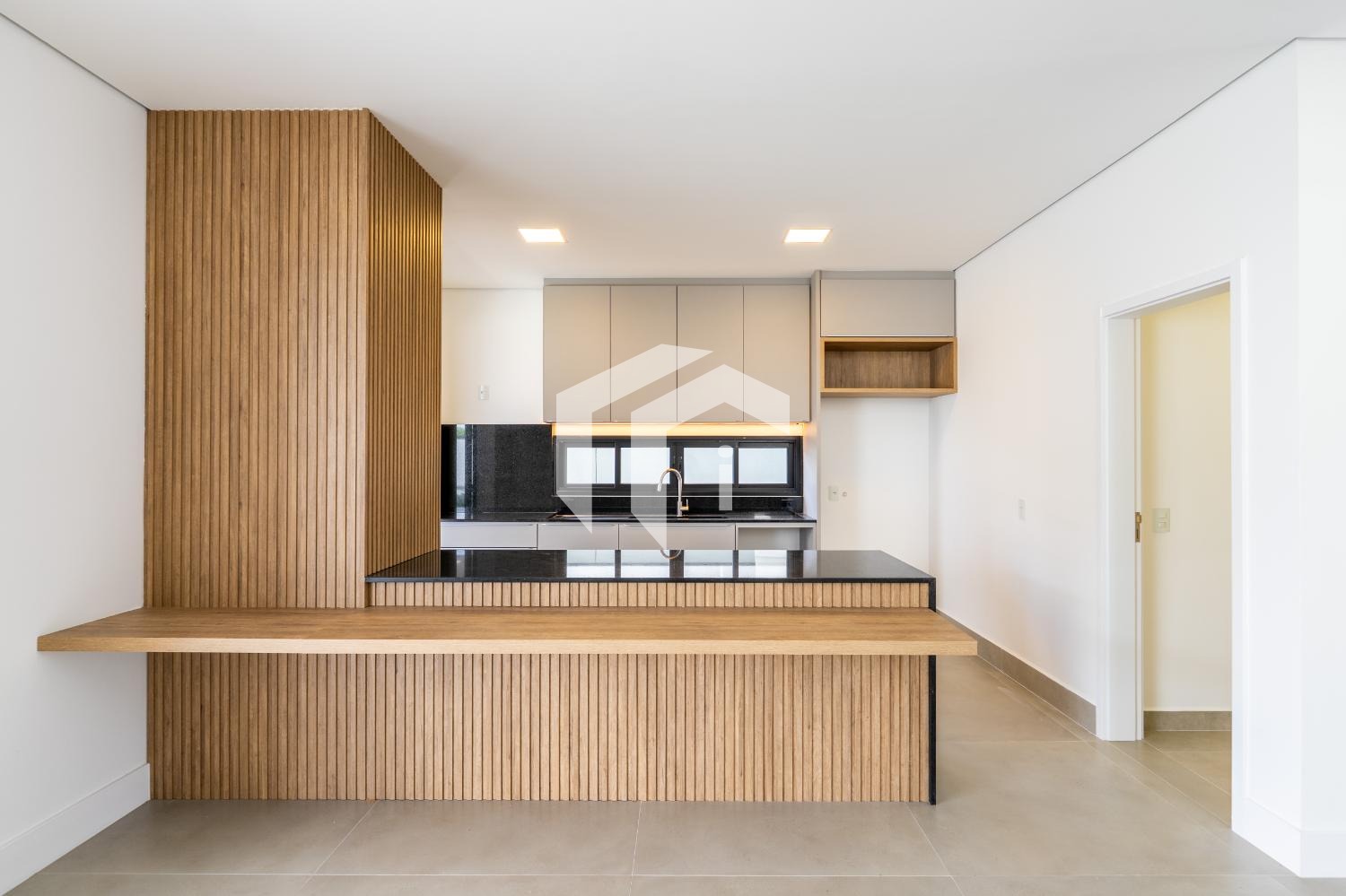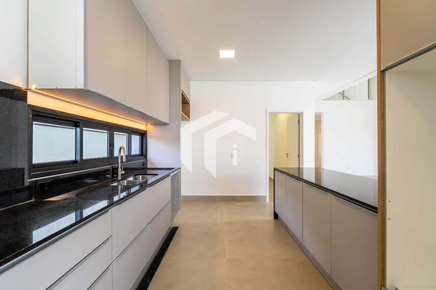A cozinha americana é equipada com armários planejados, despensa prática e área de serviço funcional.