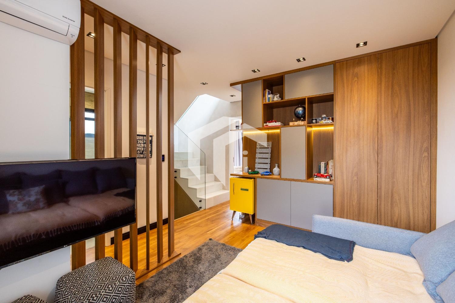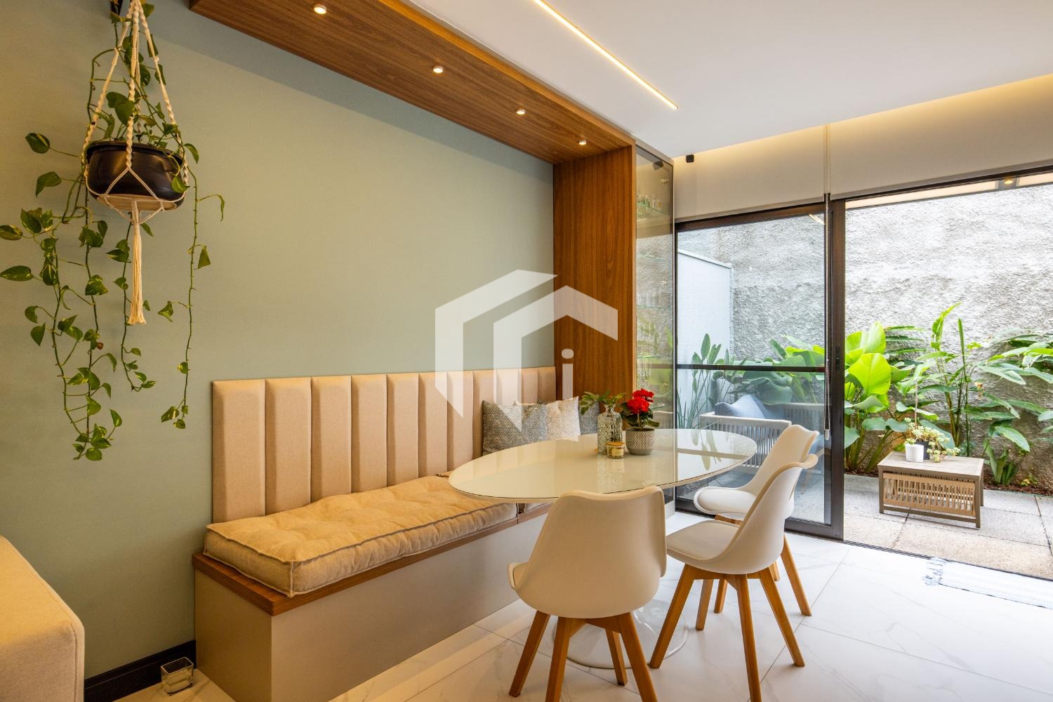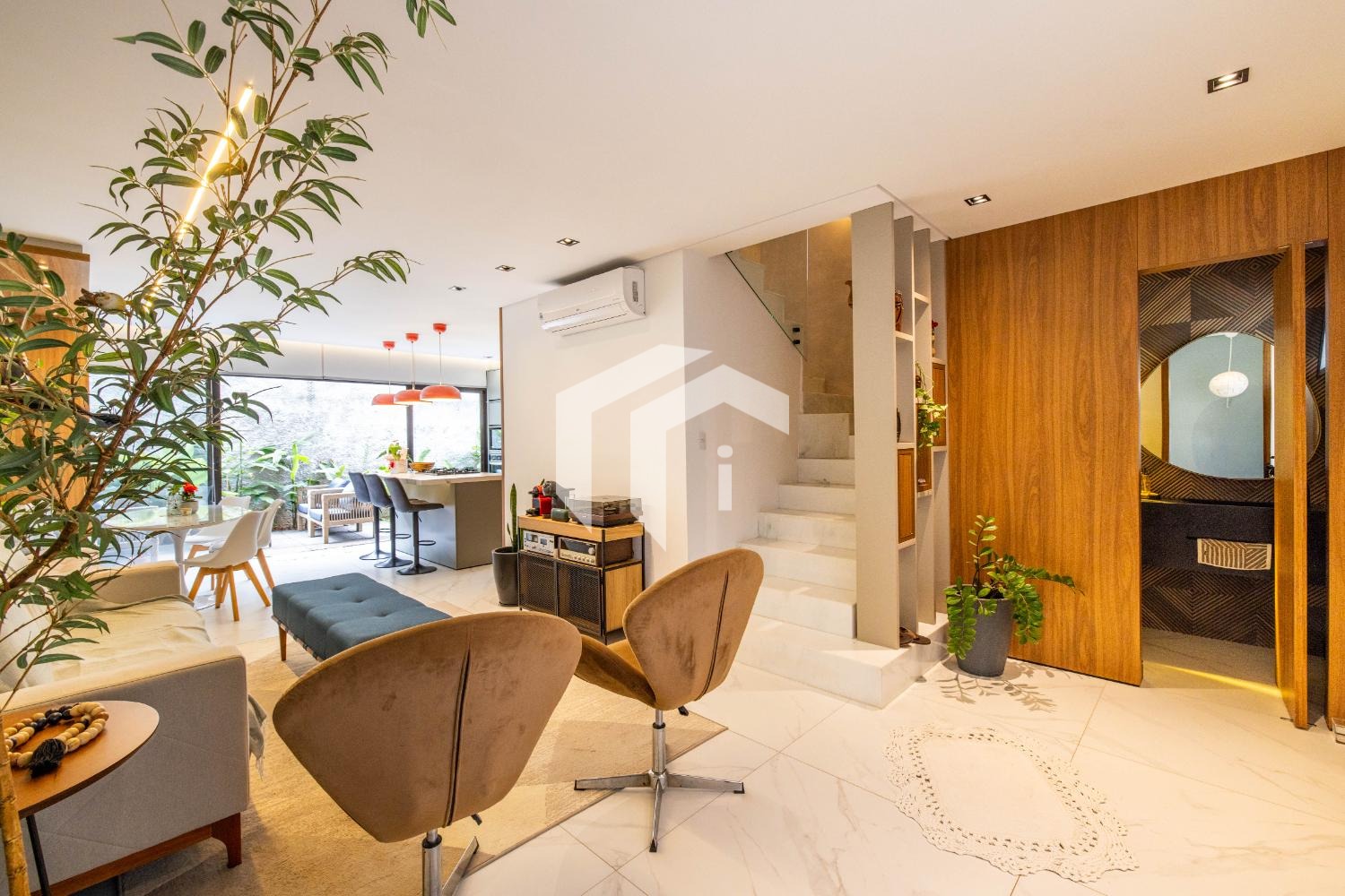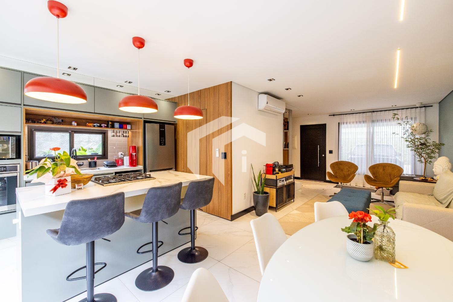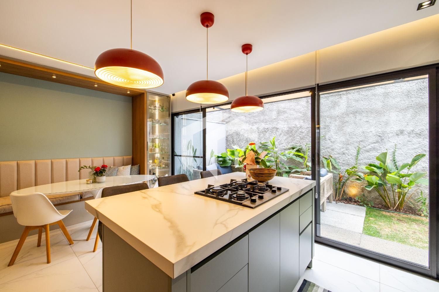 No térreo, você encontra um living integrado à cozinha gourmet com ilha, sala de jantar, estar, lavanderia com despensa e acesso de serviço independente.